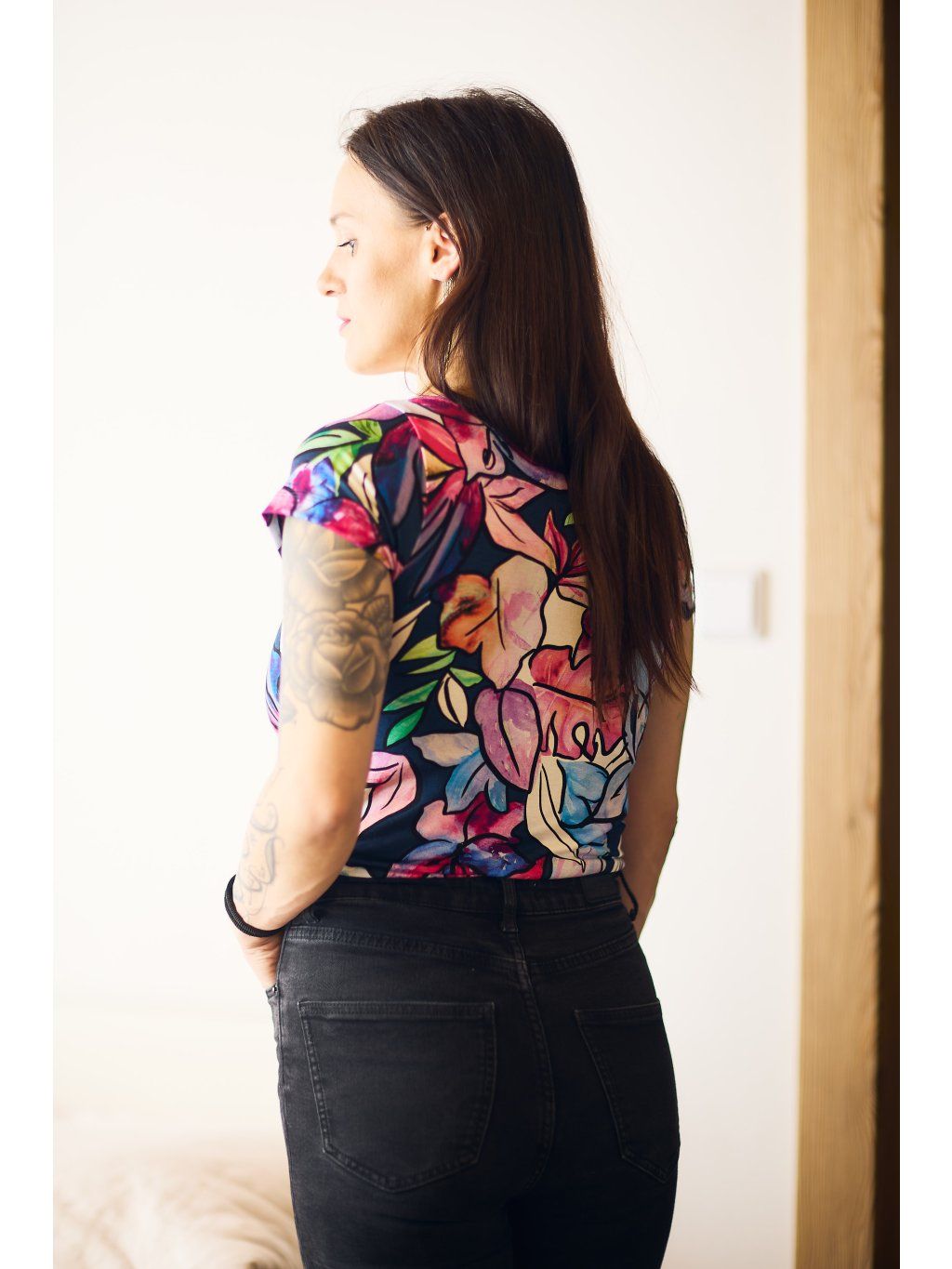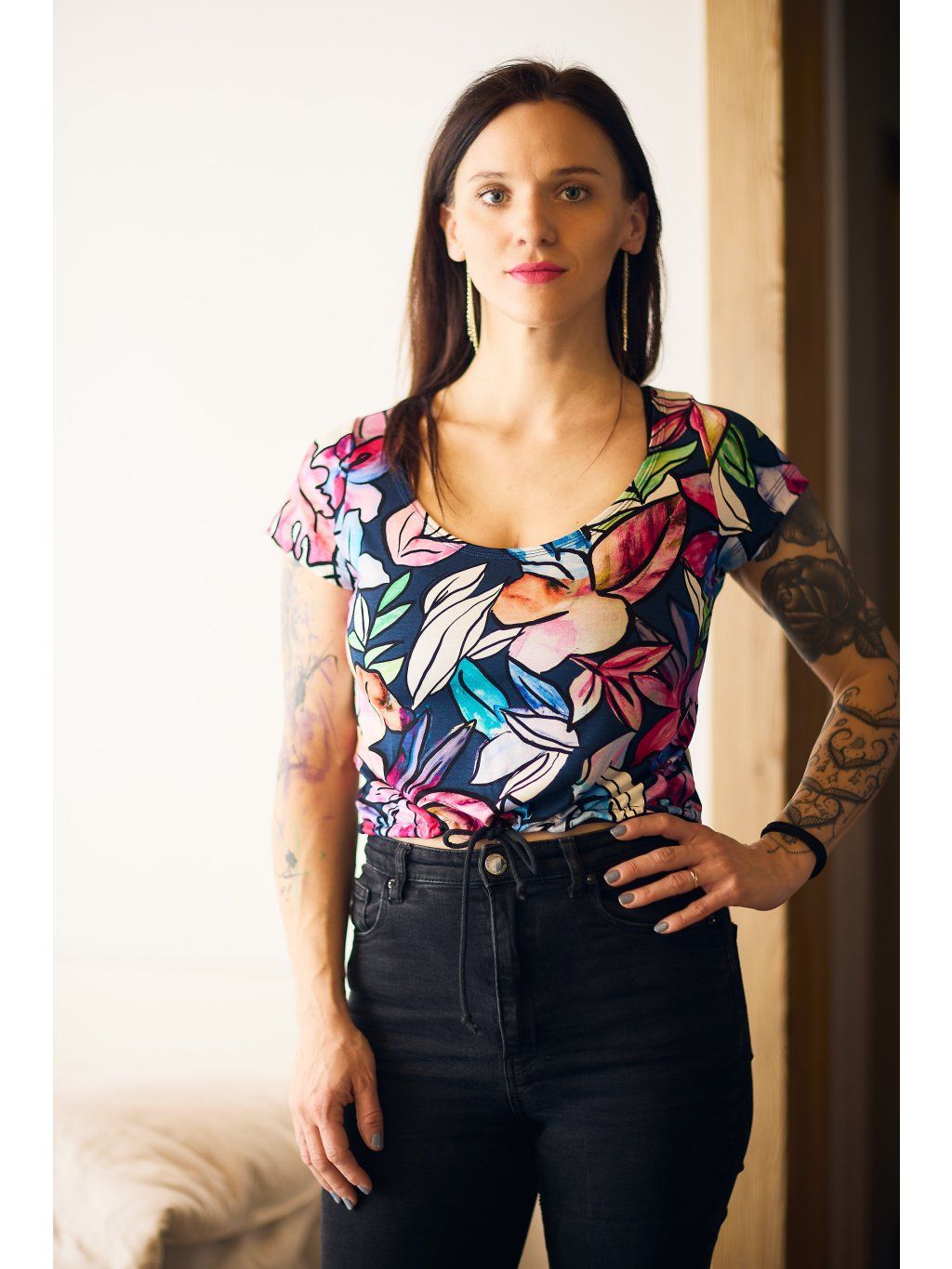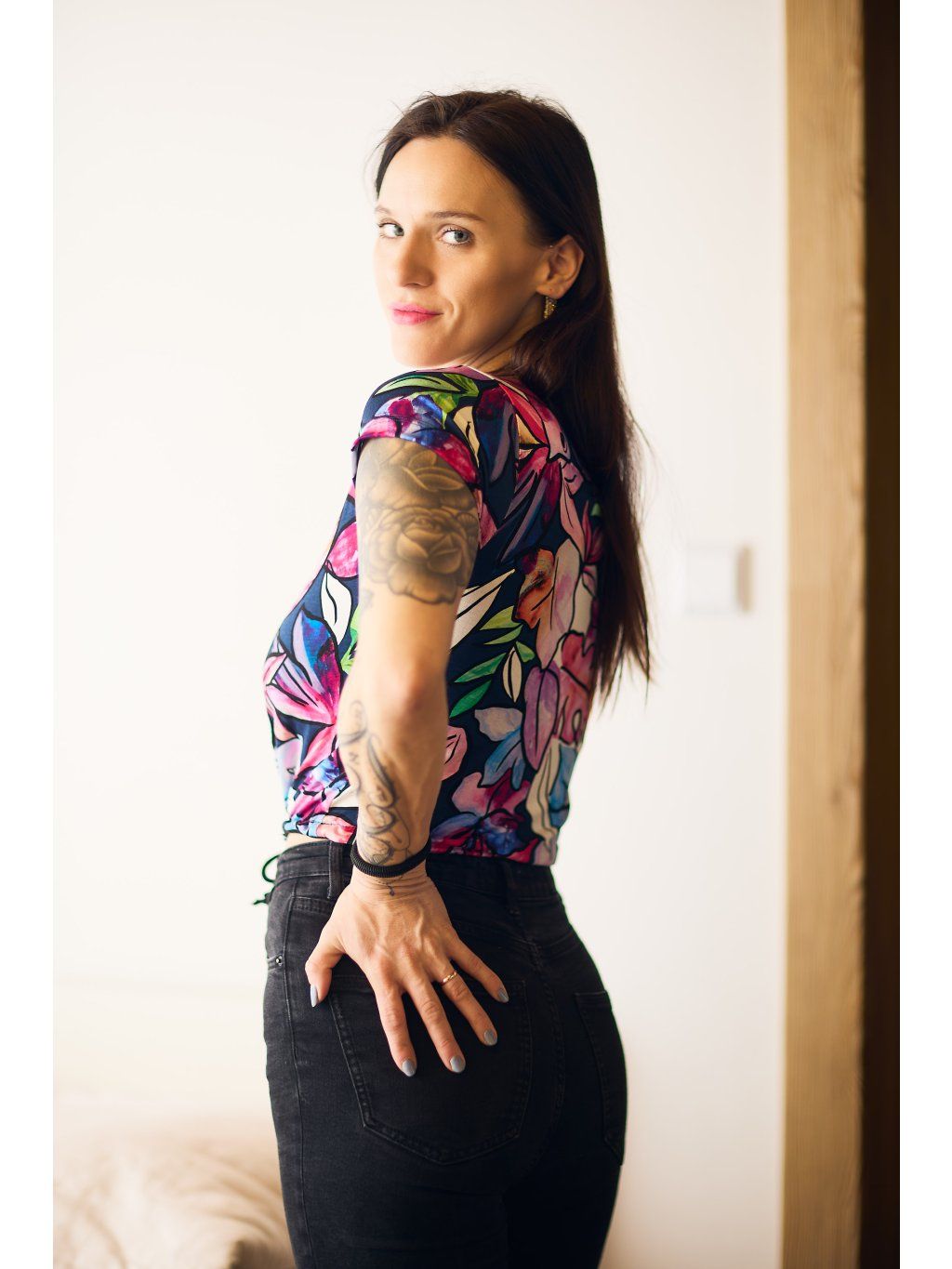 Výrobek sedí hezky natělo, pokud chcete střih trochu volnější, volte větší velikost.