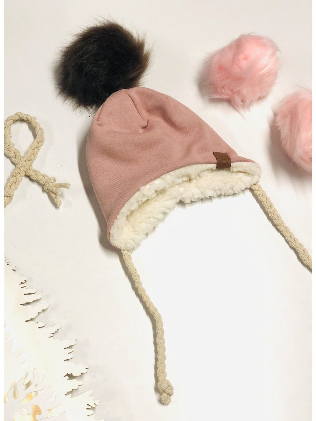 Čepice jsou přes uši a mají dva copánky na zavázání. K čepici je možné došít bambuli o průměru 13 cm. Horní materiál je teplákovina bavlna/elastan, vespod je bílý beránek. Čepice má tedy 2 vrstvy.