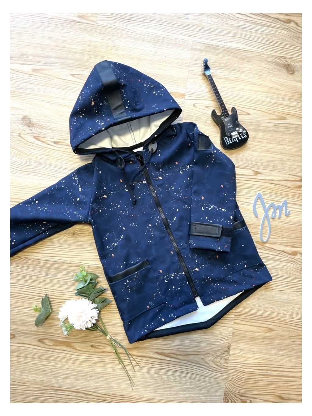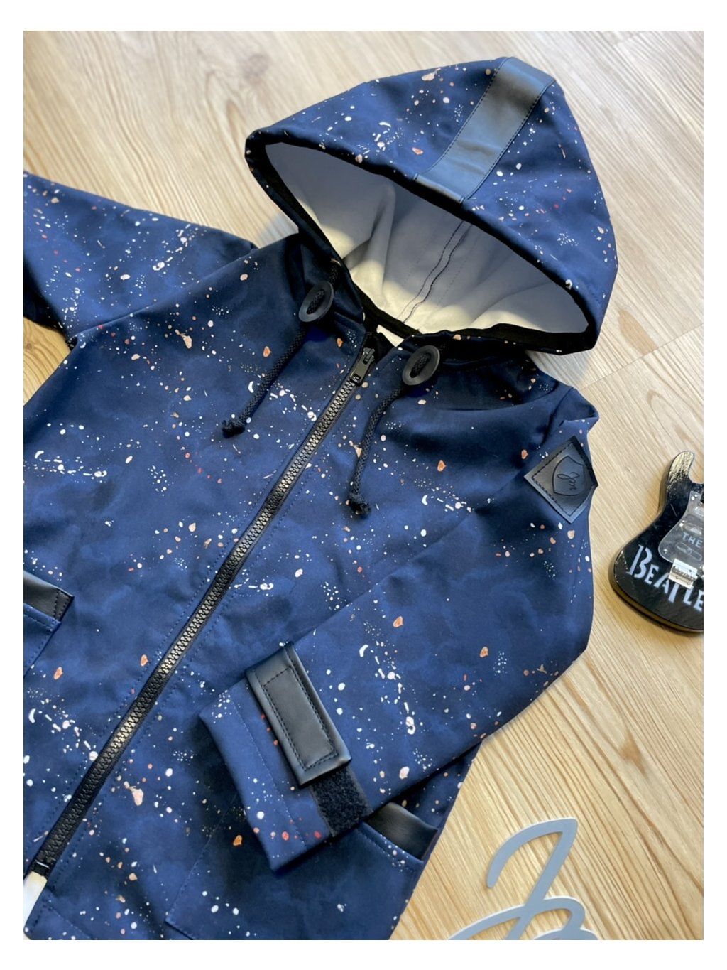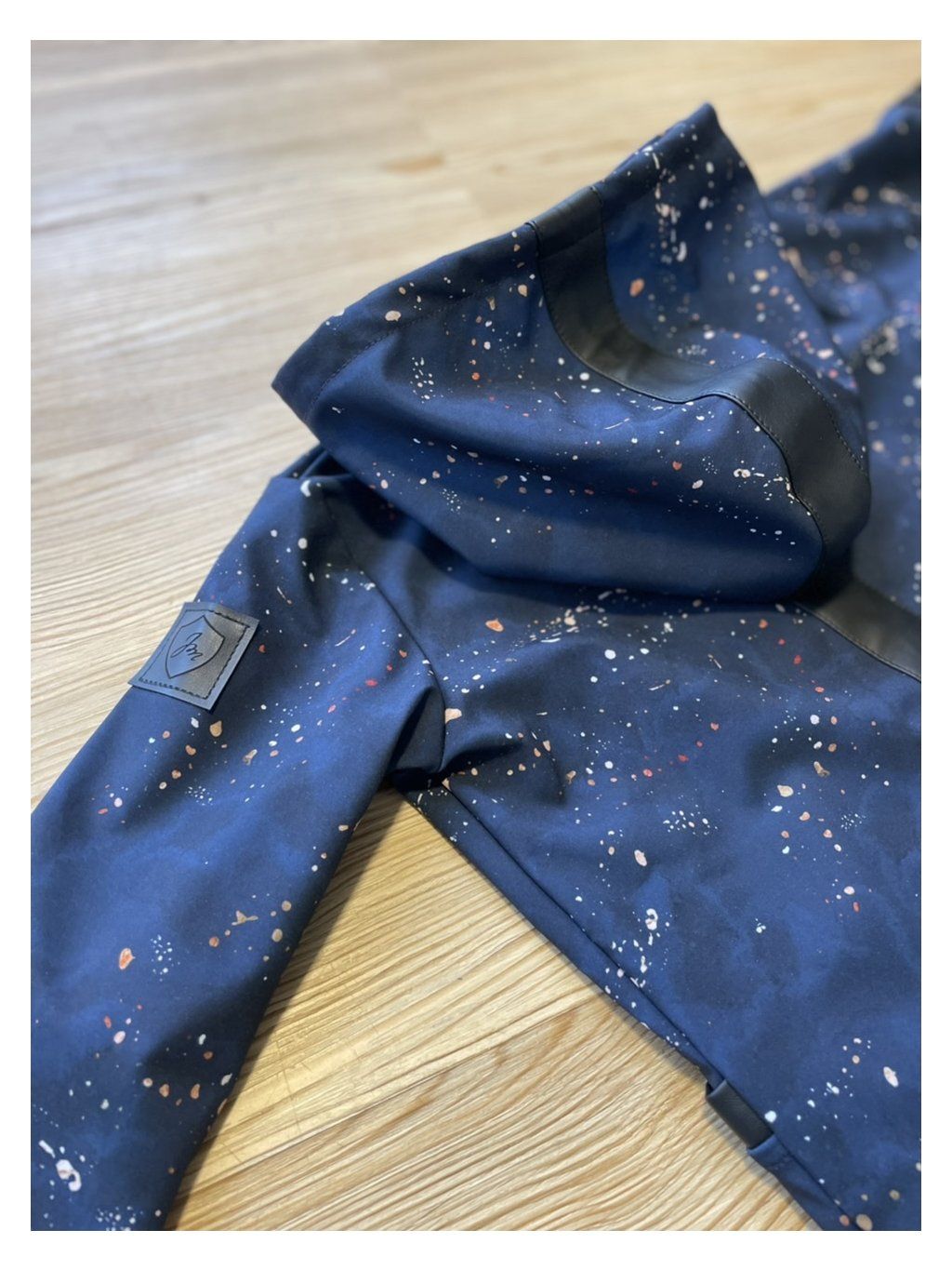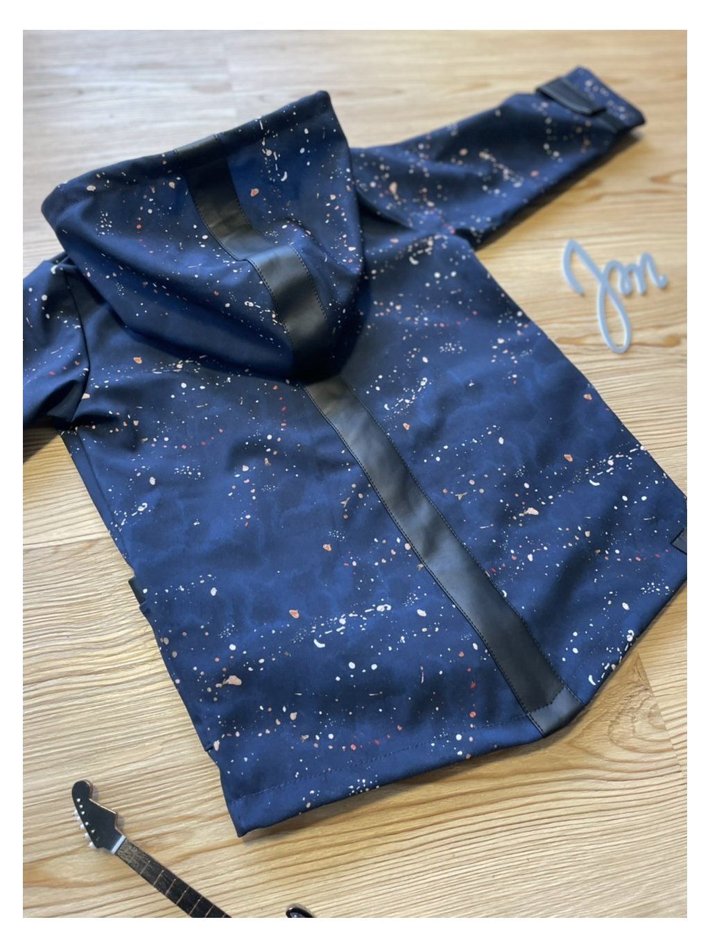 Vpředu je na zip s kapsami lemovanými černou koženkou. Barva softshellu je hladká modrá s barevnými cákanci. Přes celou zadní část bundy je našitý pruh z černé koženky. Bunda se dá nosit na jaře, na podzim i v zimě.