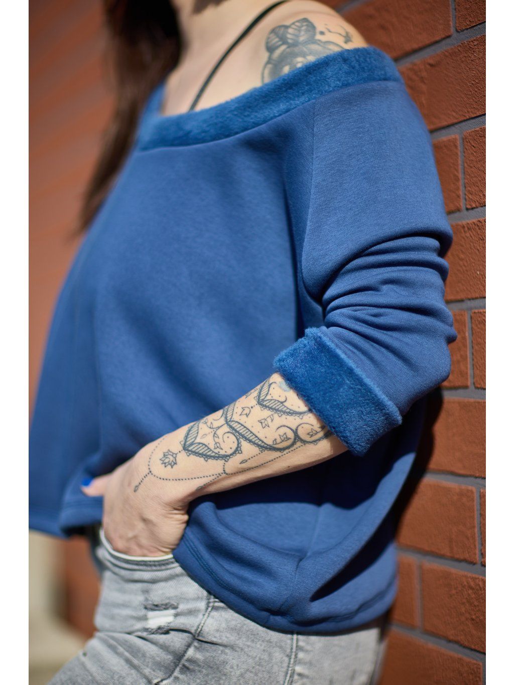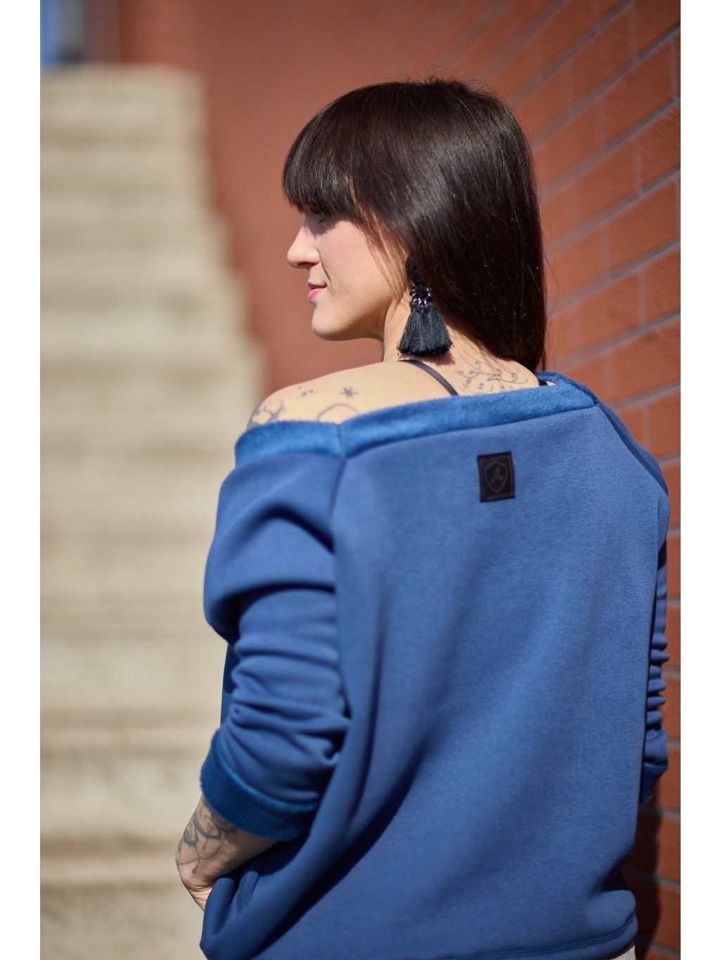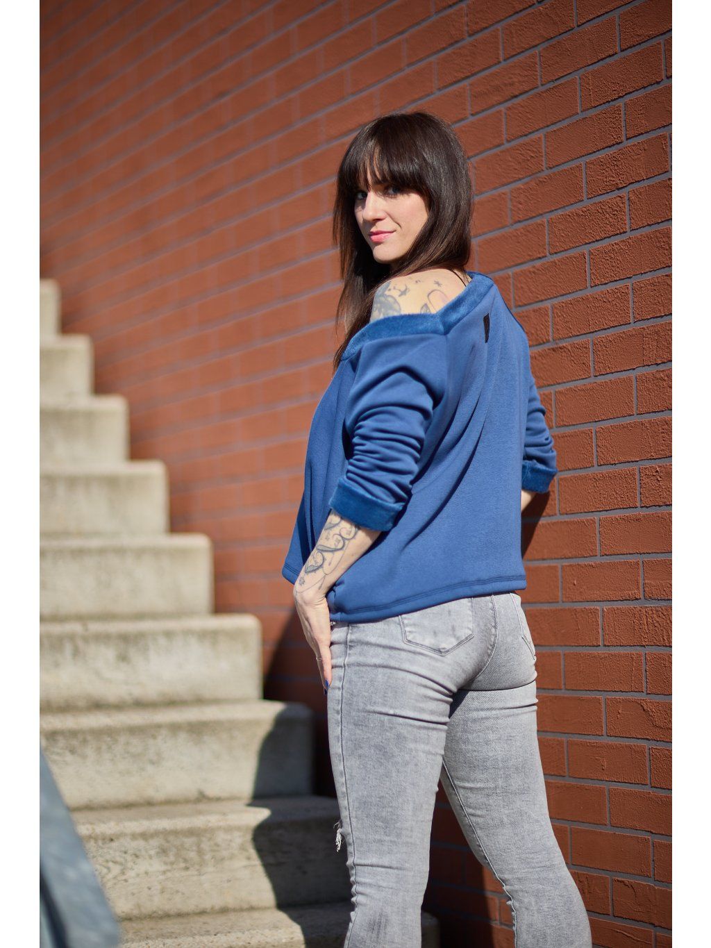 Krátká mikina se spadlým ramenem. Material je modrý warmkeeper s elastanem. Rukávy jsou na ohrnutí.