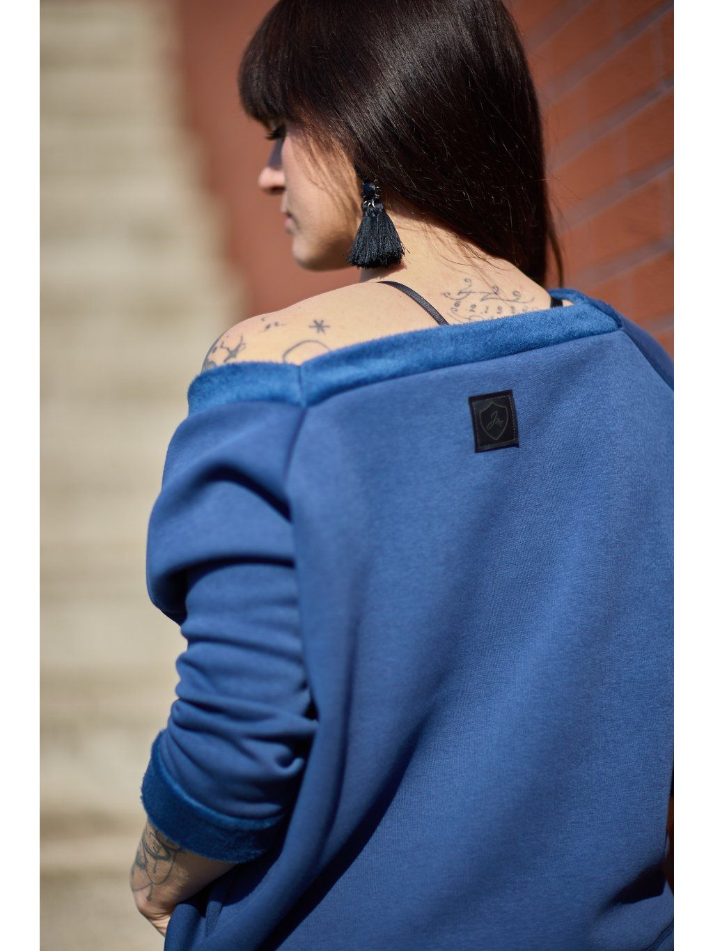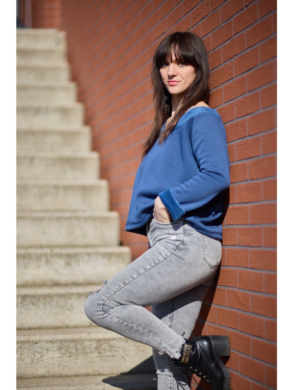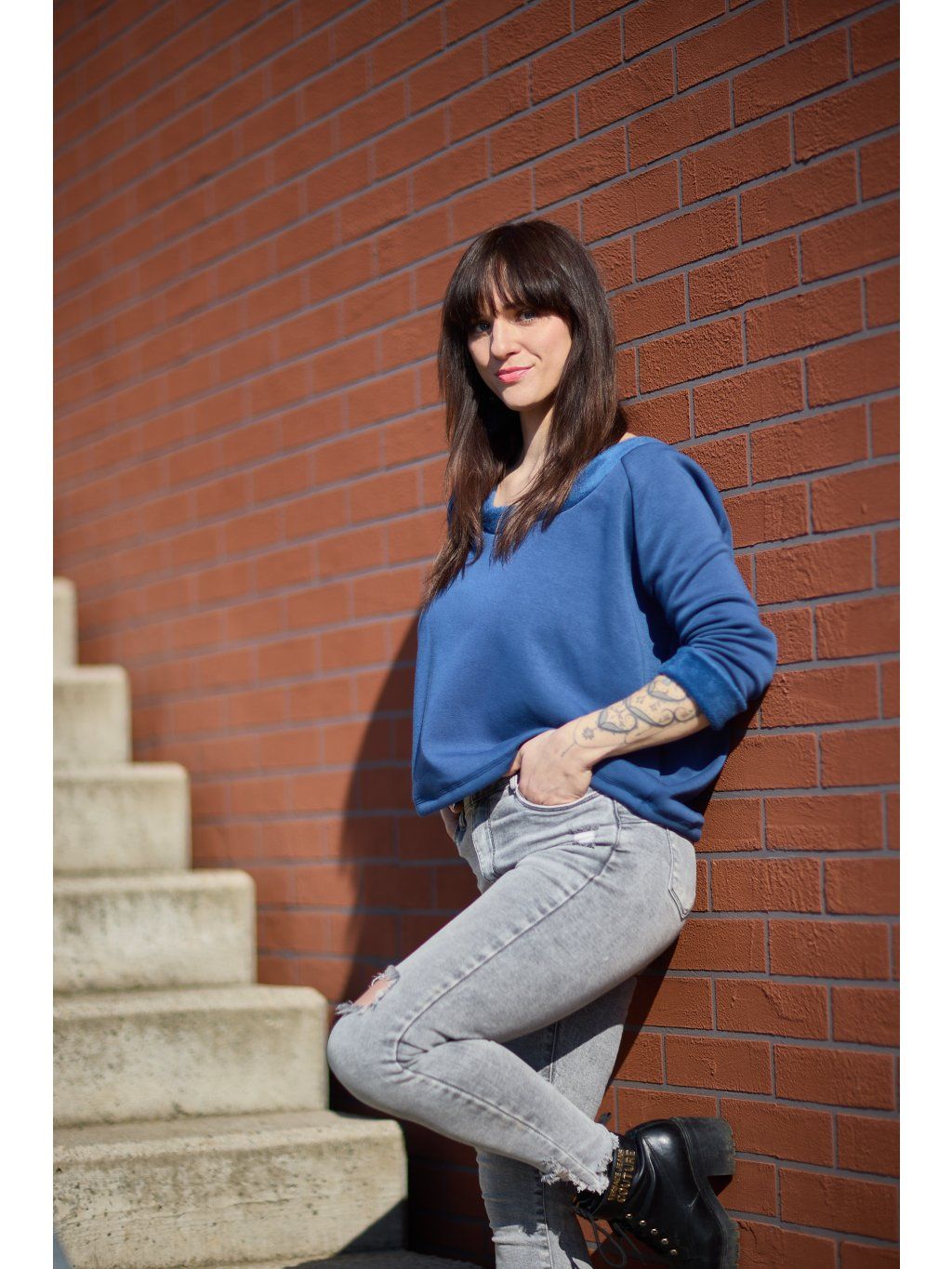 Krátká mikina se spadlým ramenem. Material je modrý warmkeeper s elastanem. Rukávy jsou na ohrnutí.