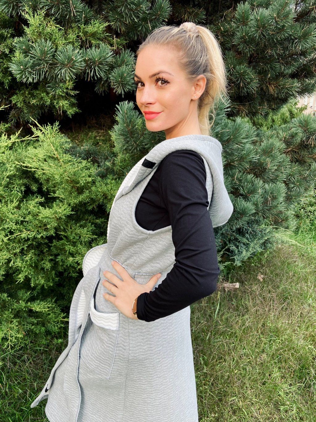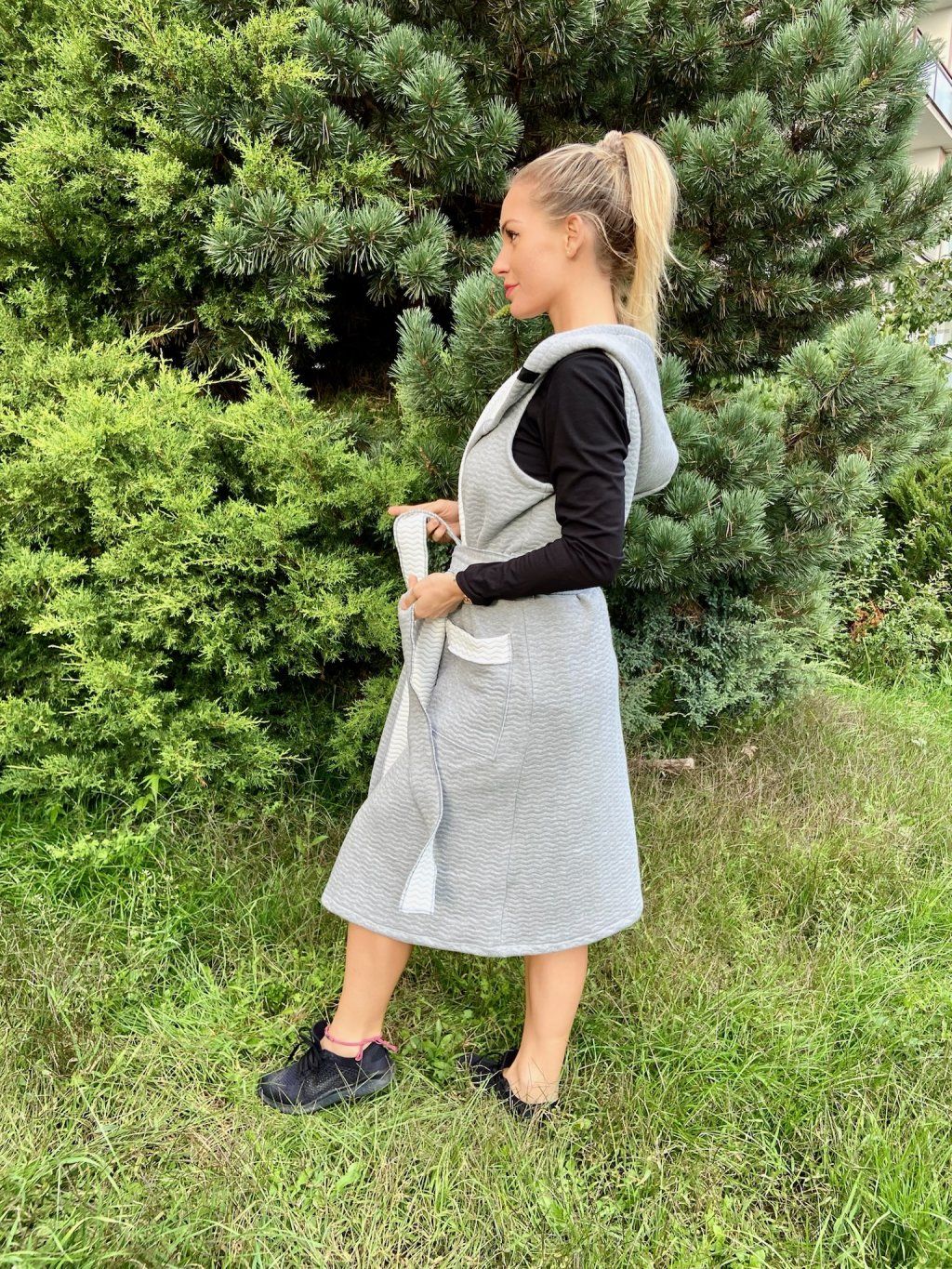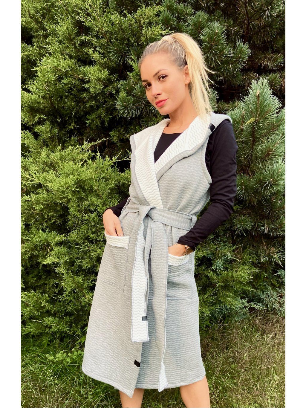 Jarní/podzimní vesta je ušita z 2 barevného materiálu. Uvnitř je krémová, zvenku šedá a je prošívaná vlnkovaně. Vesta má velkou kapuci. Ke kabátu je ve stejných barvách pásek.