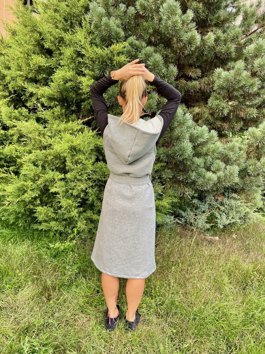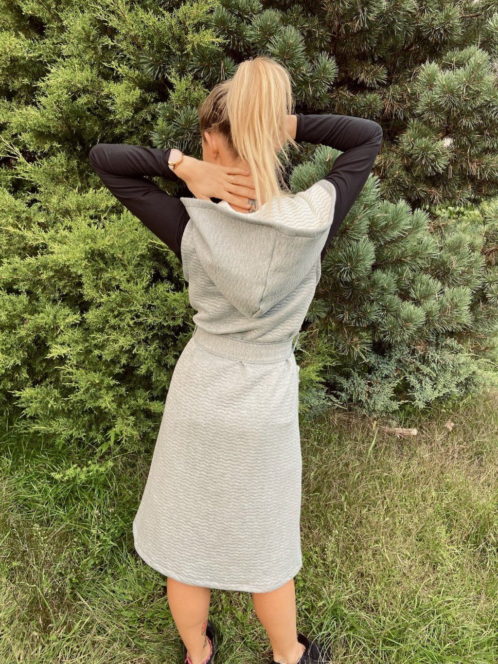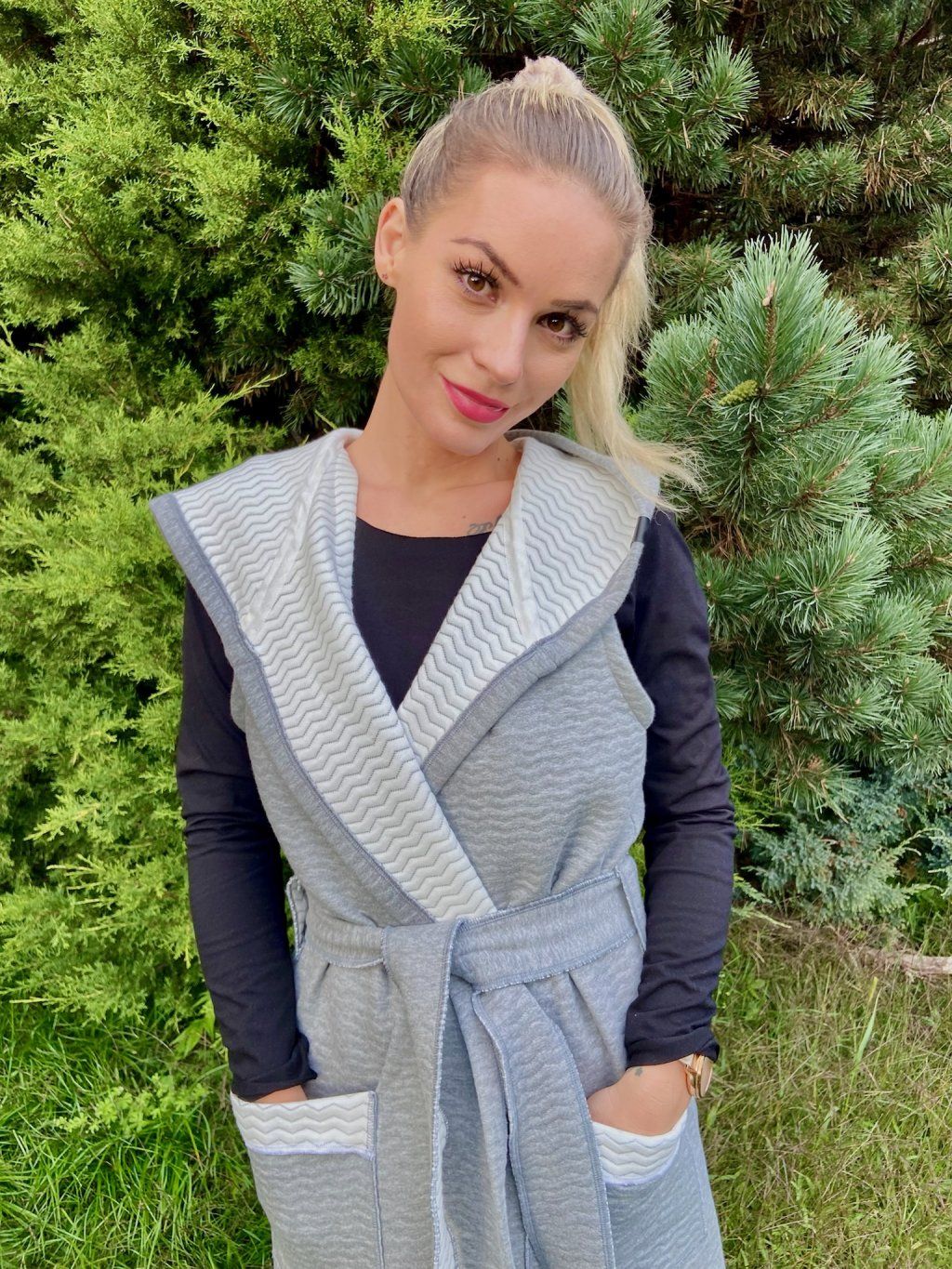 Jarní/podzimní vesta je ušita z 2 barevného materiálu. Uvnitř je krémová, zvenku šedá a je prošívaná vlnkovaně. Vesta má velkou kapuci. Ke kabátu je ve stejných barvách pásek.