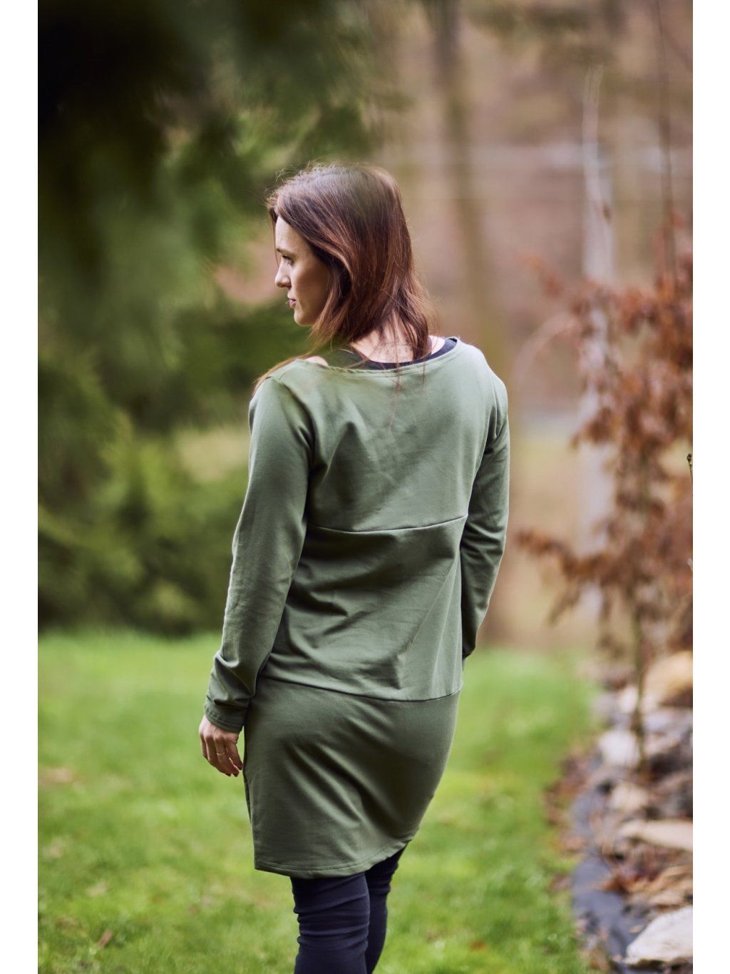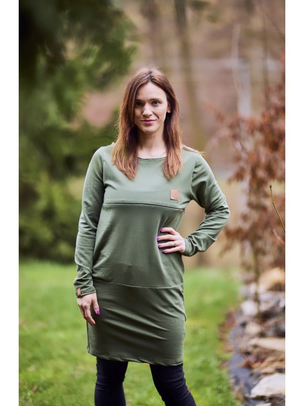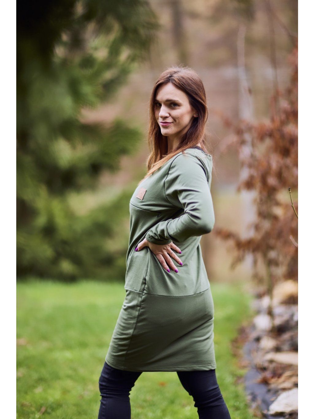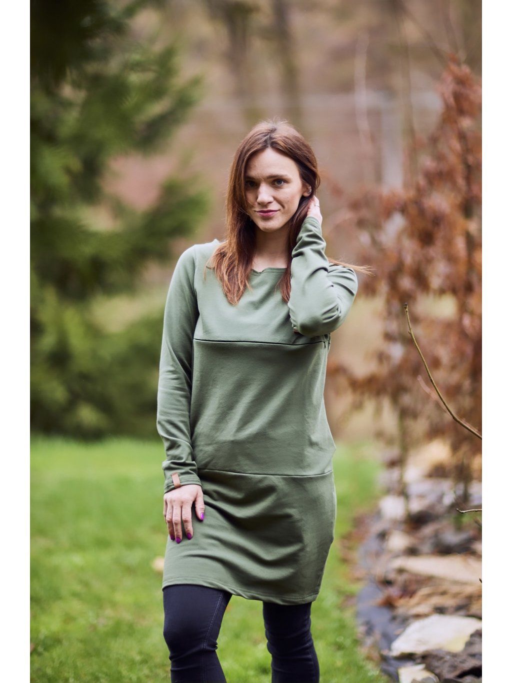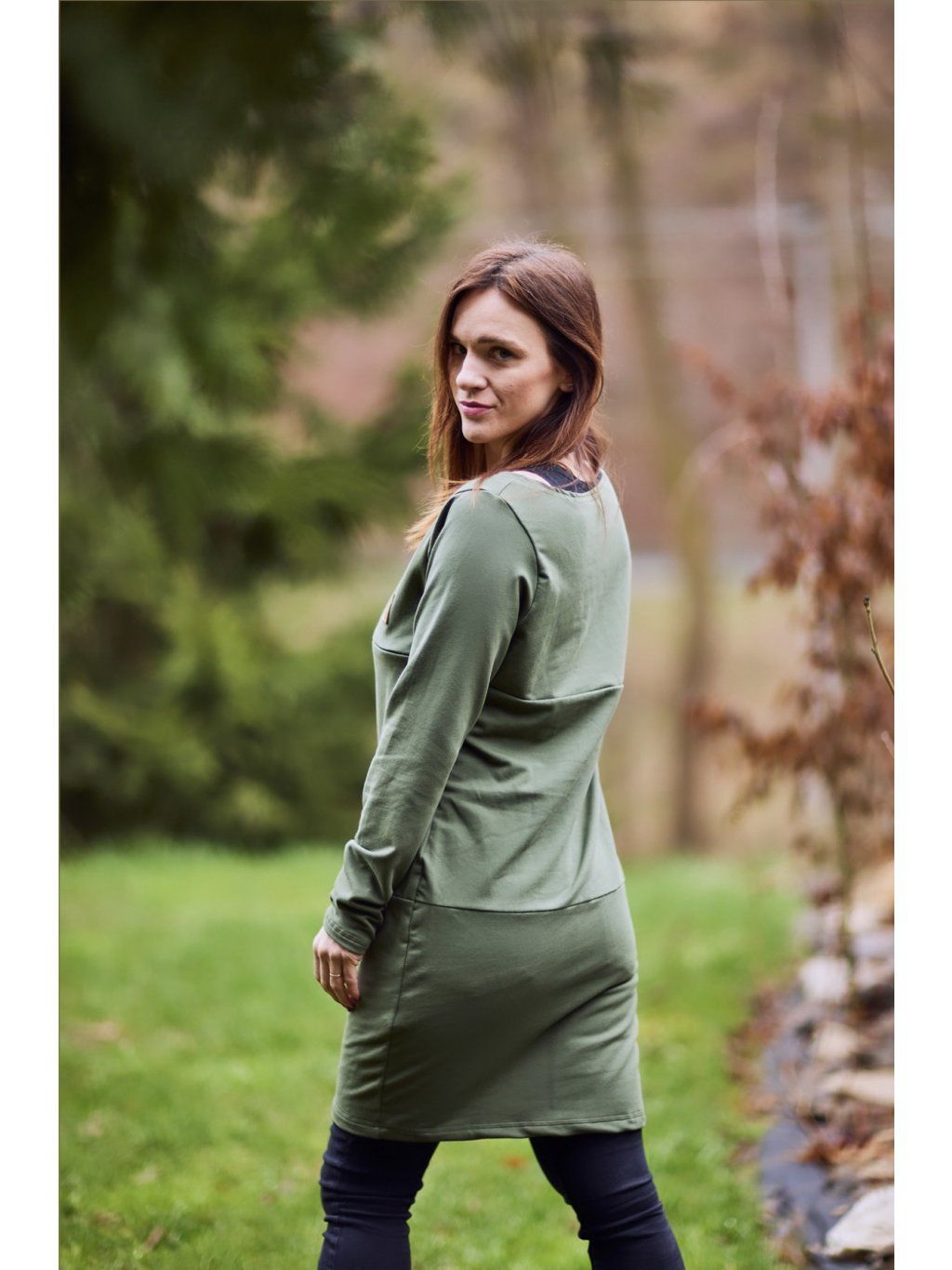 Mikino-šaty mají volnější střih přes ramena a v oblasti břicha. Mikina je delší, takže se dá nosit i jako šaty.