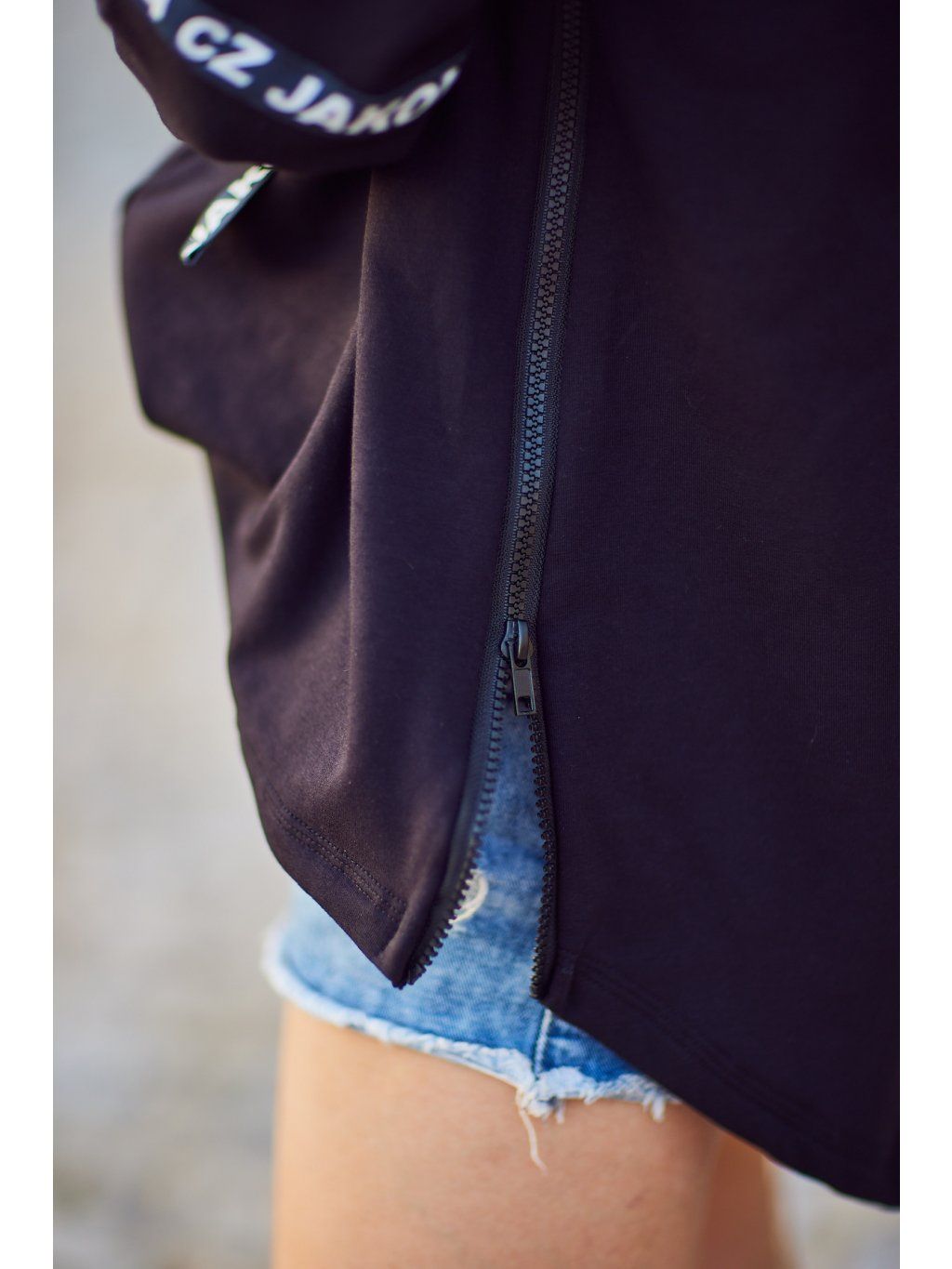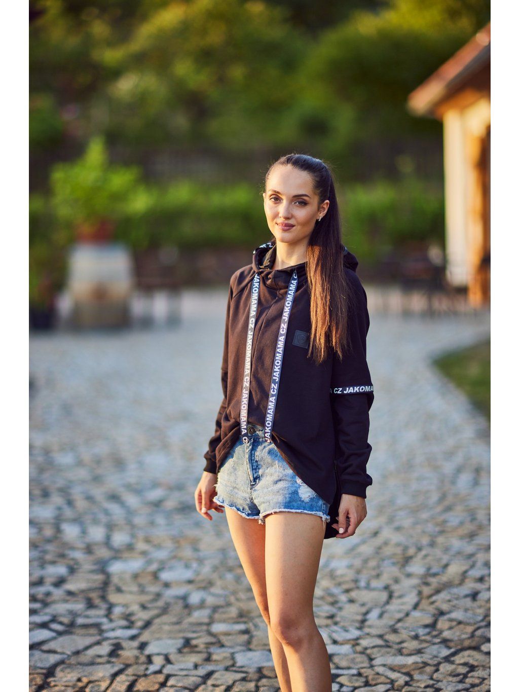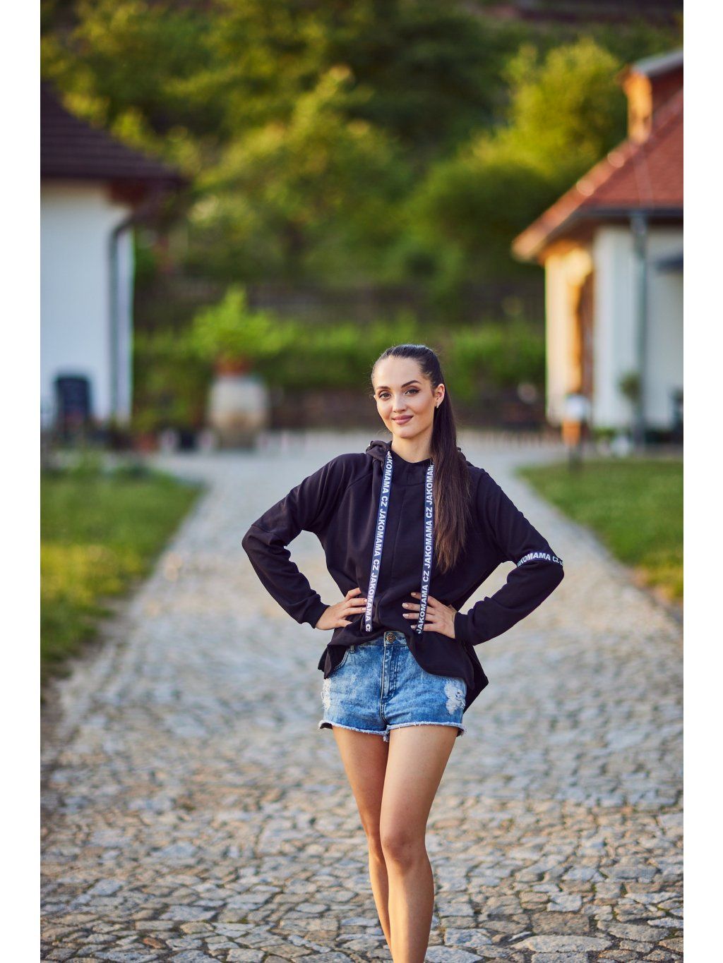 Stylová kratší mikina má volnější střih a je ušitá z černé slabší teplákoviny. Mikina má kapuci a po stranách zipy, který slouží k tomu, že můžete nakojit nebo jen jako okrasa. Mikina je doplněná pásky s nápisem JAKOMAMACZ.