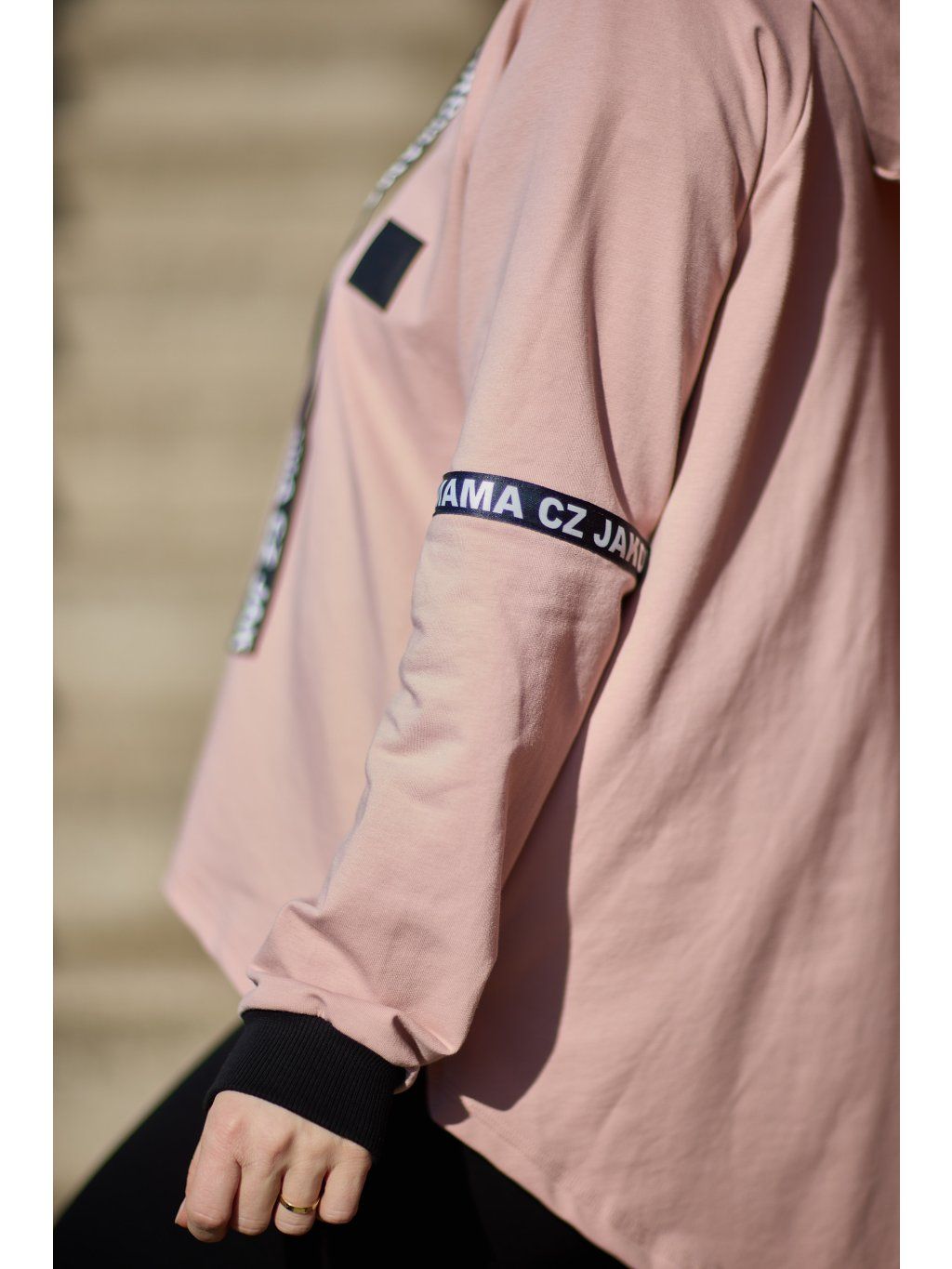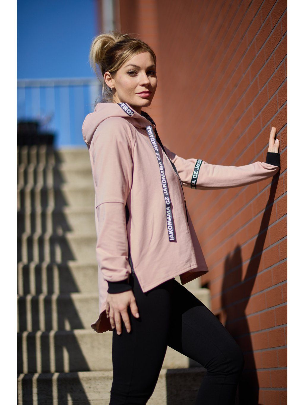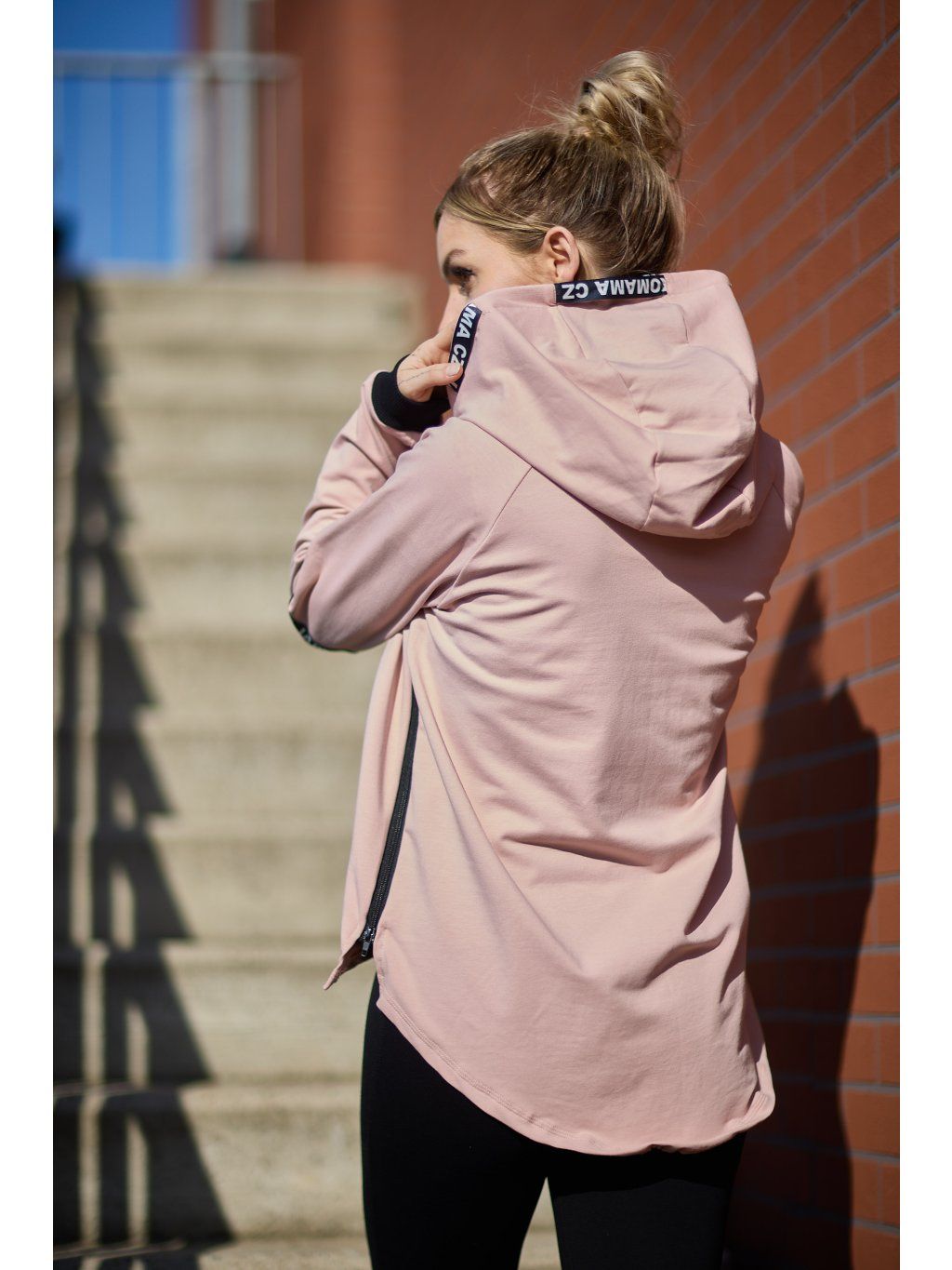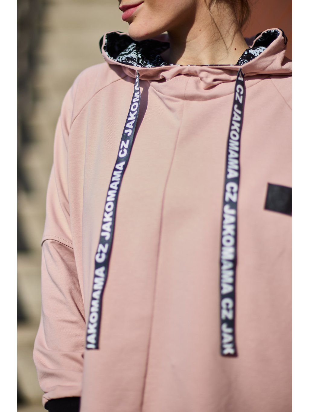 Stylová kratší mikina má volnější střih a je ušitá ze světle růžové teplákoviny. Mikina má kapuci a po stranách zipy, který slouží k tomu, že můžete nakojit nebo jen jako okrasa. Mikina je doplněná pásky s nápisem JAKOMAMACZ.