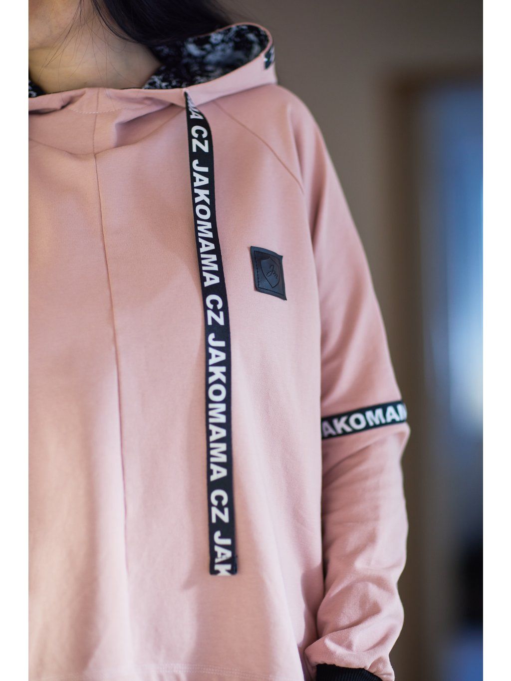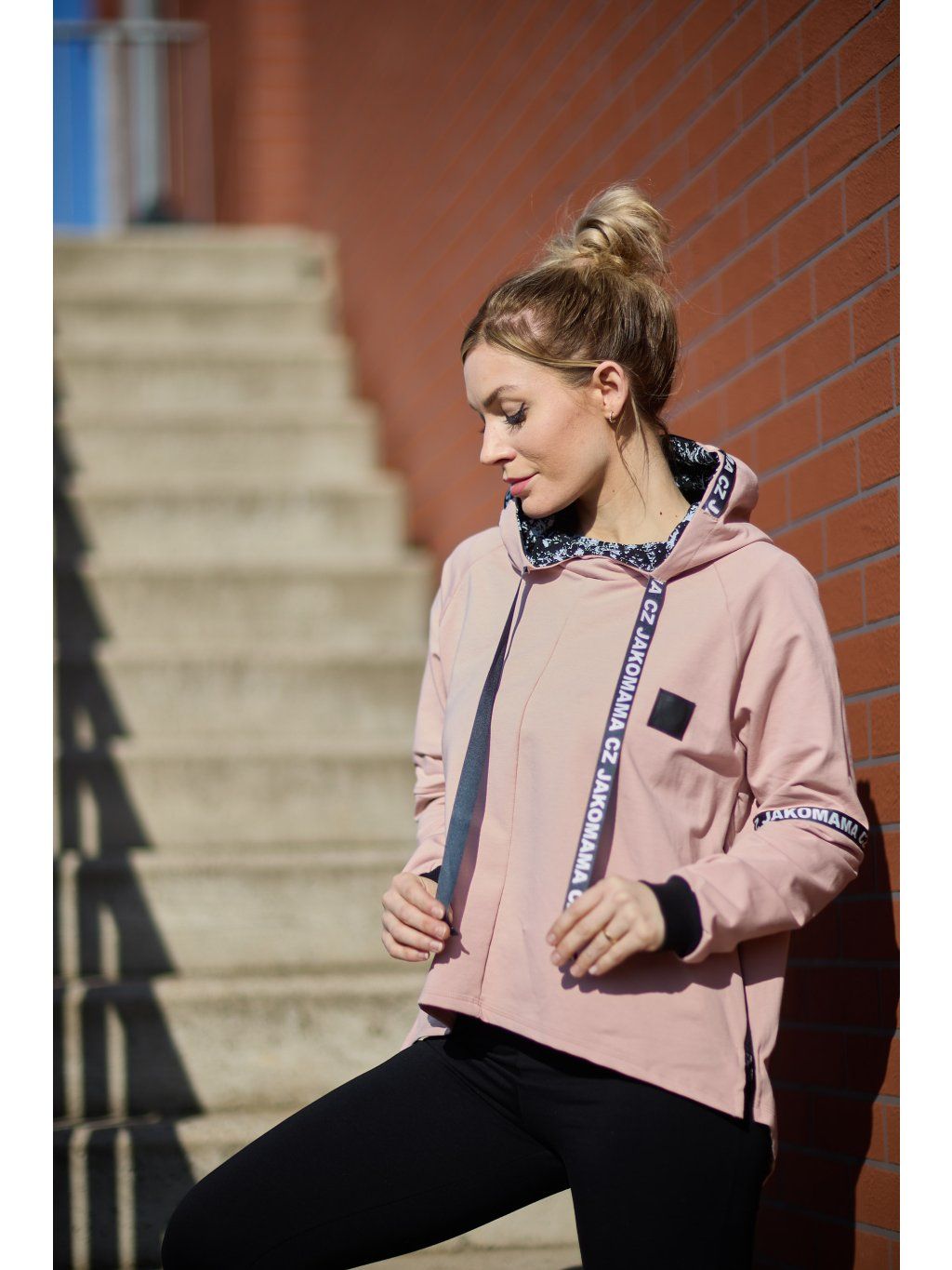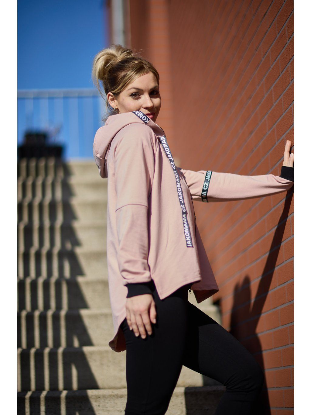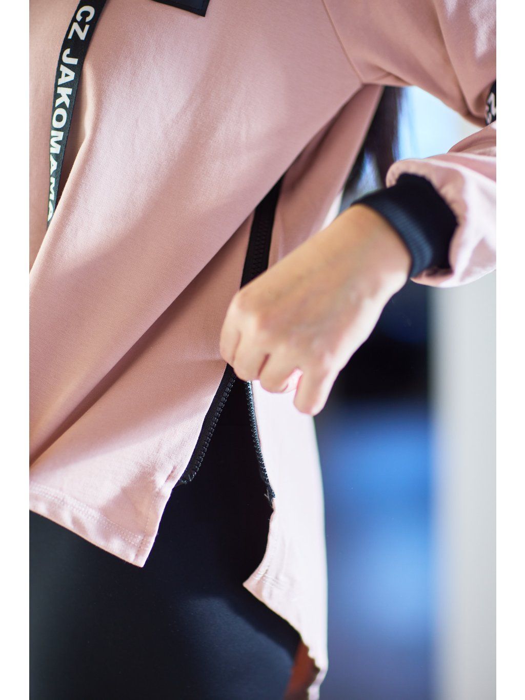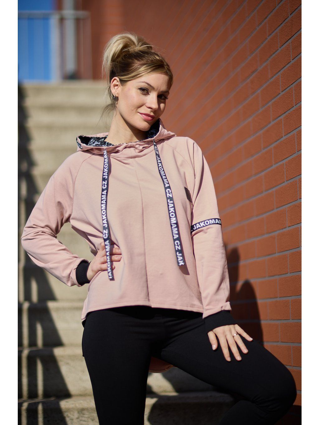 Stylová kratší mikina má volnější střih a je ušitá ze světle růžové teplákoviny. Mikina má kapuci a po stranách zipy, který slouží k tomu, že můžete nakojit nebo jen jako okrasa. Mikina je doplněná pásky s nápisem JAKOMAMACZ.