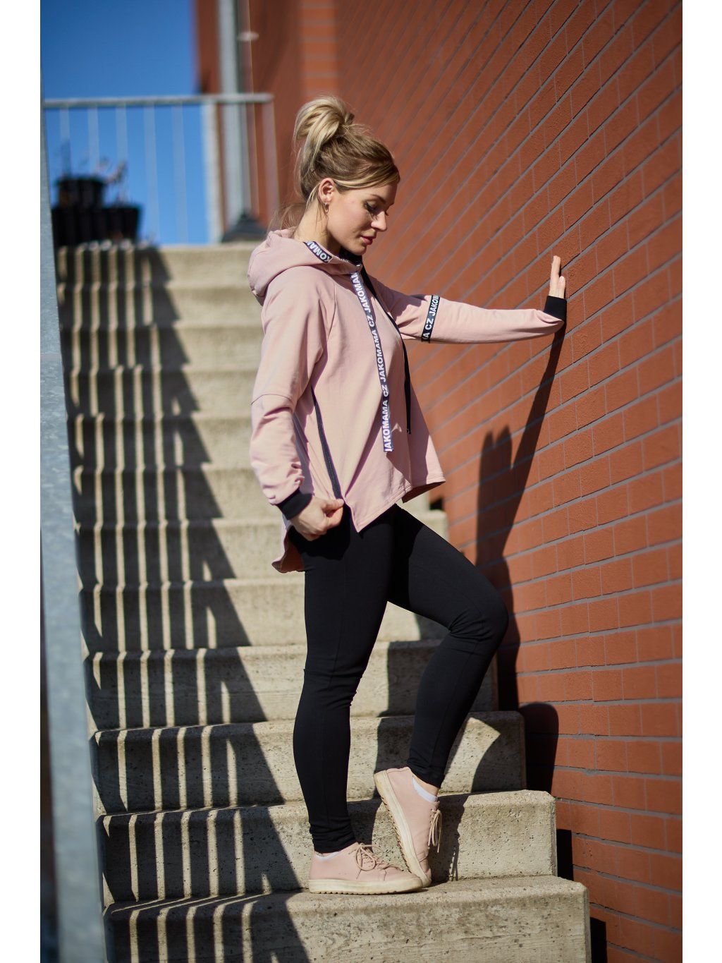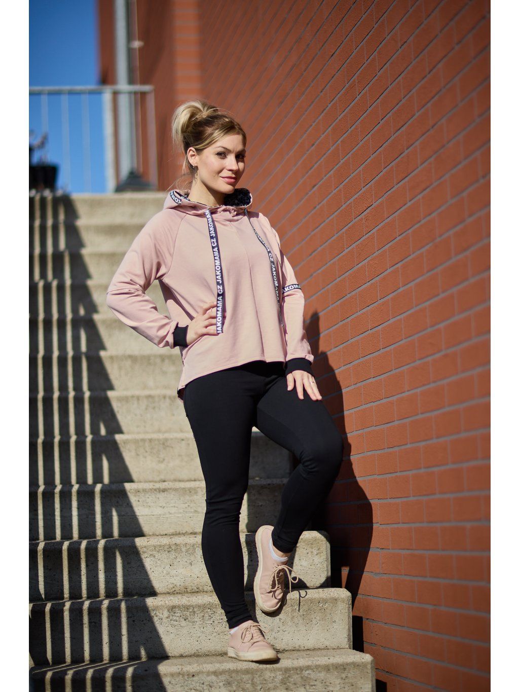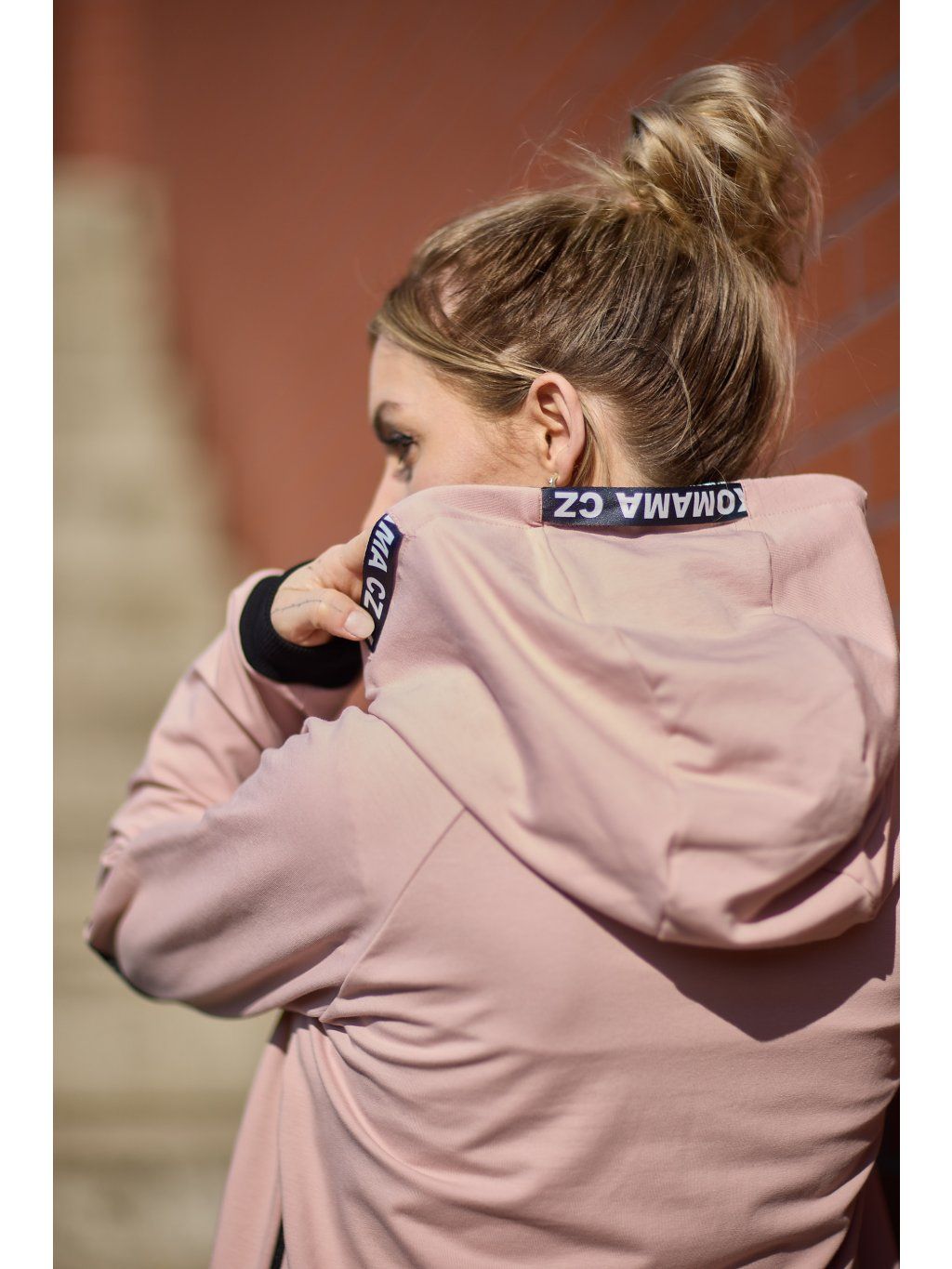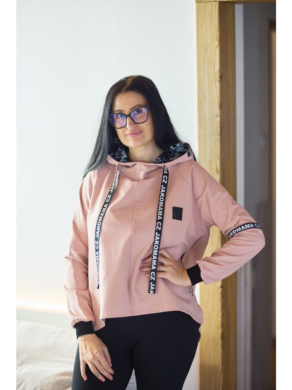 Stylová kratší mikina má volnější střih a je ušitá ze světle růžové teplákoviny. Mikina má kapuci a po stranách zipy, který slouží k tomu, že můžete nakojit nebo jen jako okrasa. Mikina je doplněná pásky s nápisem JAKOMAMACZ.