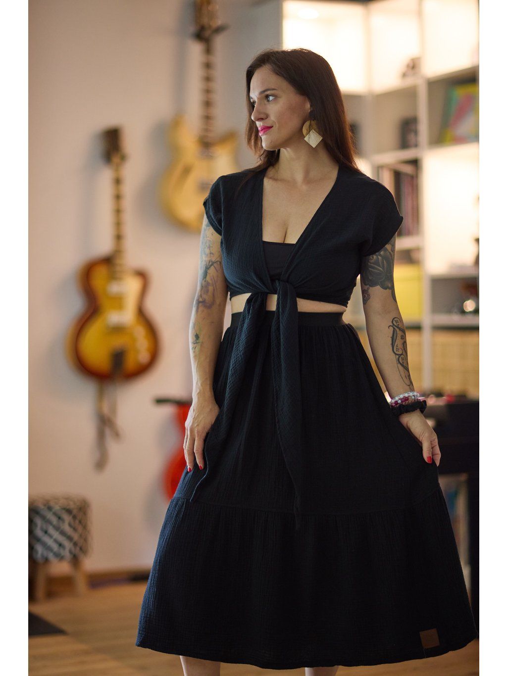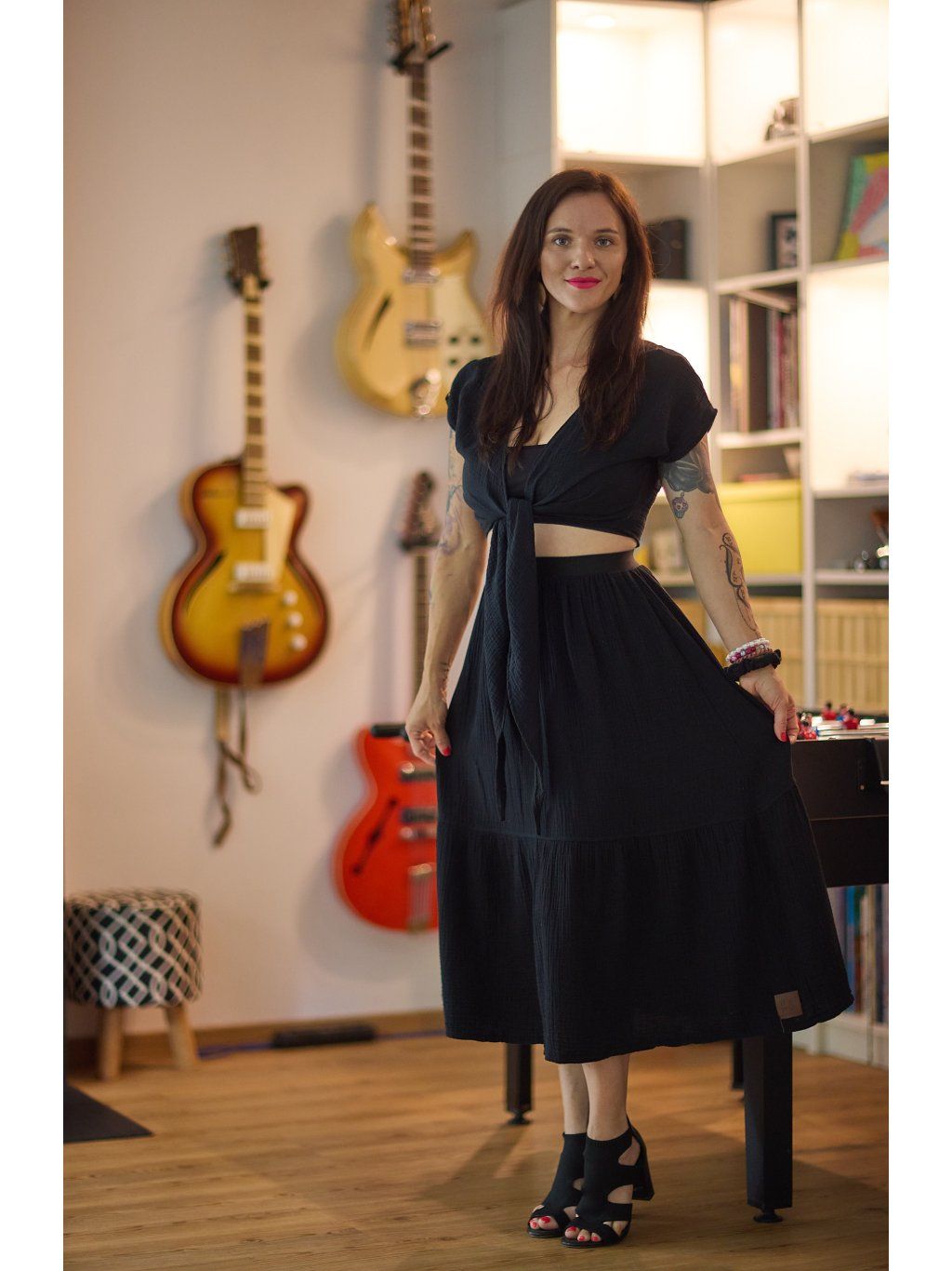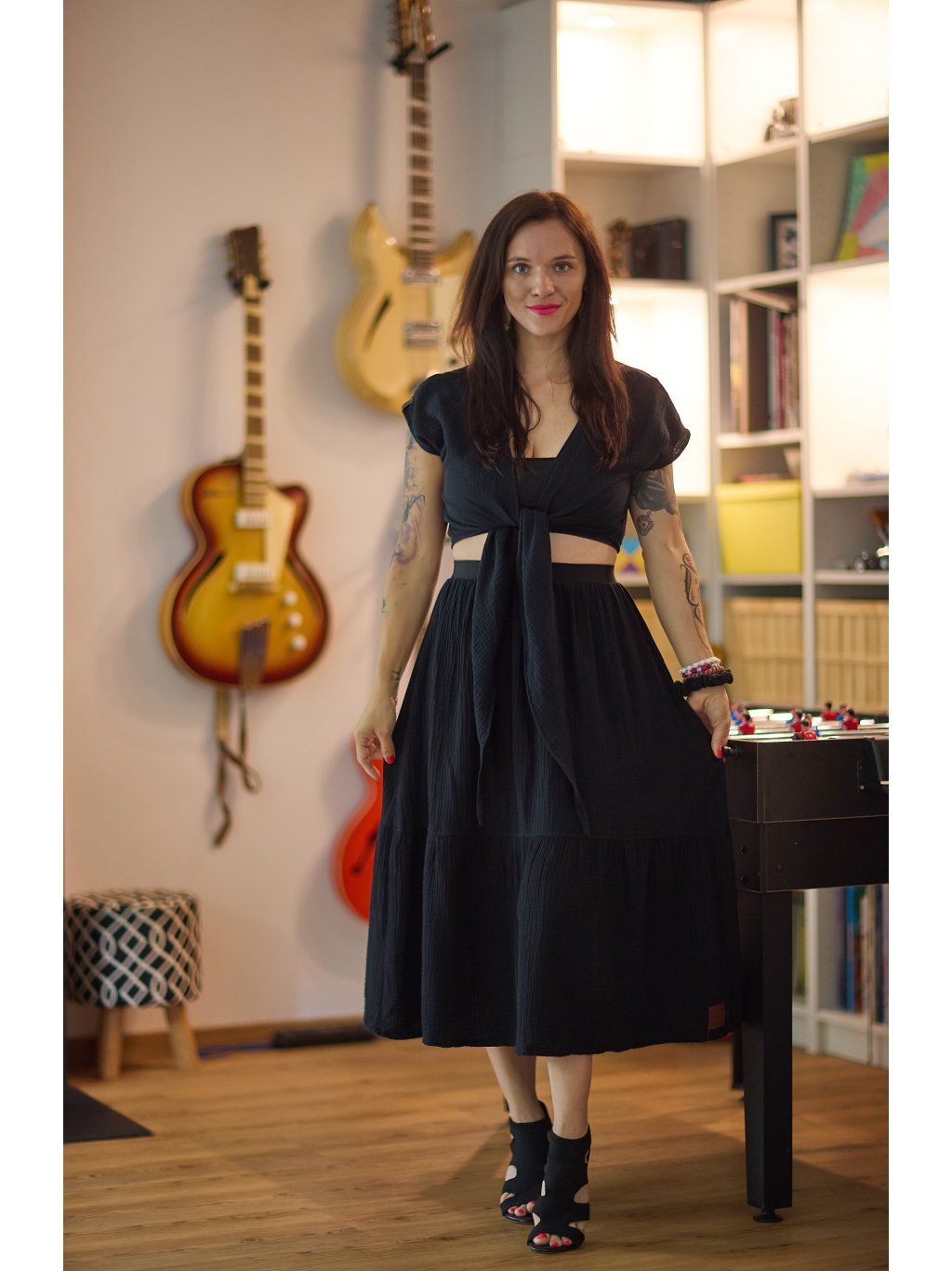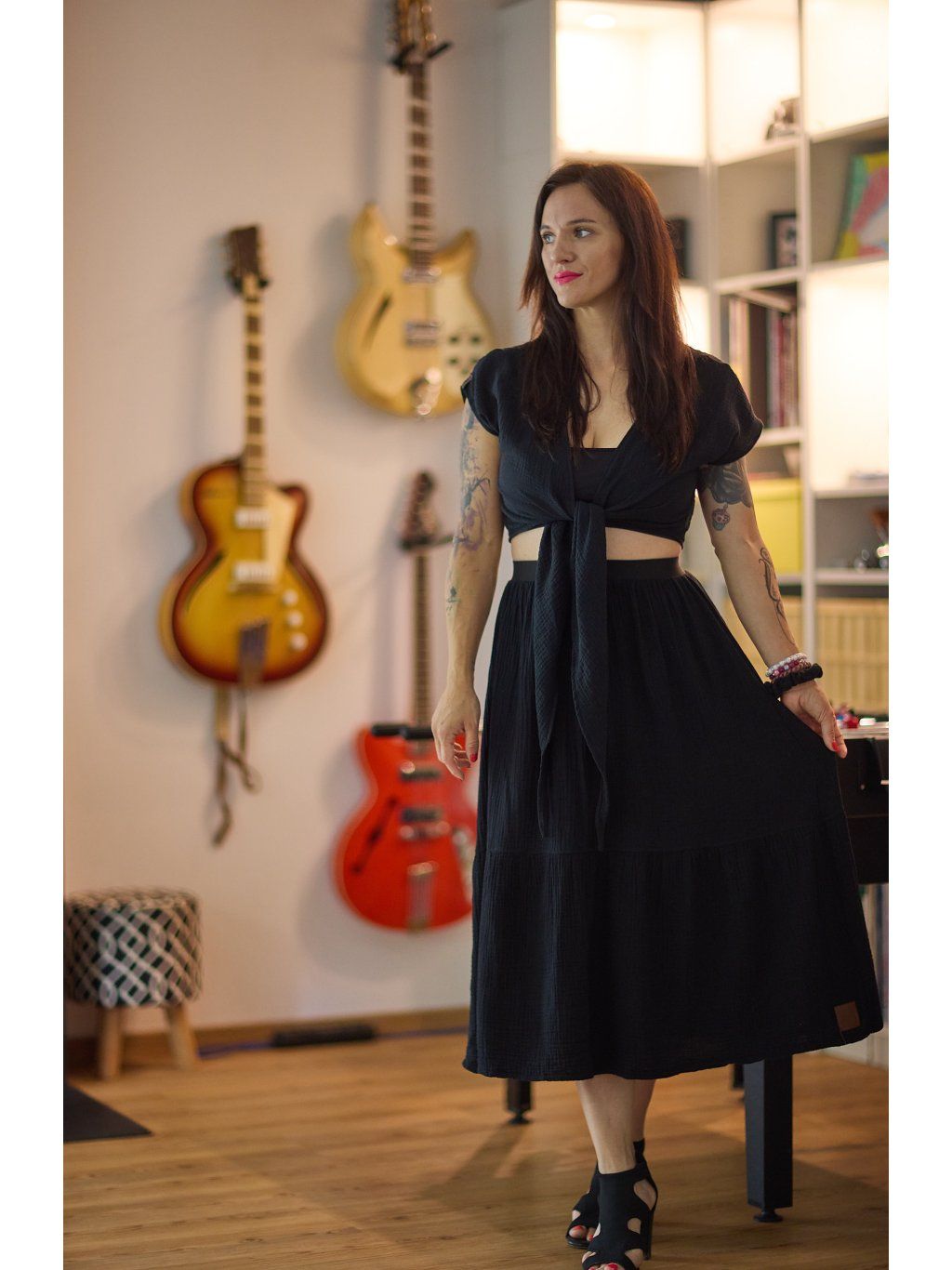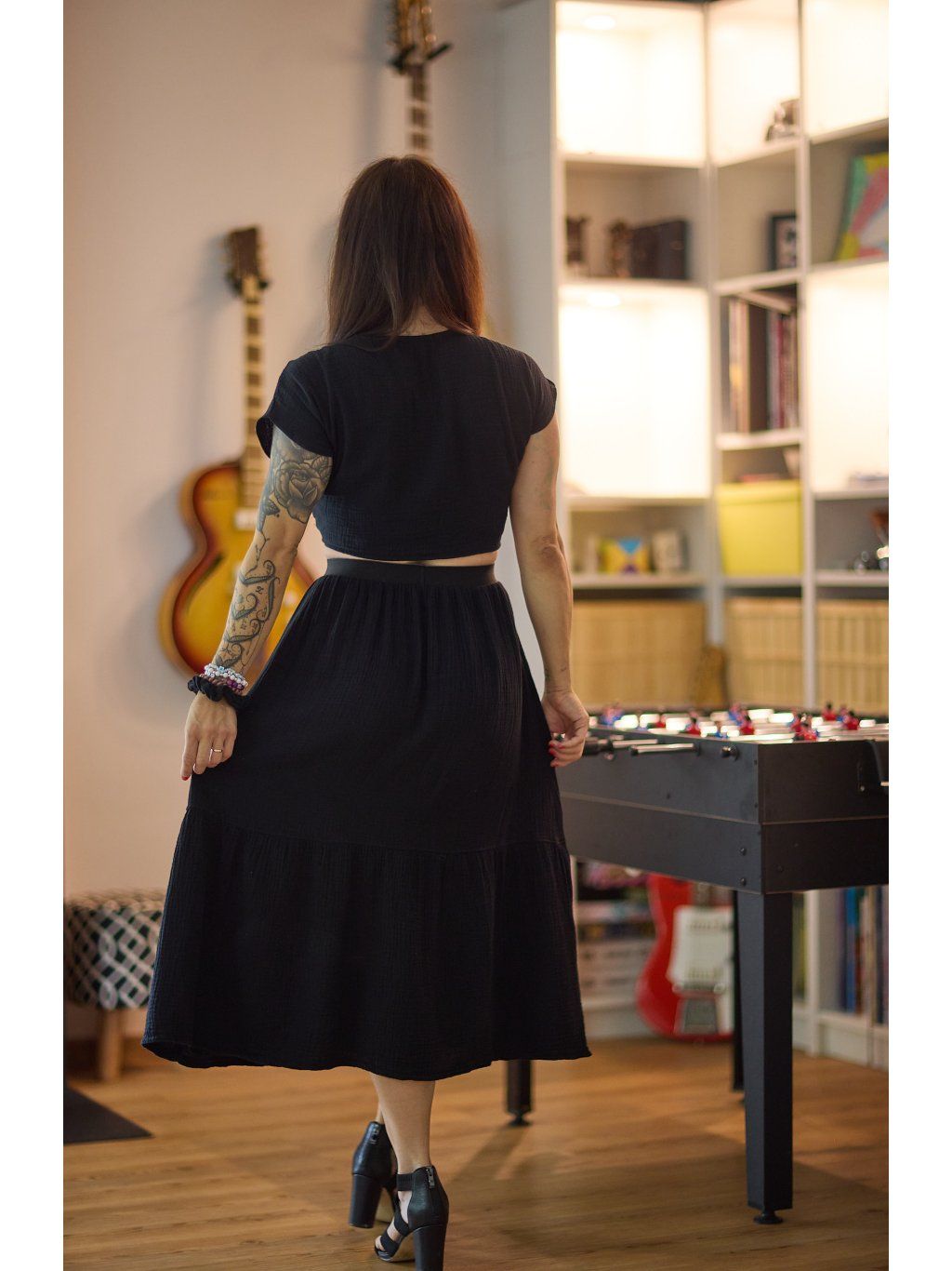 Sukně je ušitá z bavlněného mušelínu, v pase je do gumy a spodek sukně je zakončený volanem.
