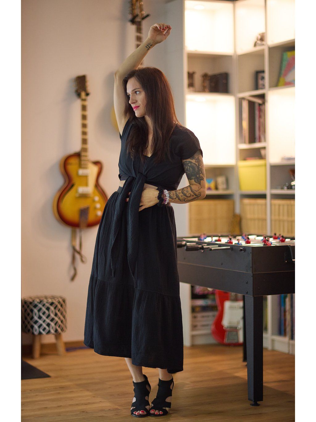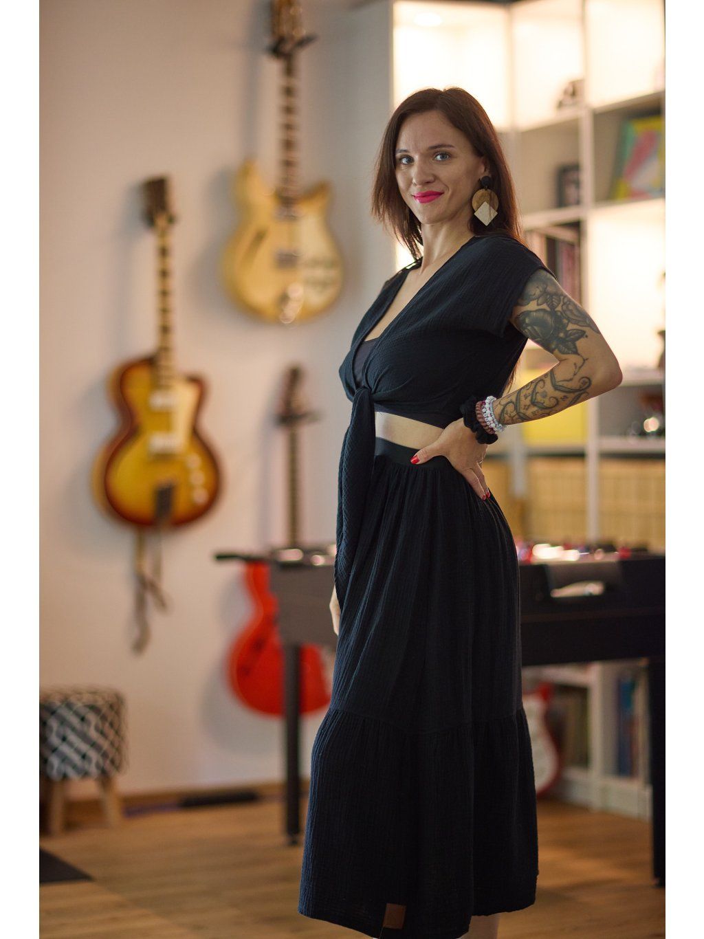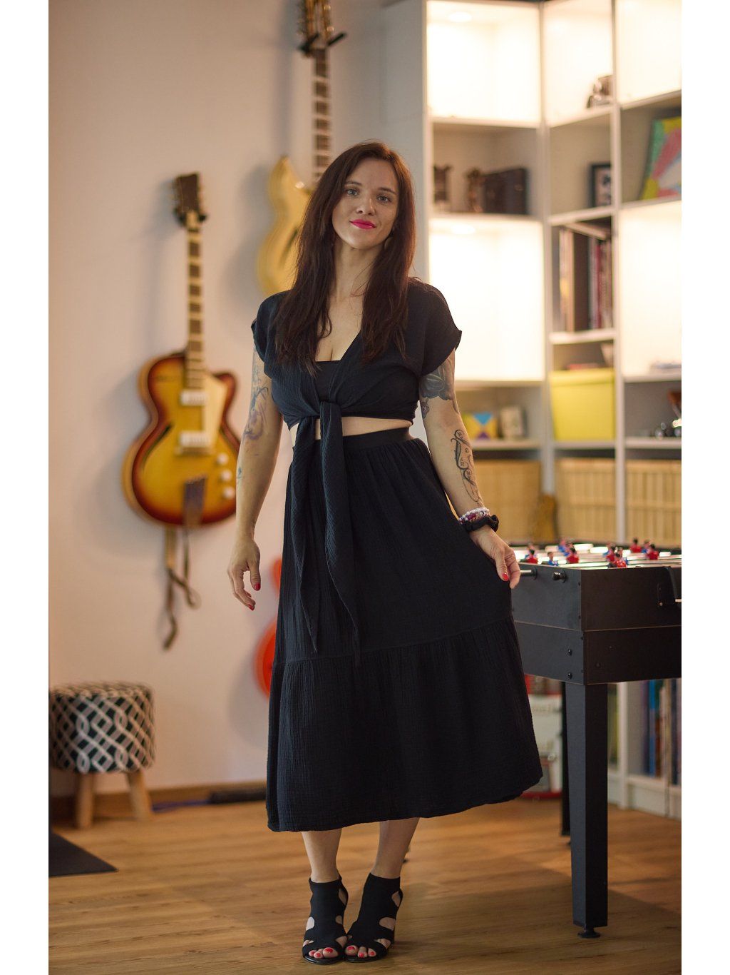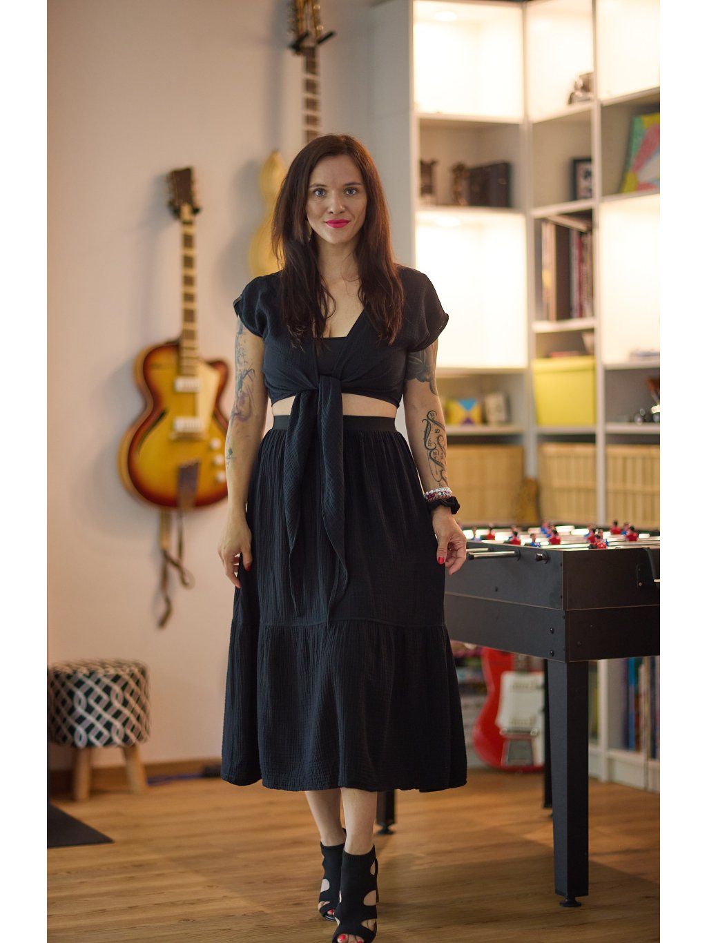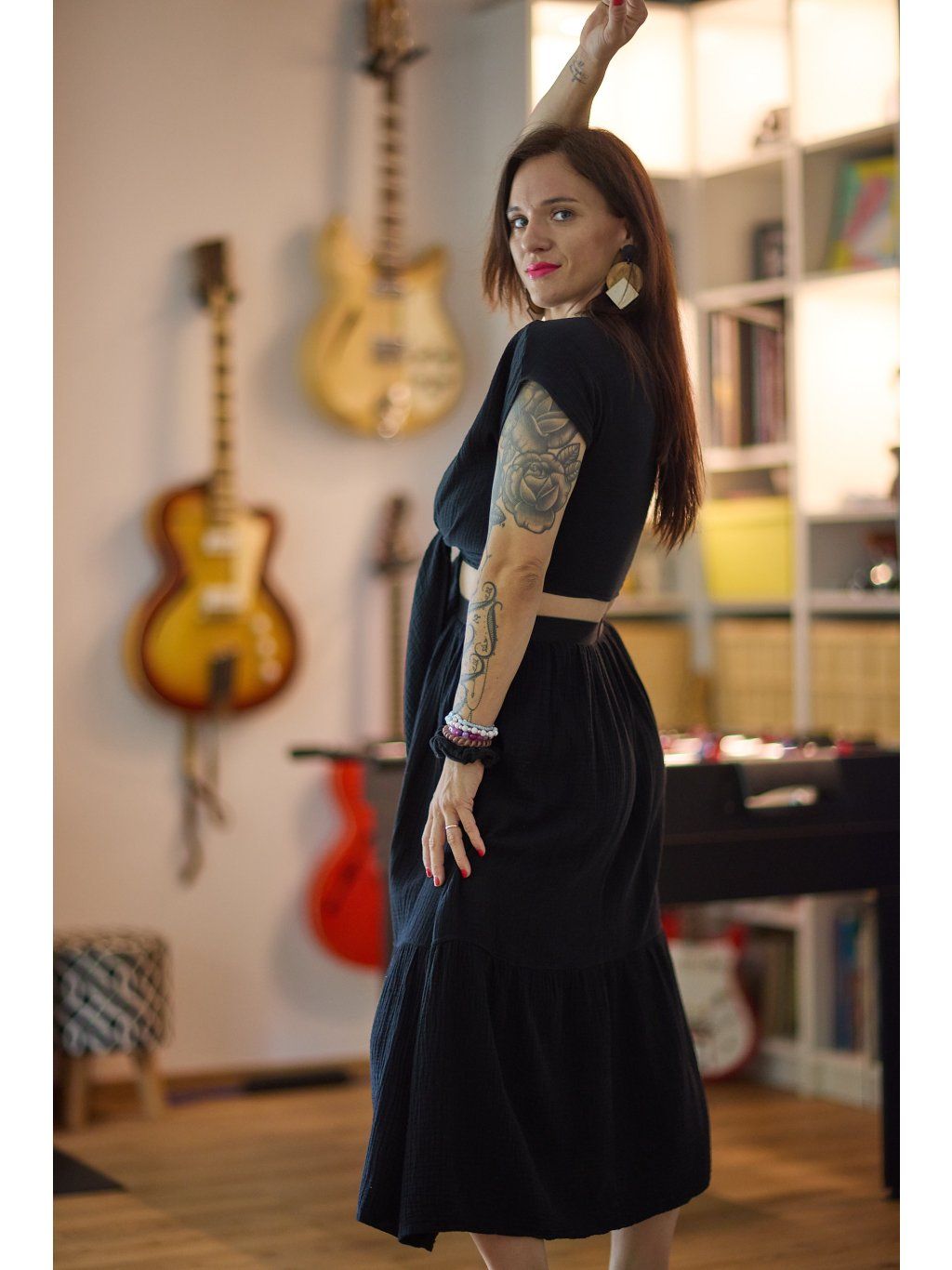 Sukně je ušitá z bavlněného mušelínu, v pase je do gumy a spodek sukně je zakončený volanem.