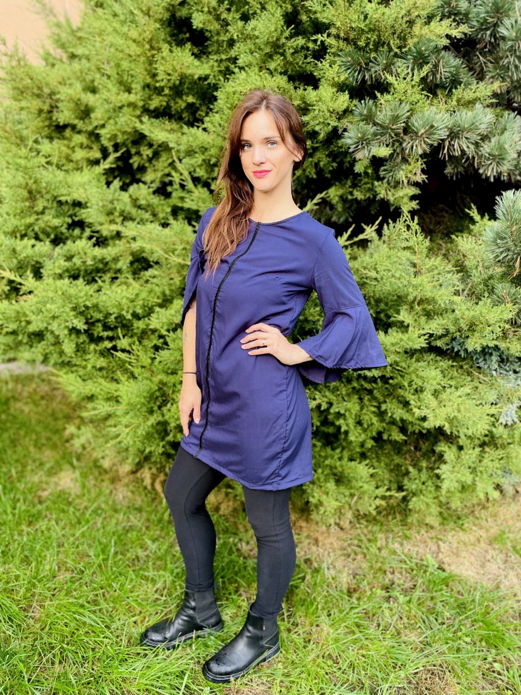 Tunika je ušitá ze slabší tkaninové viskózy. Na předním díle je našitá černá třpytivá gumička. Tunika je oversize, rukávy jsou 3/4 a do zvonu. Aby lépe seděla, má vpředu u prsou záševky a vzadu za krkem je na zavazování.