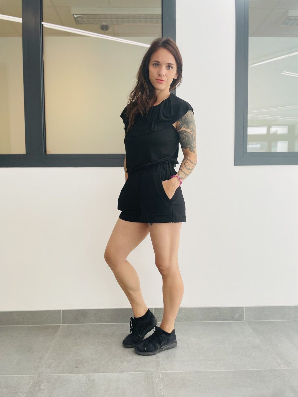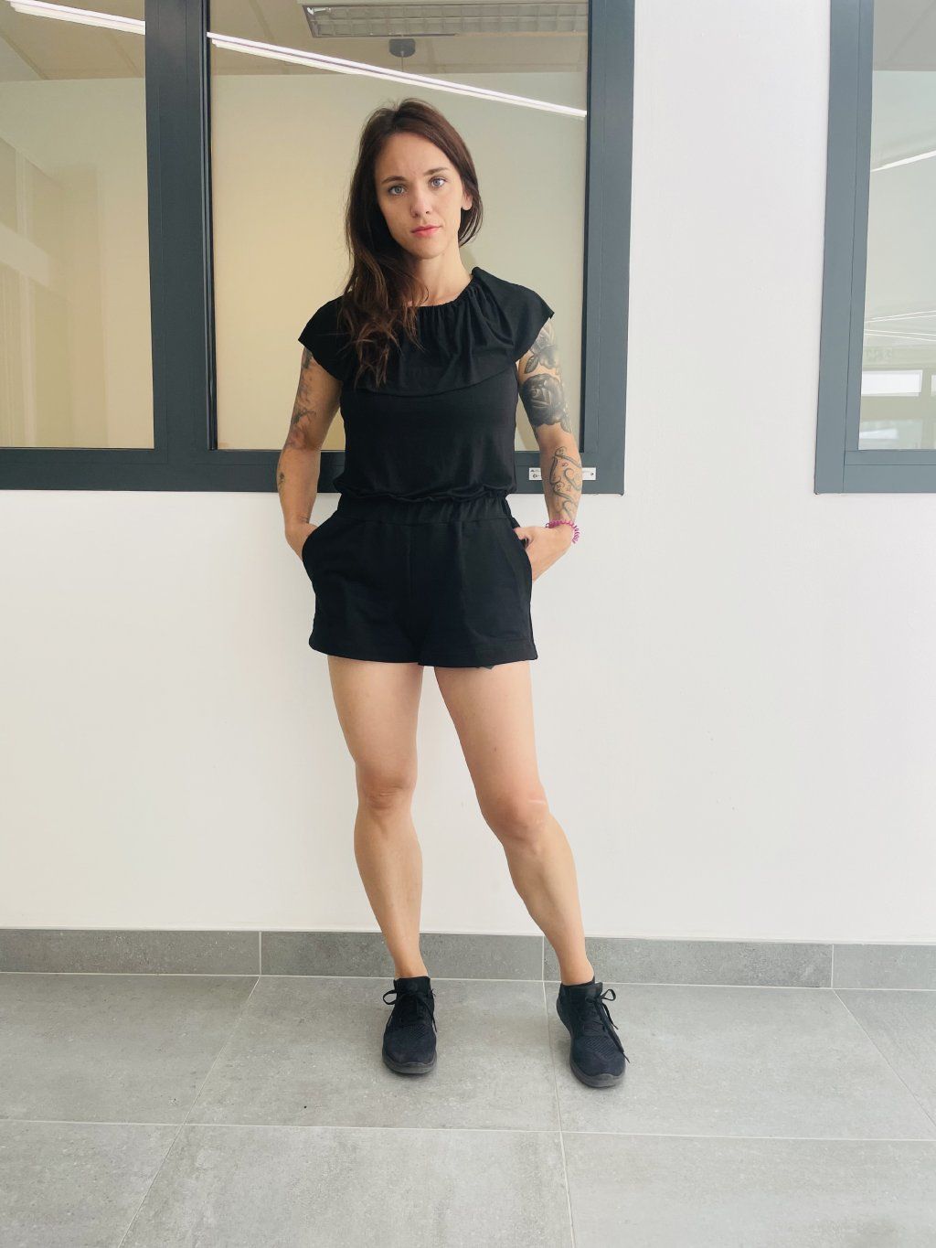 Kraťasy s z černé teplákoviny. Mají dvě boční kapsy a nařasený horní lem.
