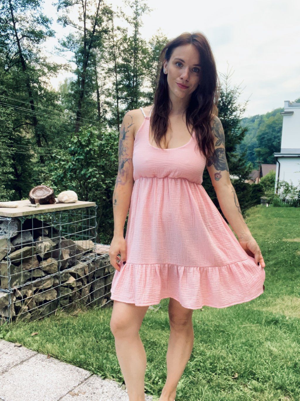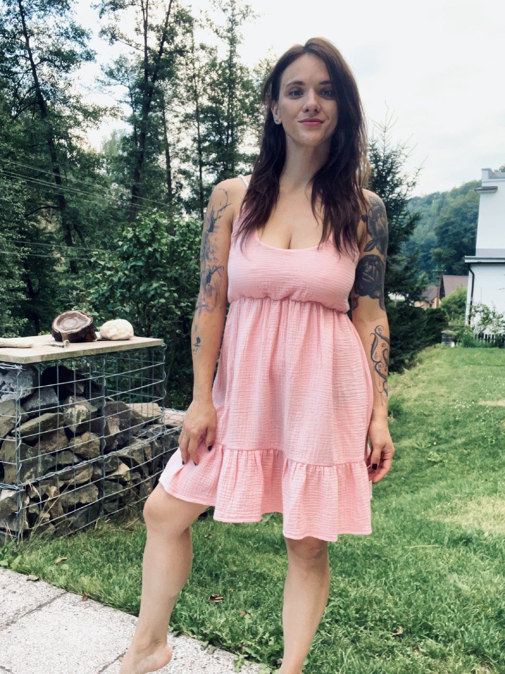 Šaty jsou ušité z prémiového růžového mušelínu. Přední díl je vyztužený vlizelínem, aby se daly nosit bez podprsenky. Po stranách mají záševky a pod prsy úzkou gumičku. Vzadu mají rafinované zavazovaní na šňůrku, která se dá nastavit, jak potřebujete.