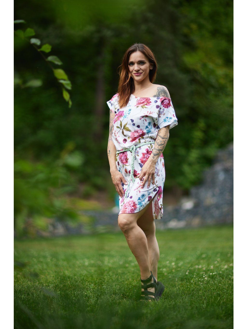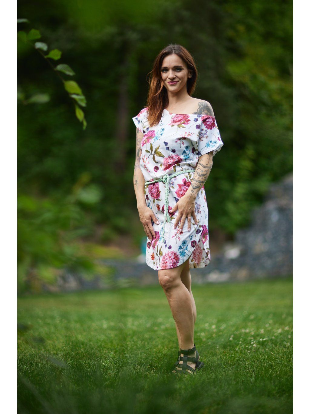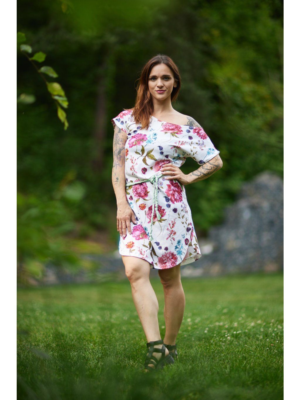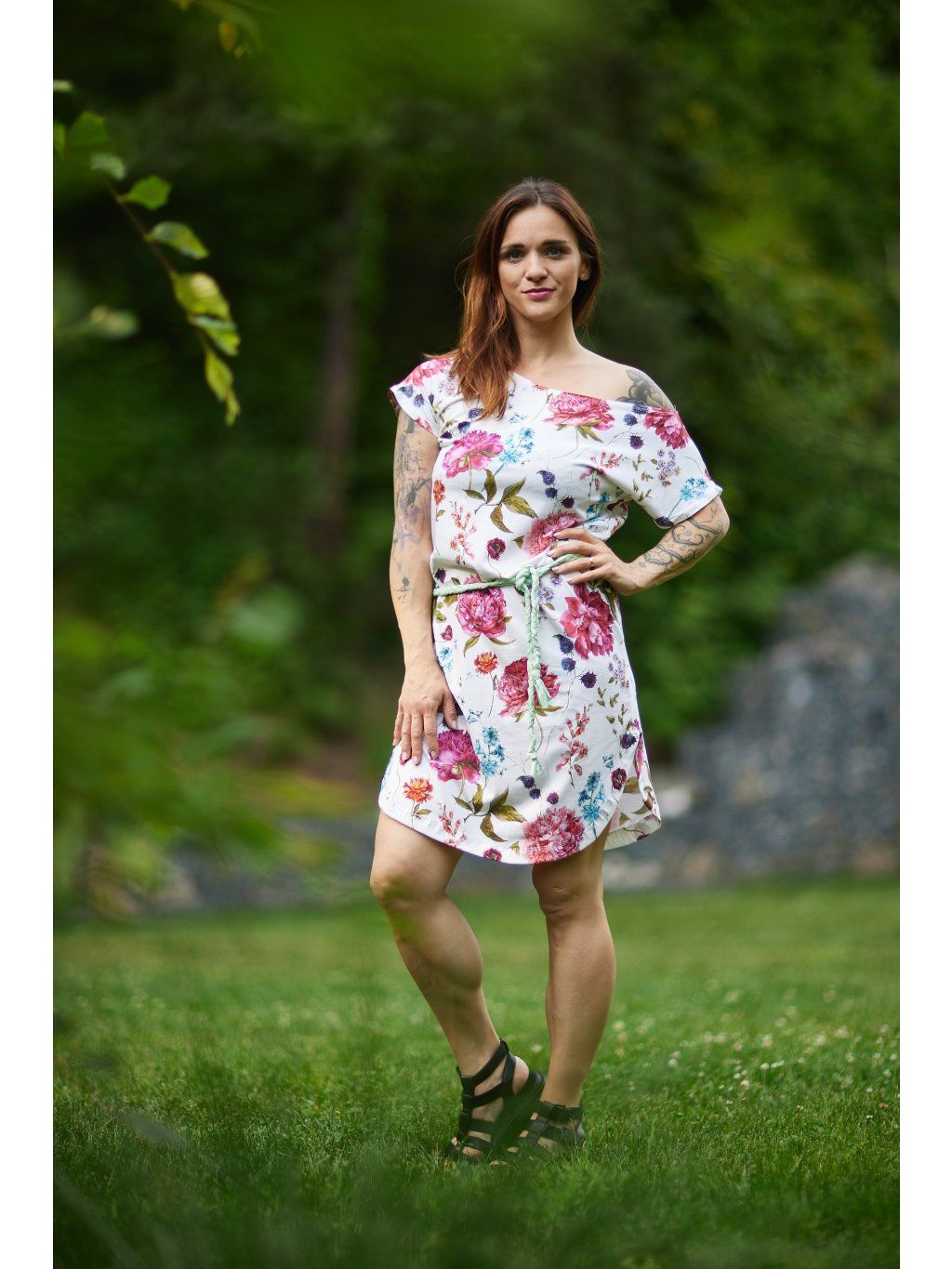 Letní volné šaty se spadlým ramenem. Šaty mají zelený páseček a jsou ušité z barevného bavlna/elastan úpletu.