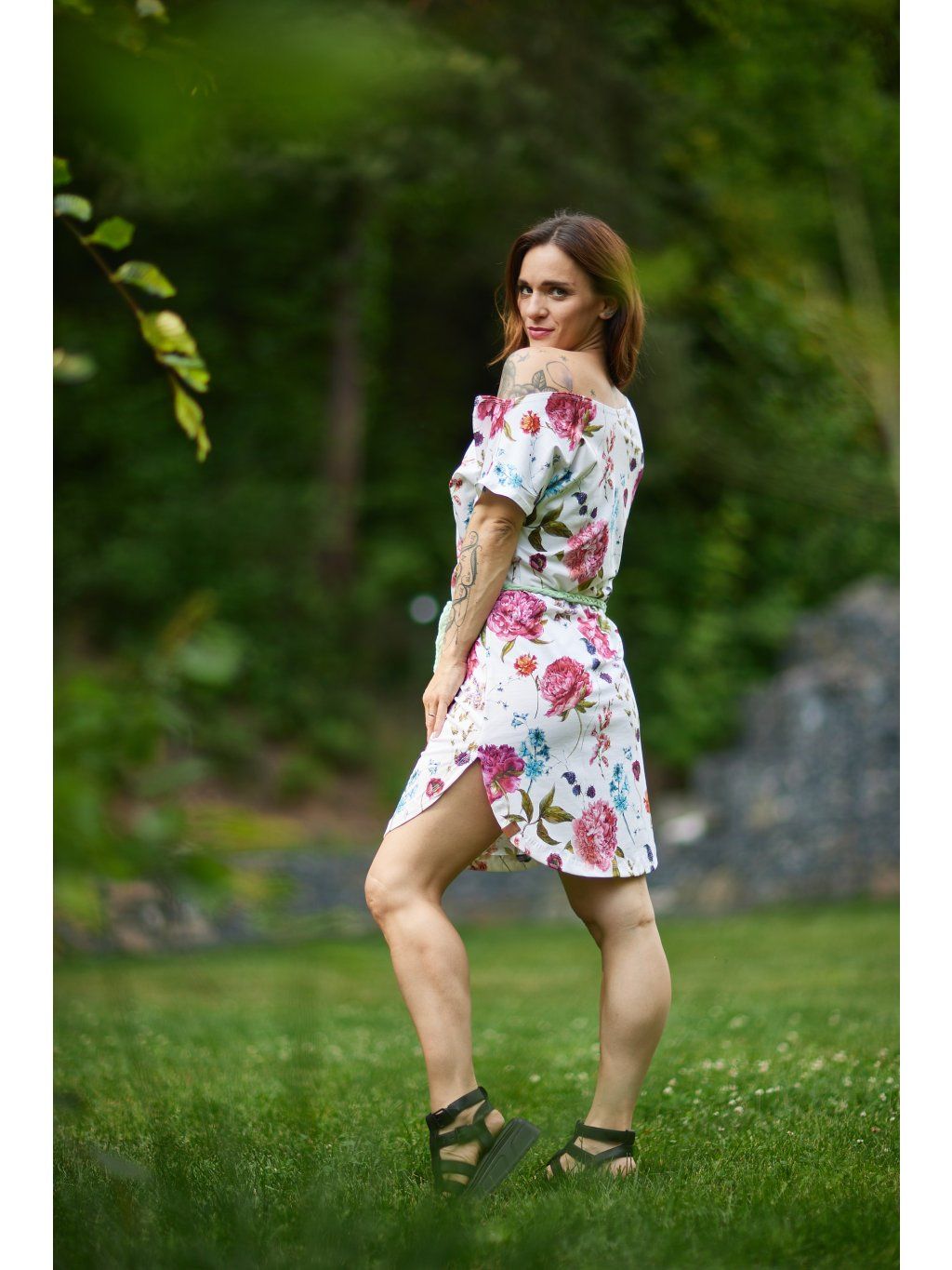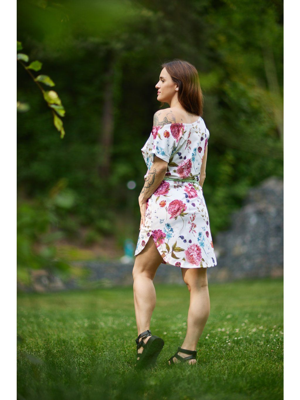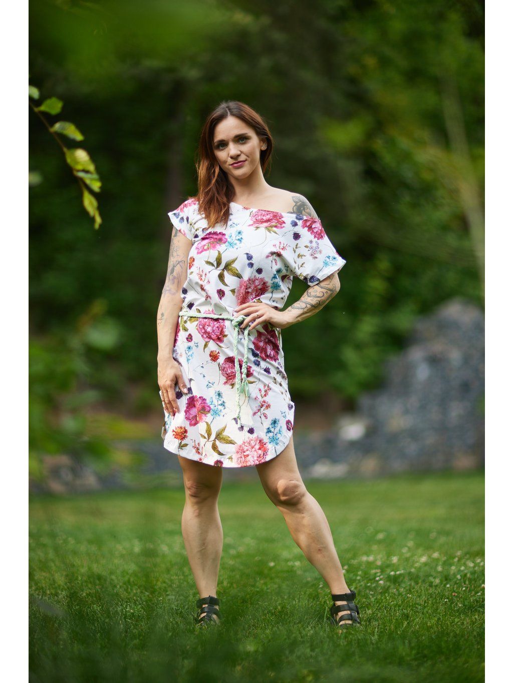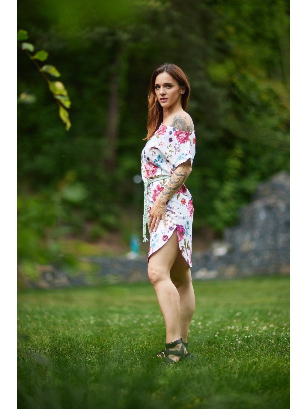 Letní volné šaty se spadlým ramenem. Šaty mají zelený páseček a jsou ušité z barevného bavlna/elastan úpletu.