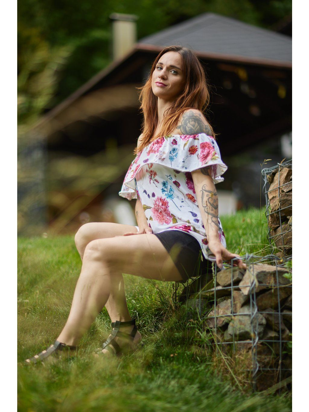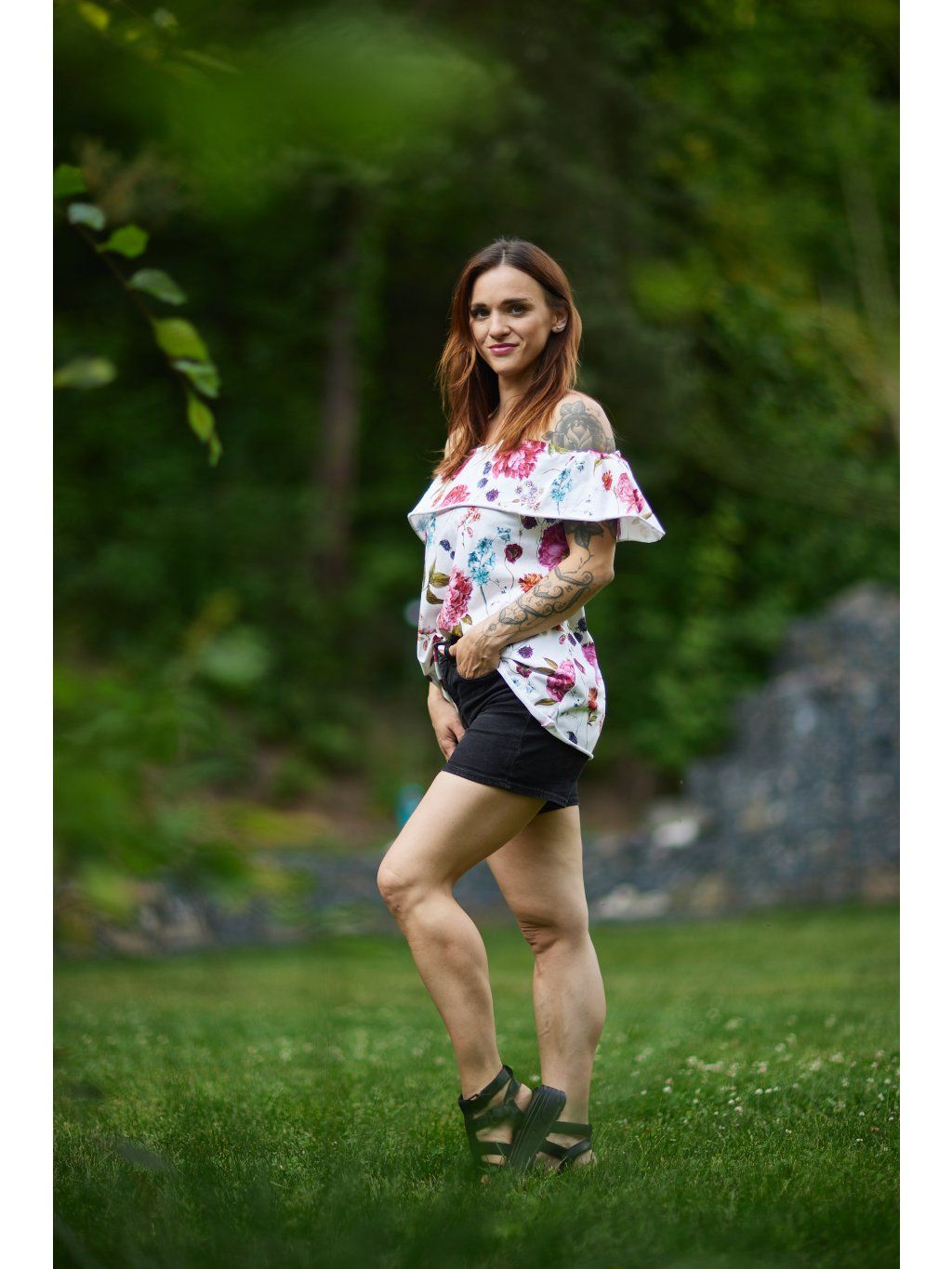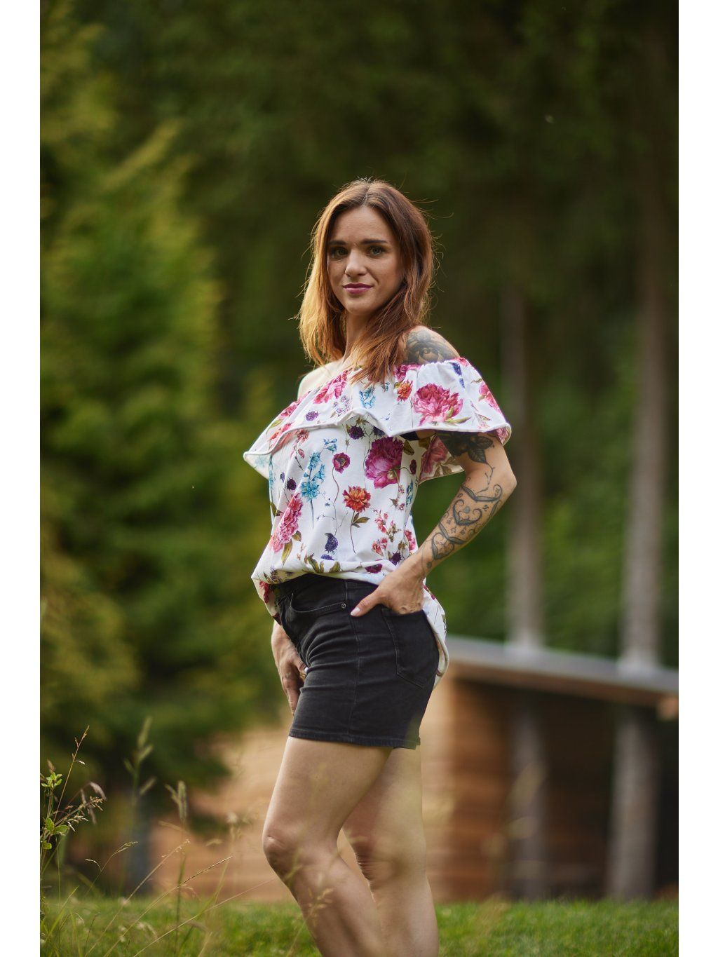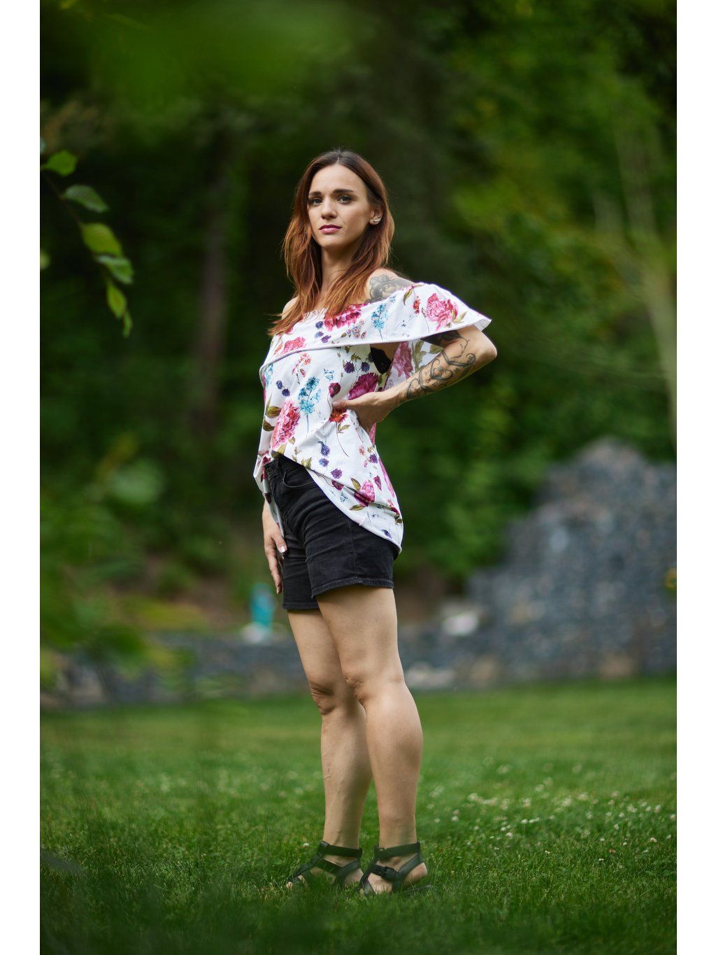 Letní volné tričko z příjemného materiálu, které se dají nosit na několik způsobů. Materiál je jemný bavlněný úplet s elastanem s potiskem květin.