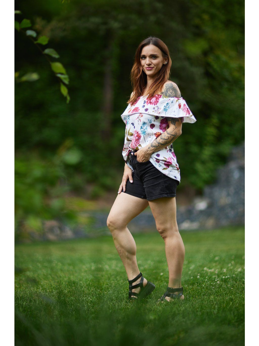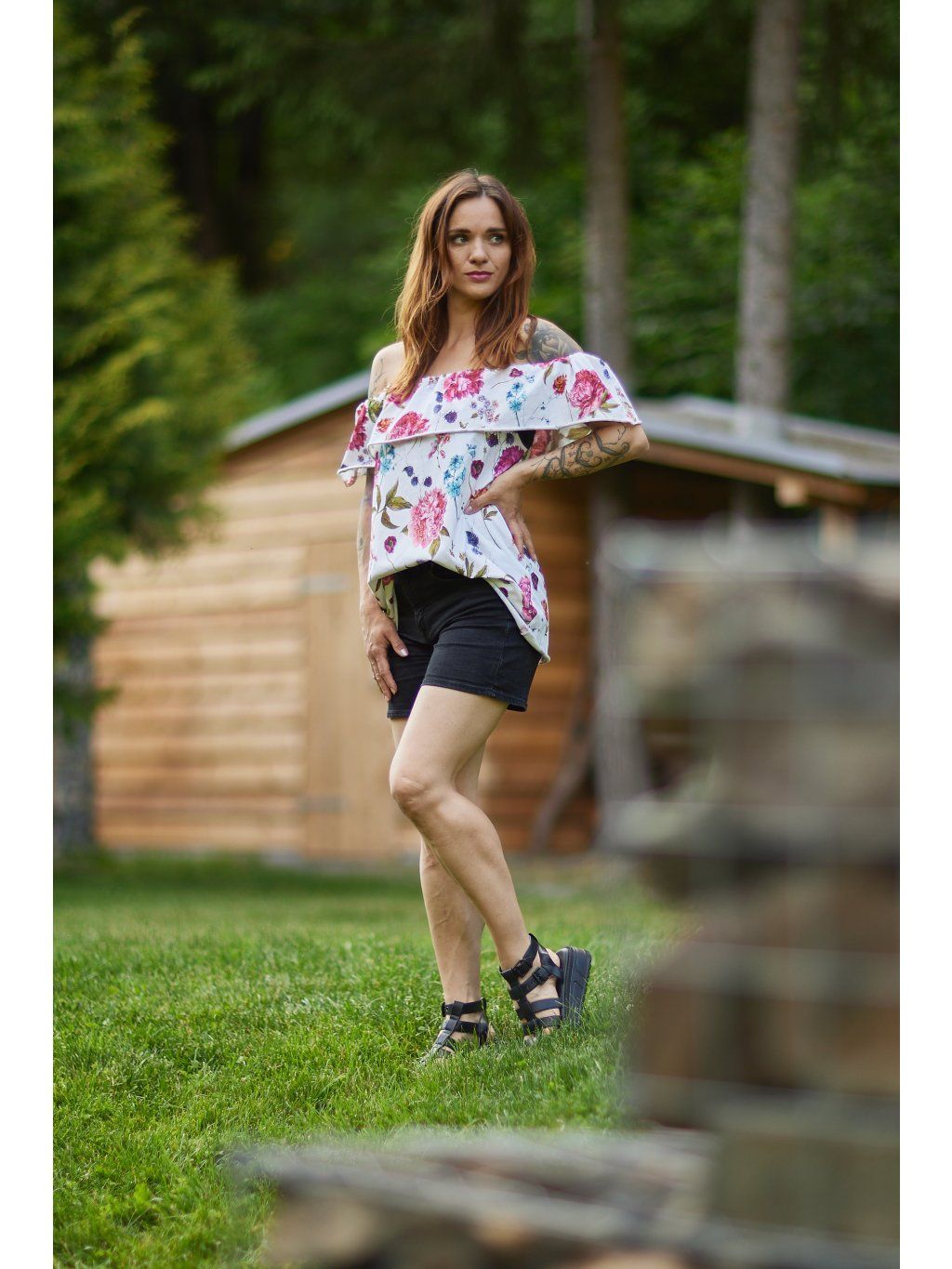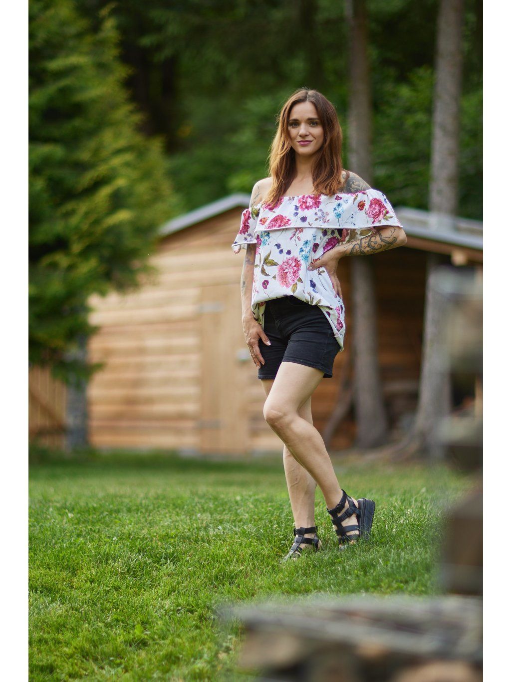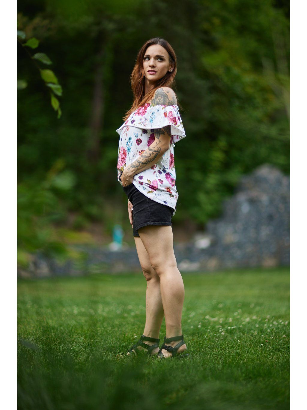 Letní volné tričko z příjemného materiálu, které se dají nosit na několik způsobů. Materiál je jemný bavlněný úplet s elastanem s potiskem květin.