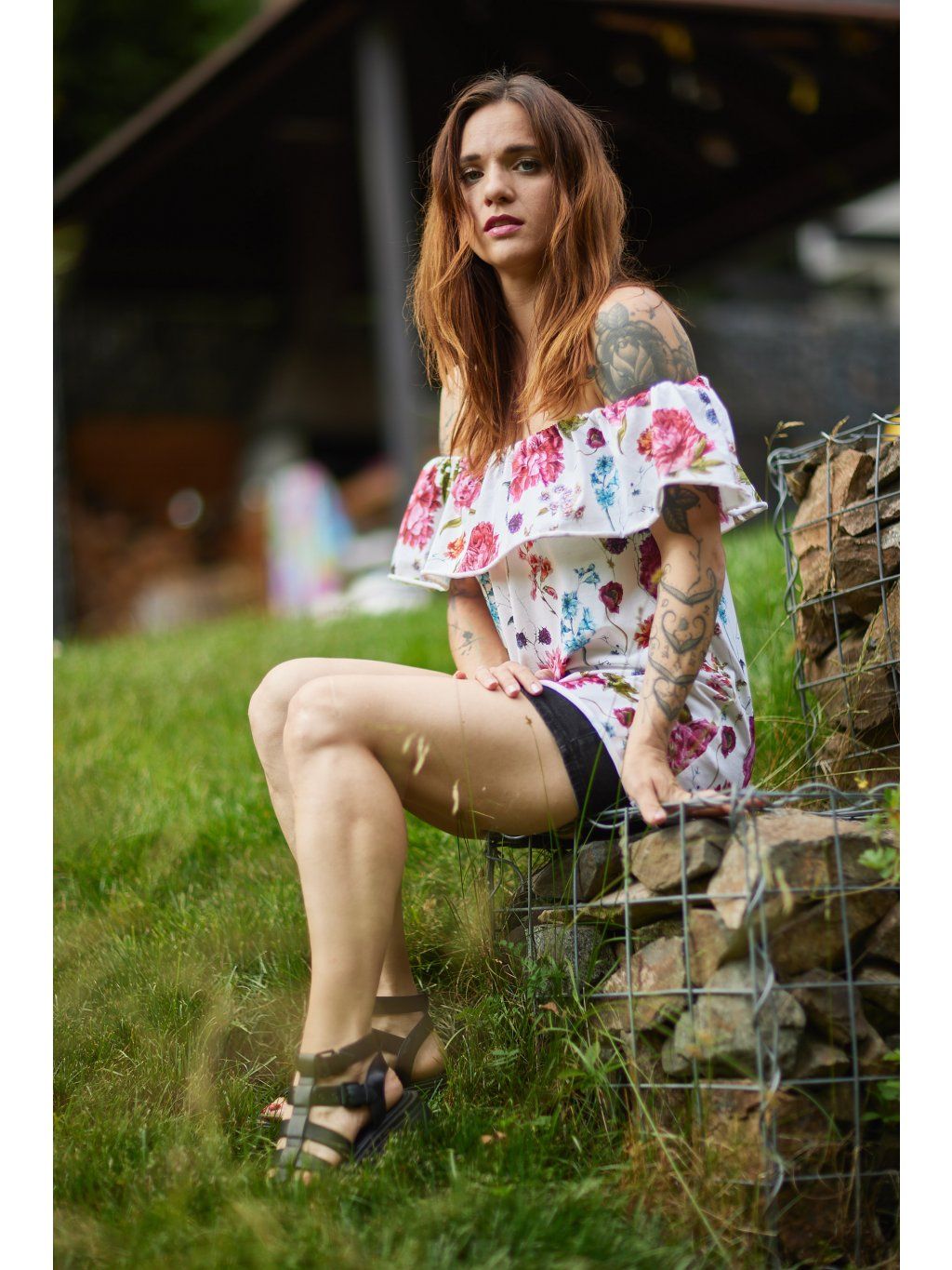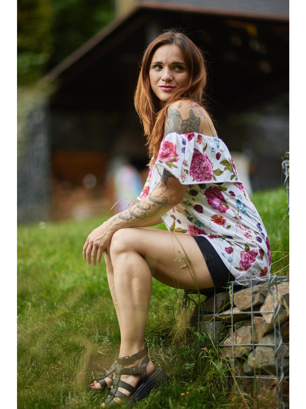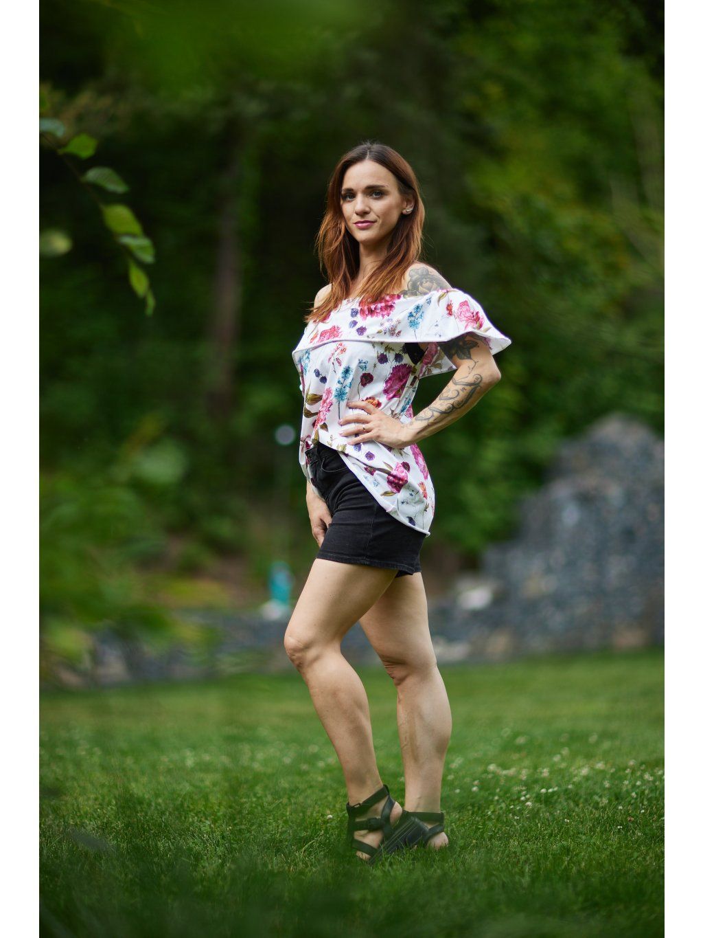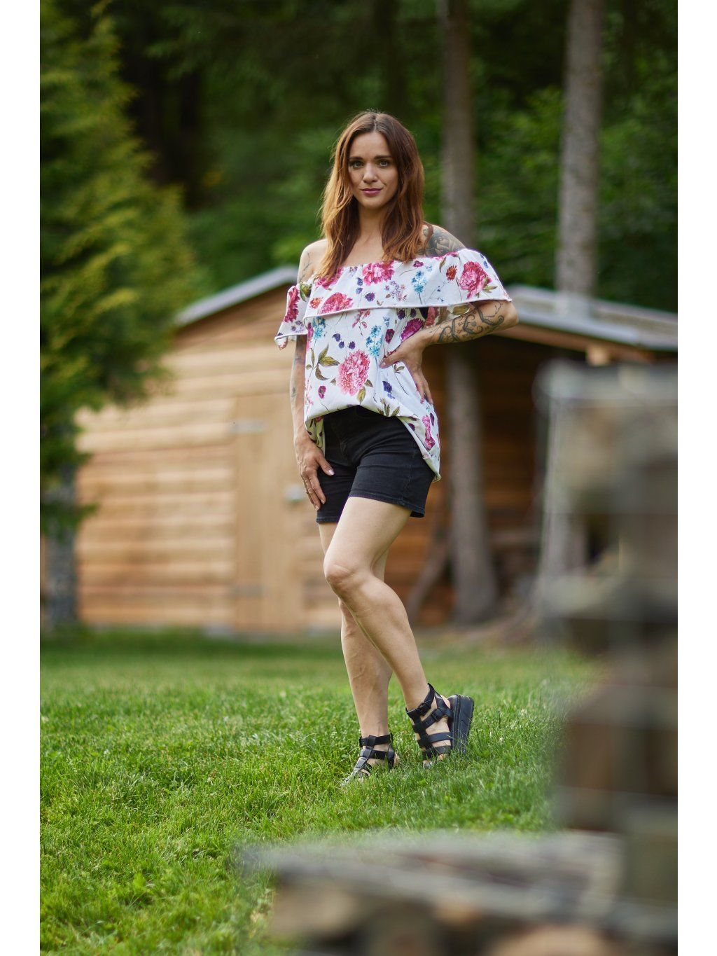 Letní volné tričko z příjemného materiálu, které se dají nosit na několik způsobů. Materiál je jemný bavlněný úplet s elastanem s potiskem květin.