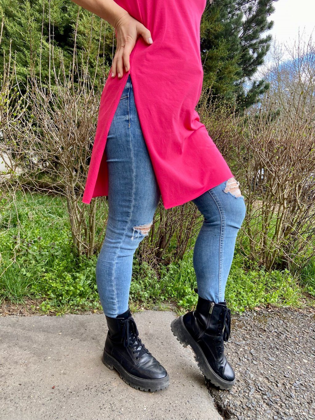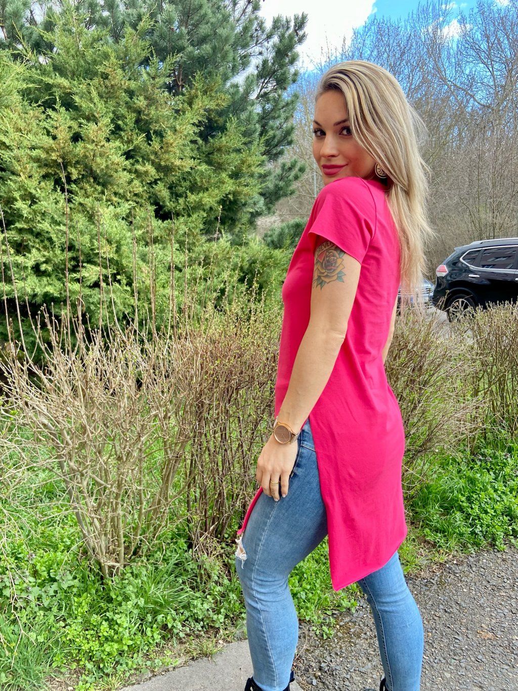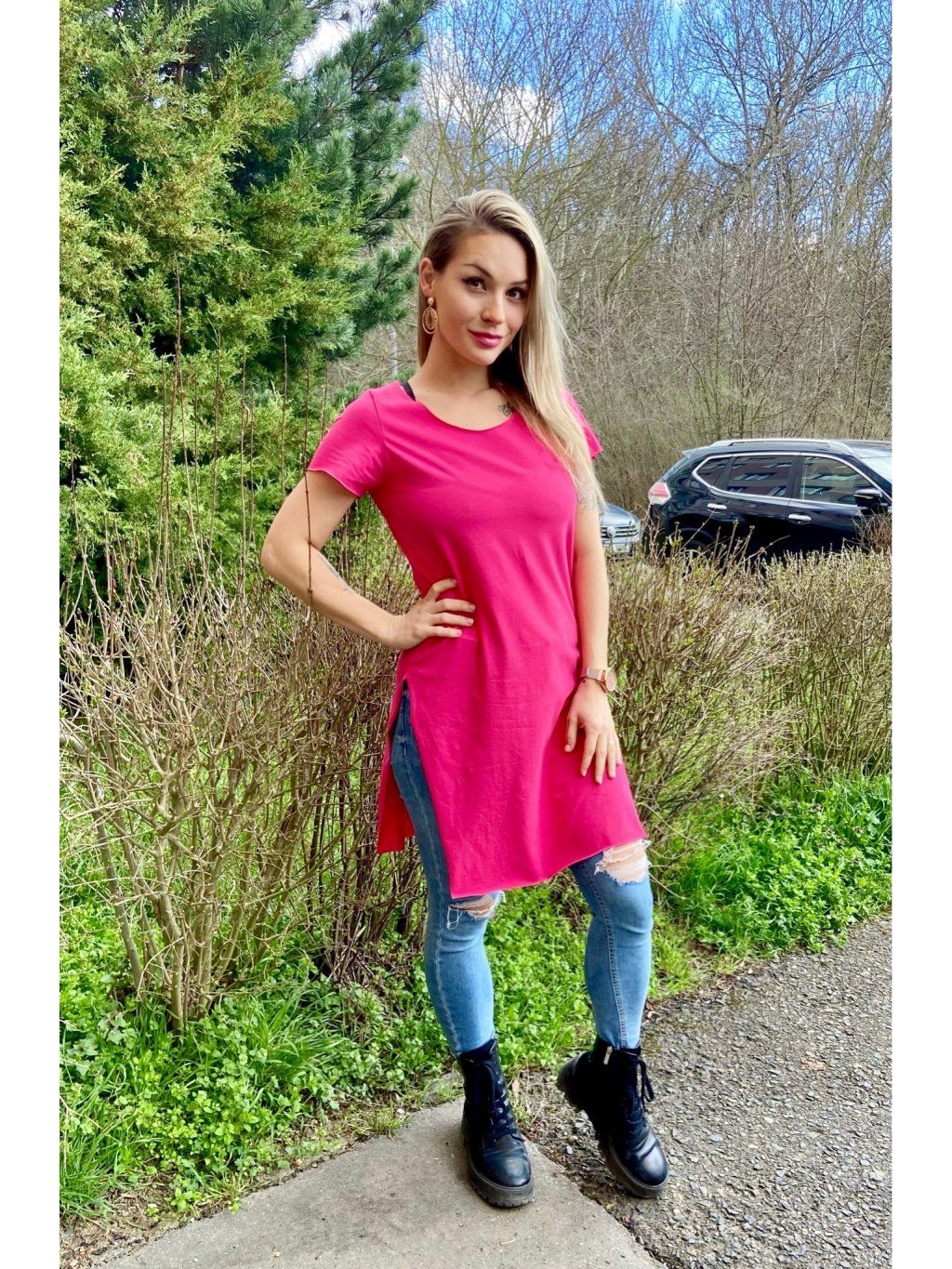 Naše DEPP  trička mají delší, pohodlný střih, hlubší výstřih a dva vysoké postranní rozparky. Tričko je na krajích nezačištěné. Materiál je slabší bavlněný úplet s elastanem.