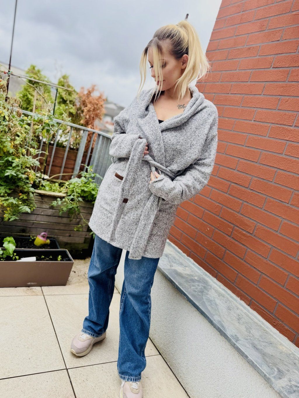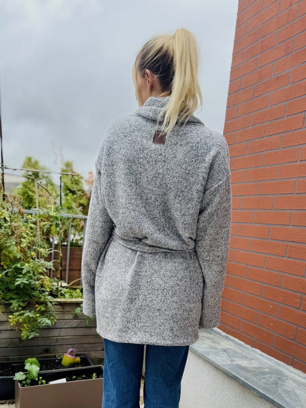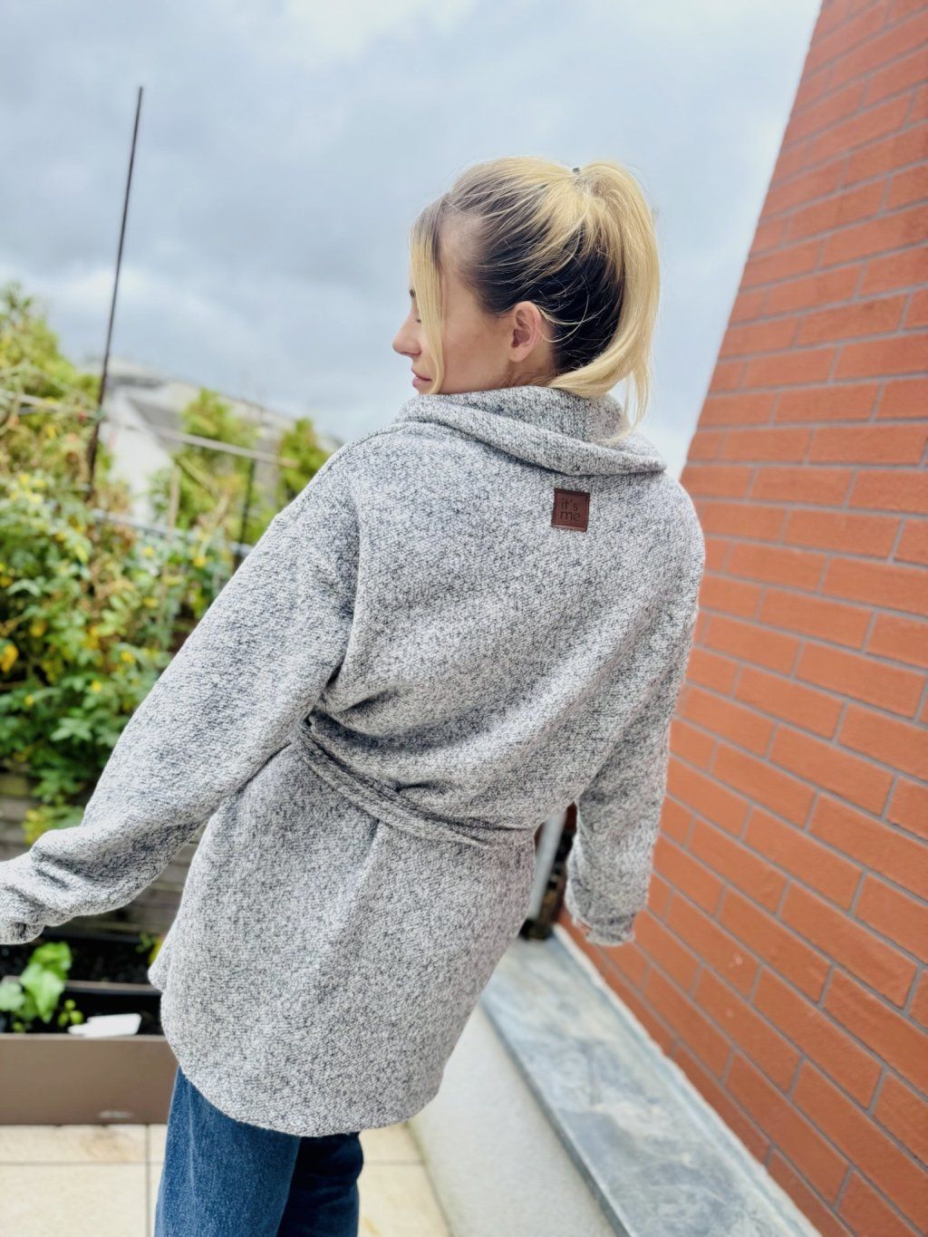 Podzimní oversize kabát je ušitý z příjemného bavlněného úpletového materiálu. Zvenku má našité dvě kapsy. Rukávy mohou být na ohrnutí nebo v oversize stylu. Kabát je dvojitý, takže krásně zahřeje. Je k němu pásek ze stejného materiálu.