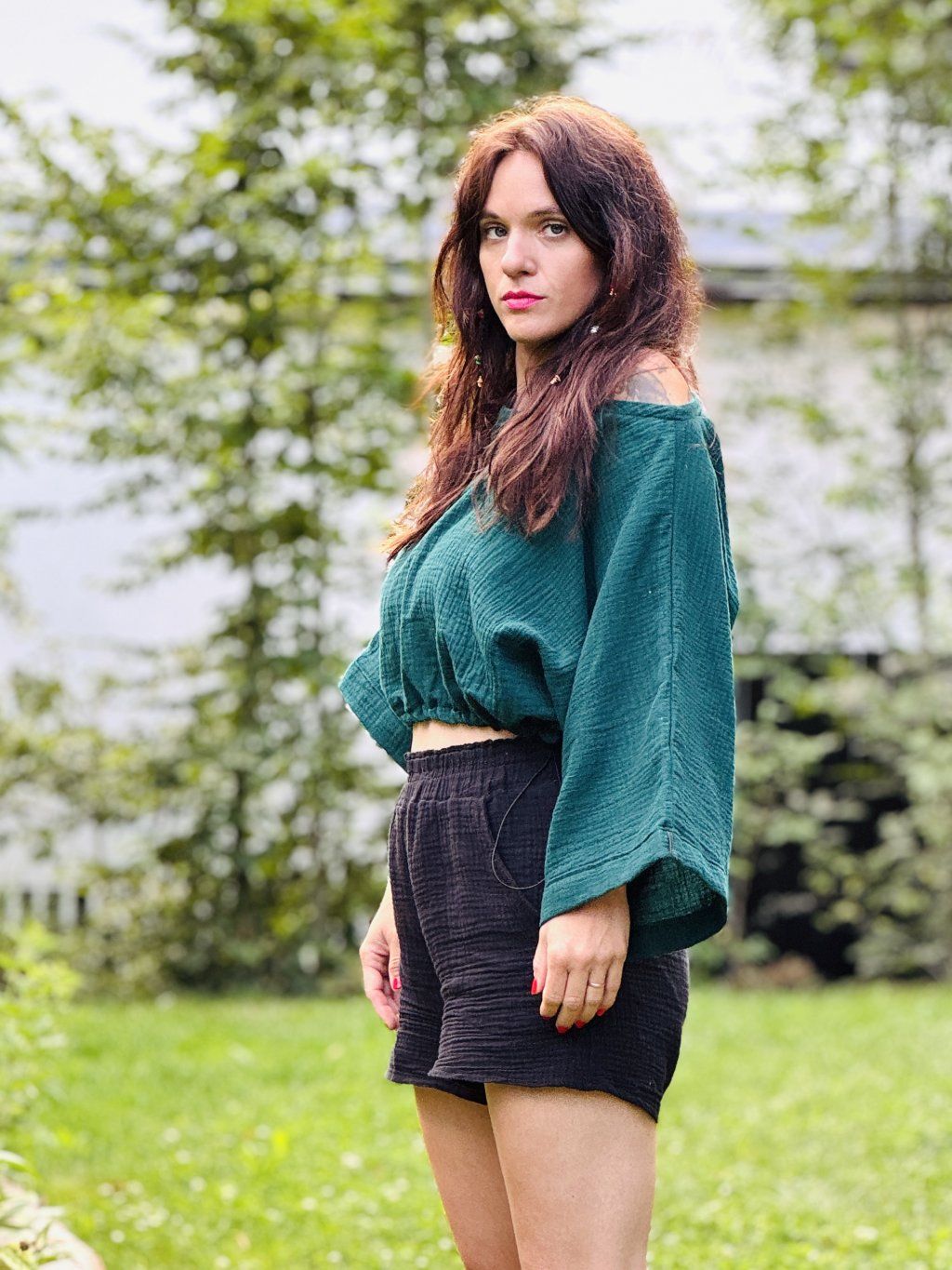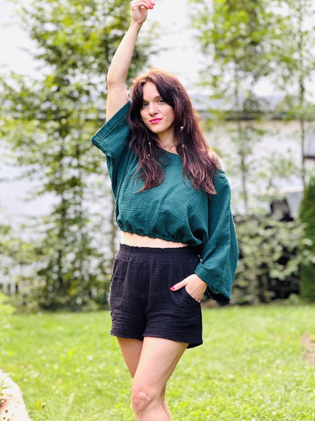 Top je ušitý z bavlněného mušelínu. V pase je nastavitelný gumičkou. Uni velikost sedí od XS do XL.