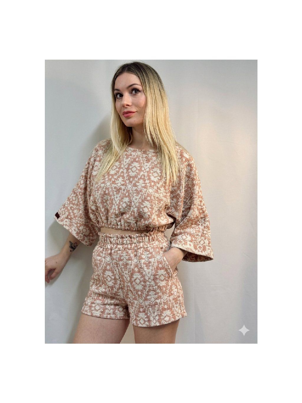 Top je ušitý z bavlněného mušelínu. V pase je nastavitelný gumičkou. Uni velikost sedí od XS do XL.