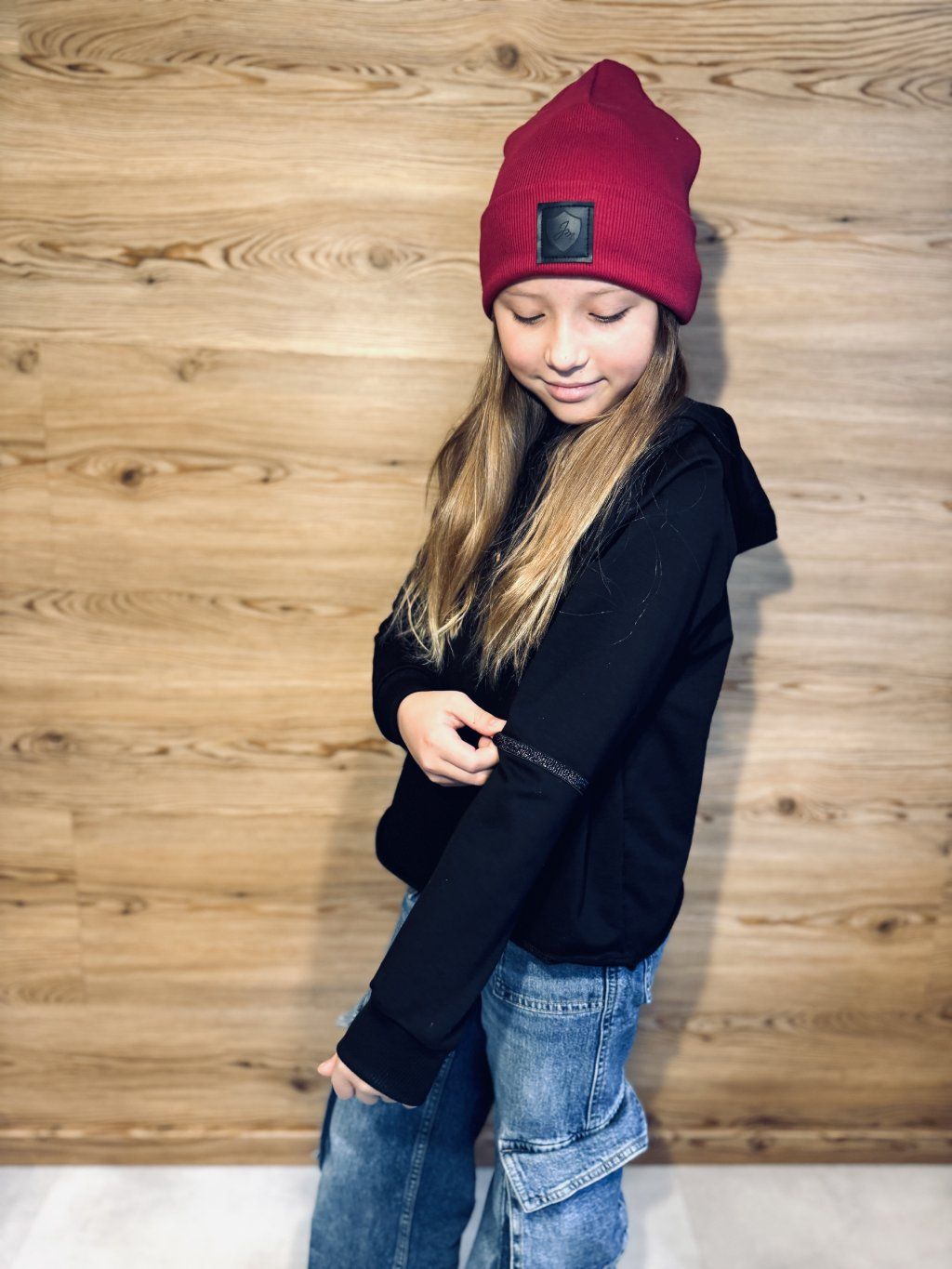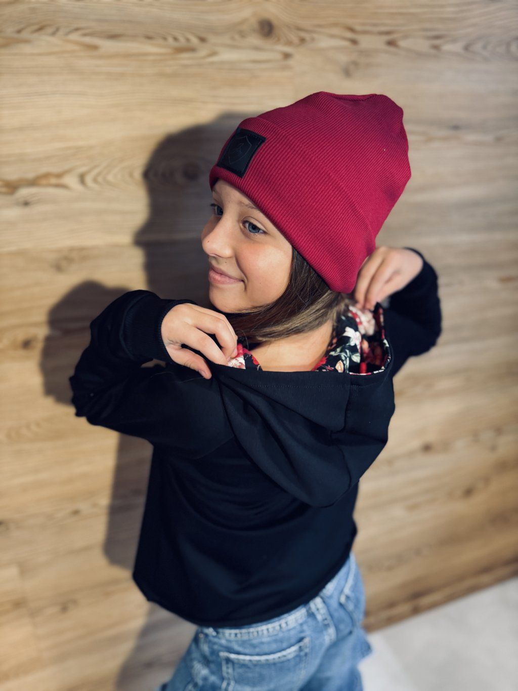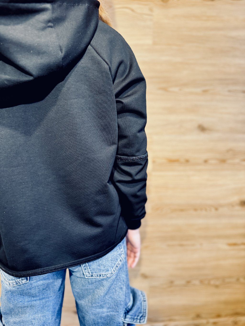 Krátší oversize mikina s kapucí. Materiál je černá bavlněná teplákovina s elastanem v kombinaci s úpletem s potiskem květů. Na rukávech je zdobená černým, třpytivým proužkem. Rukávy jsou zakončené do černých nápletů.