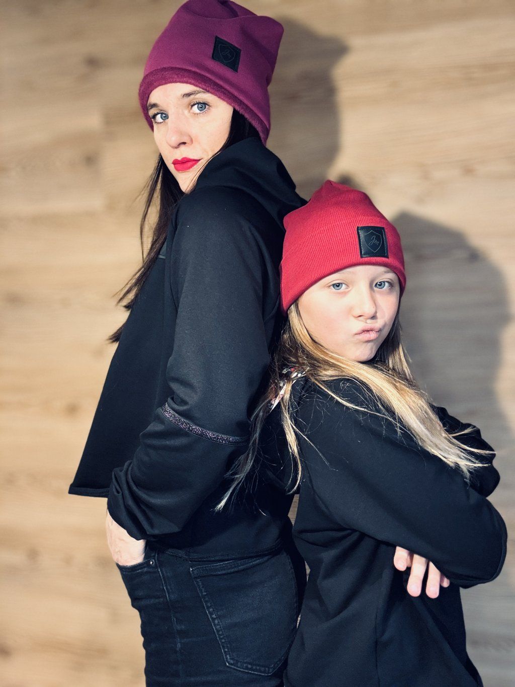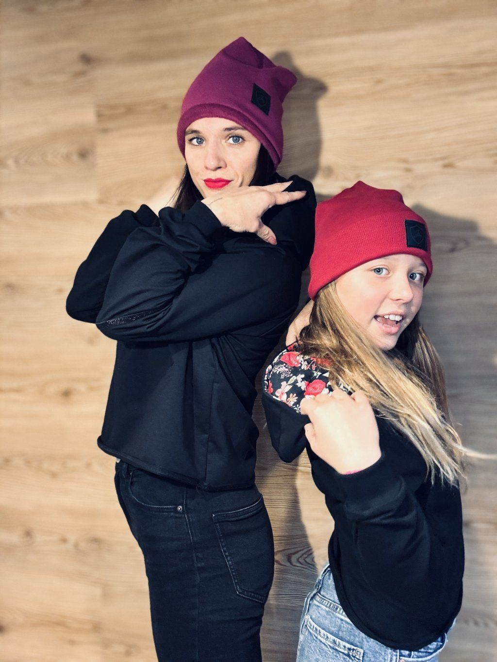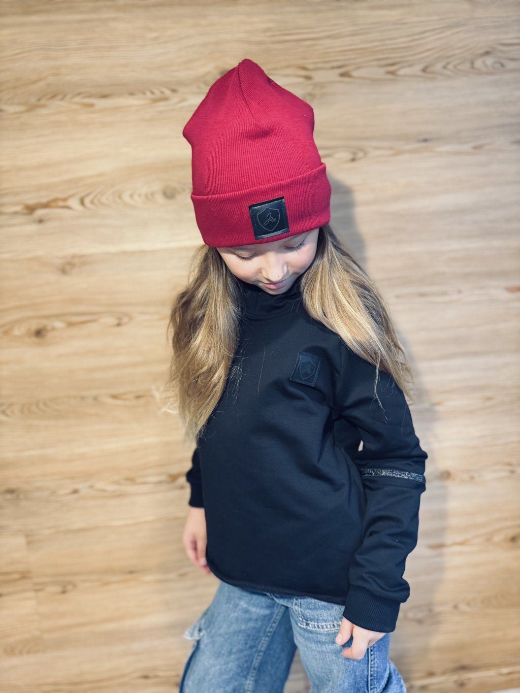 Krátší oversize mikina s kapucí. Materiál je černá bavlněná teplákovina s elastanem v kombinaci s úpletem s potiskem květů. Na rukávech je zdobená černým, třpytivým proužkem. Rukávy jsou zakončené do černých nápletů.