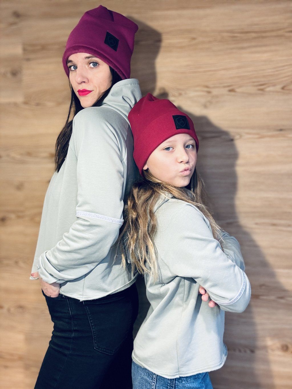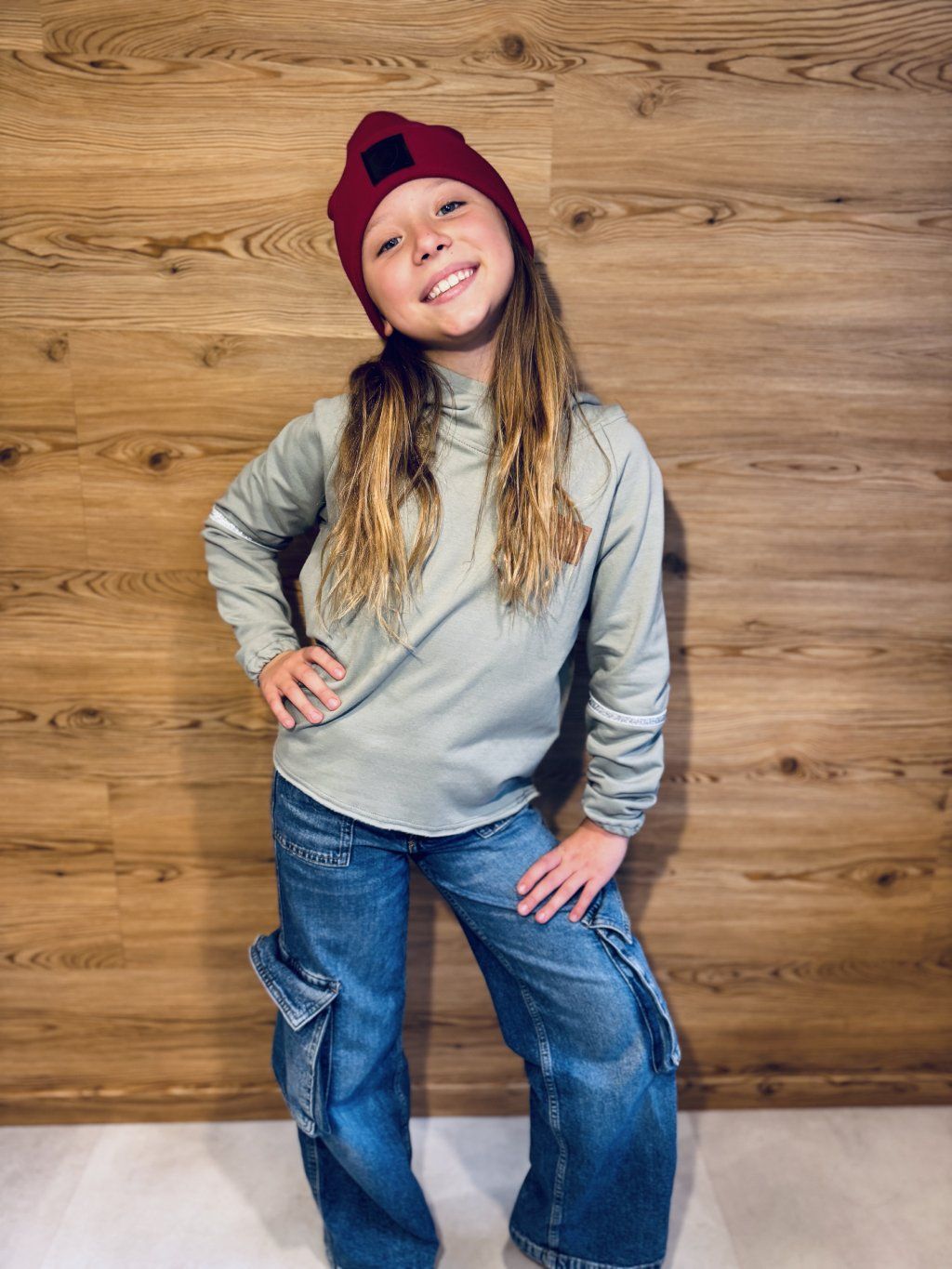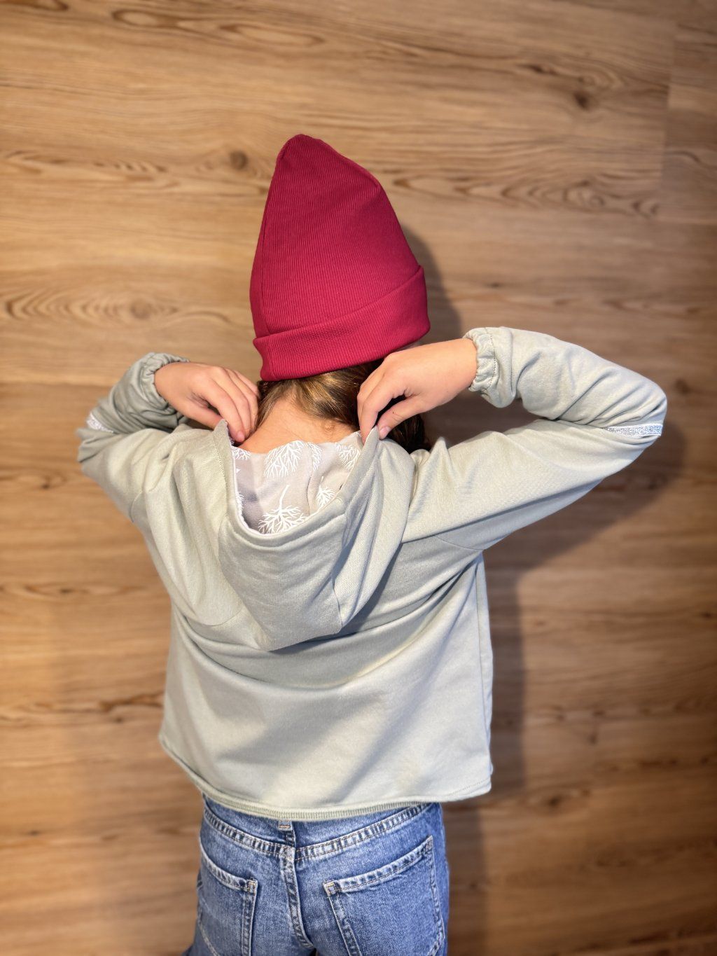 Krátší oversize mikina s kapucí. Materiál je bavlněná, počesaná teplákovina s elastanem v kombinaci s šedou teplákovinou se stromky. Na rukávech je zdobená stříbrným proužkem.