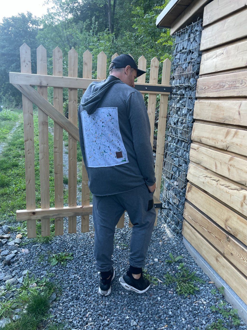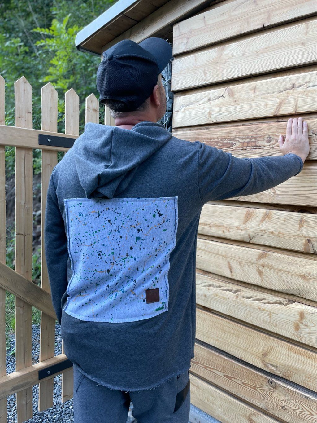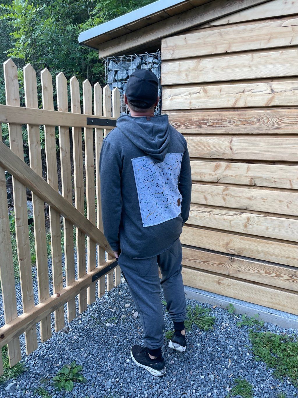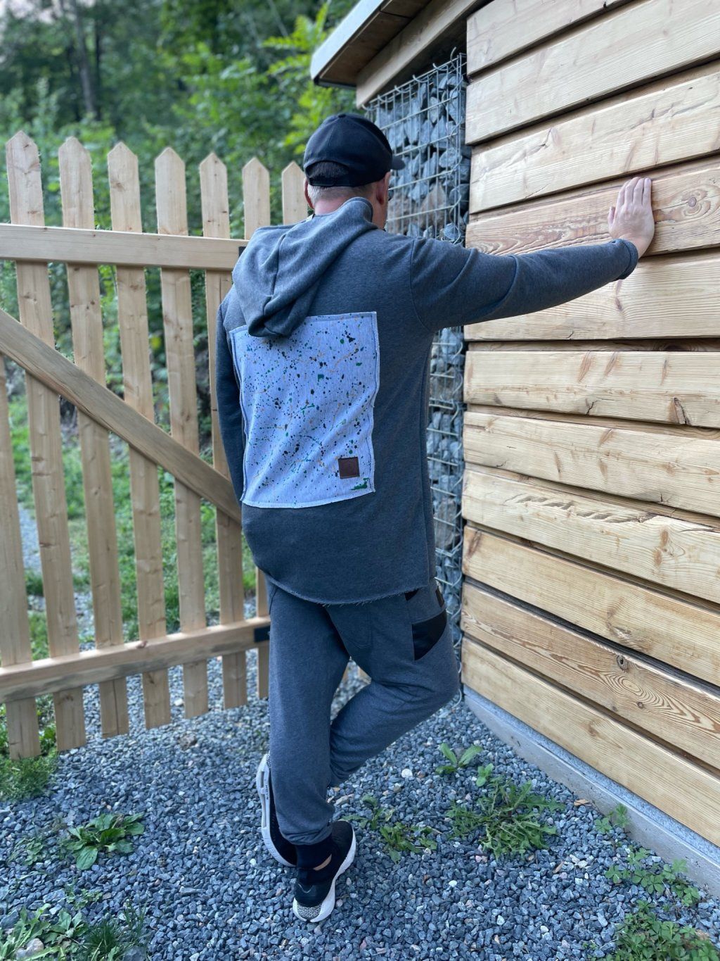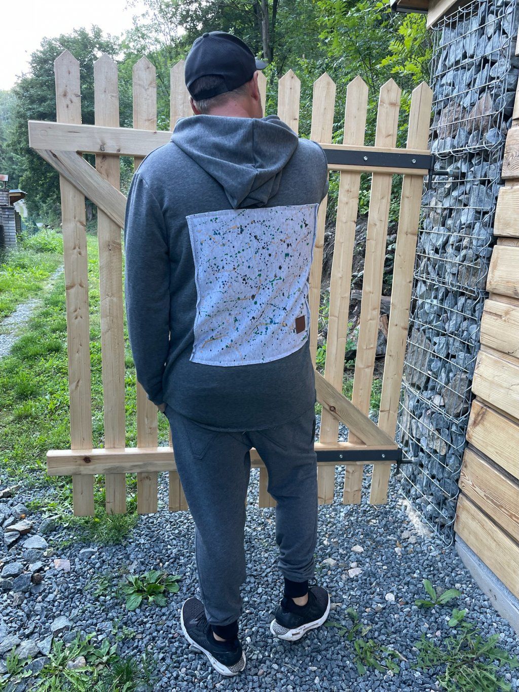 Stylová mikina má spíše volnější střih, je ušitá z tmavě šedé teplákoviny, která se na okrajích třepí. Mikina má kapuci a vzadu obrázek, který zvlášť kreslíme, takže každý je originál.