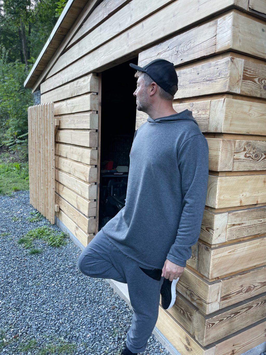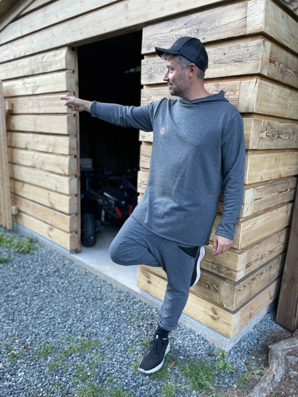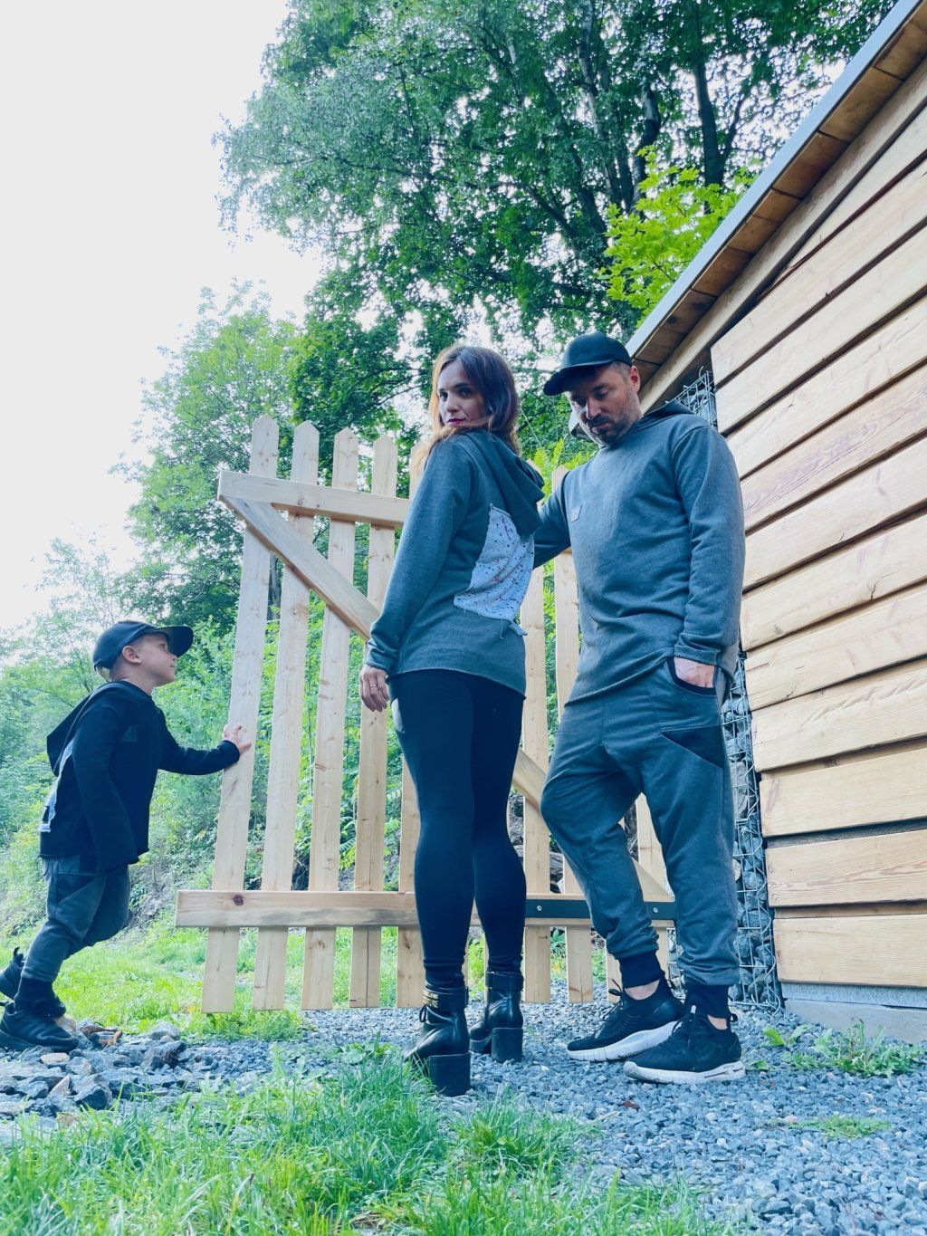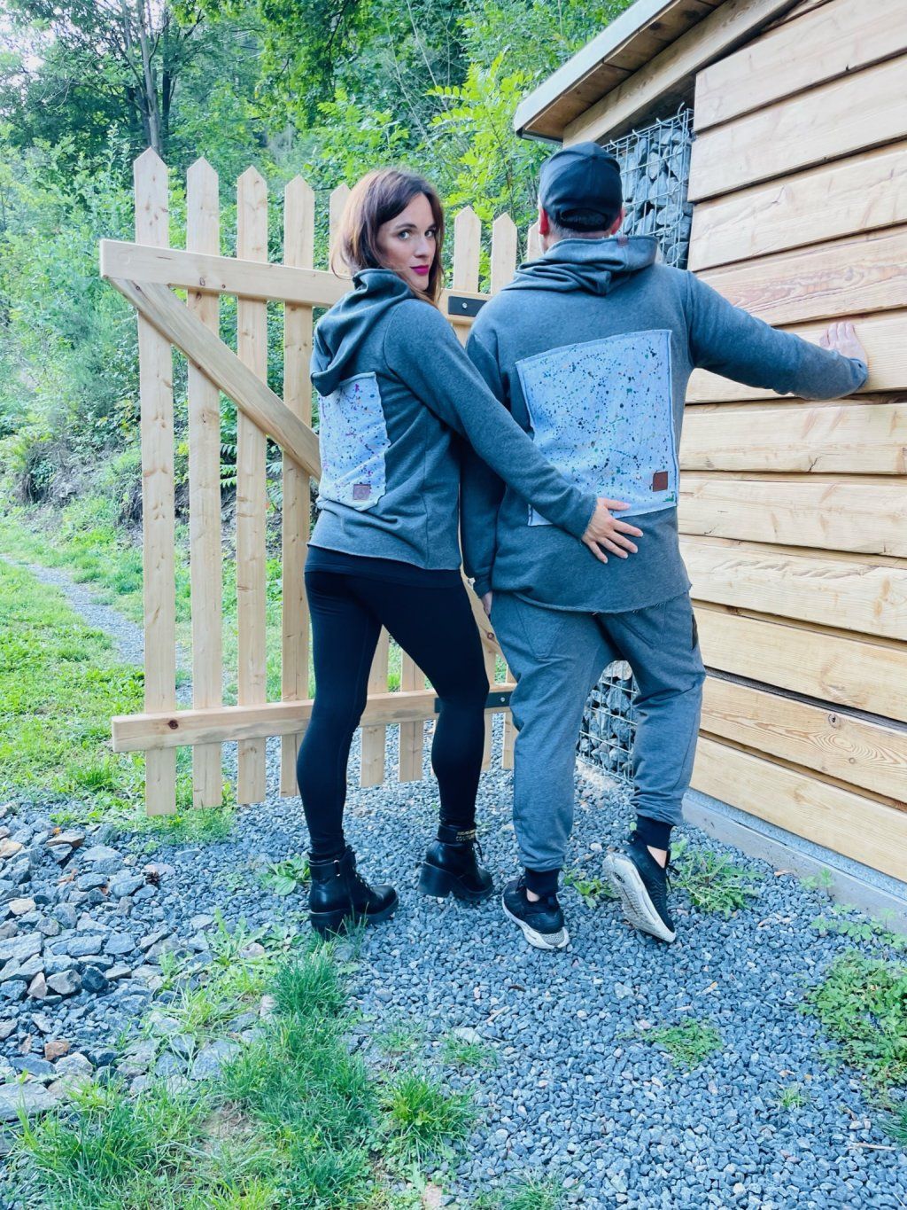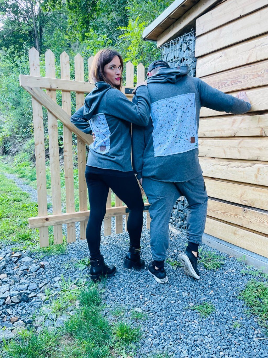 Stylová mikina má spíše volnější střih, je ušitá z tmavě šedé teplákoviny, která se na okrajích třepí. Mikina má kapuci a vzadu obrázek, který zvlášť kreslíme, takže každý je originál.