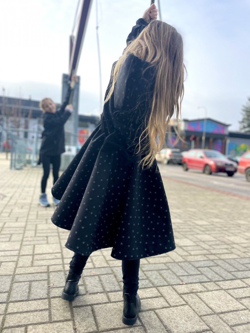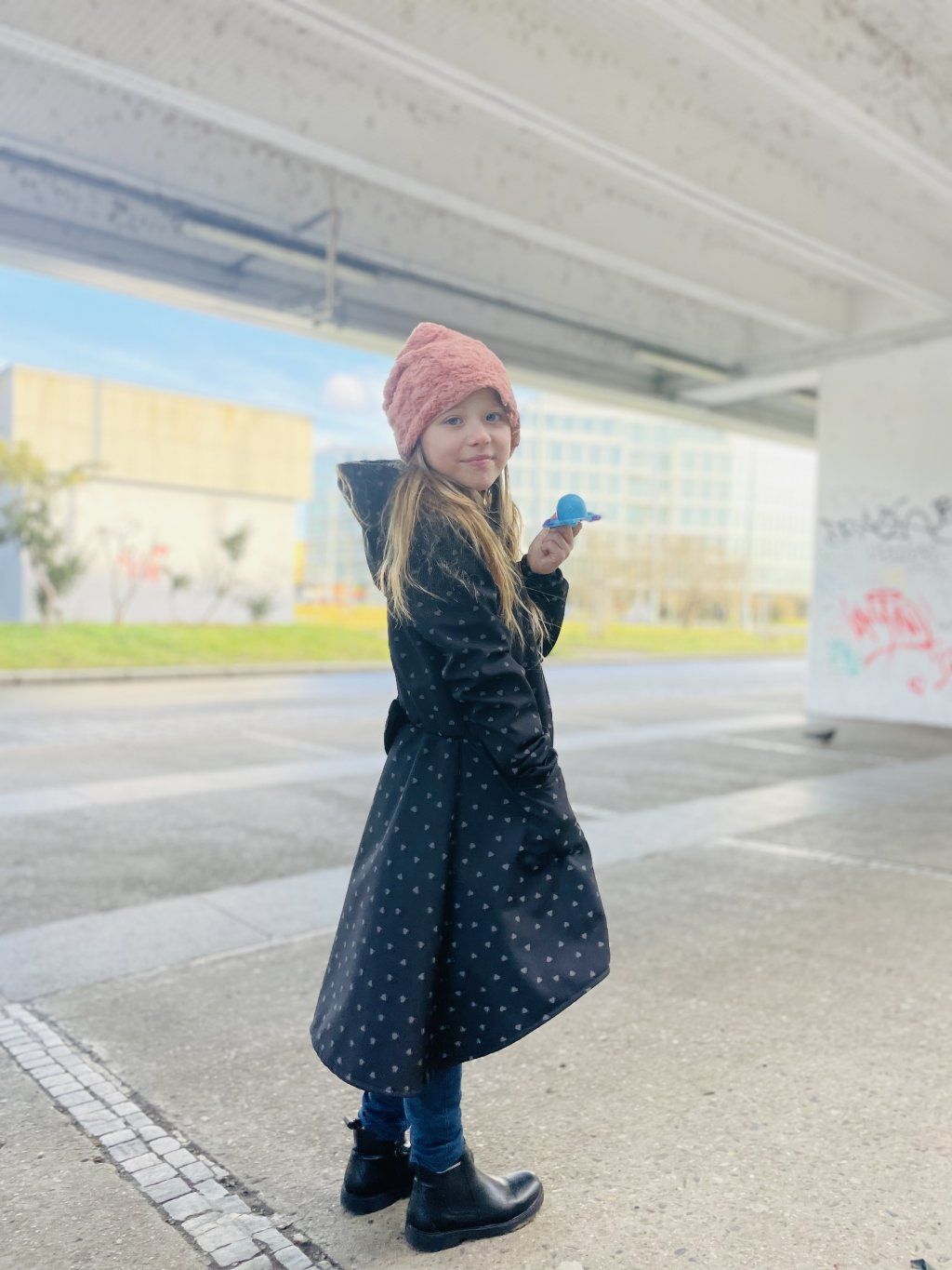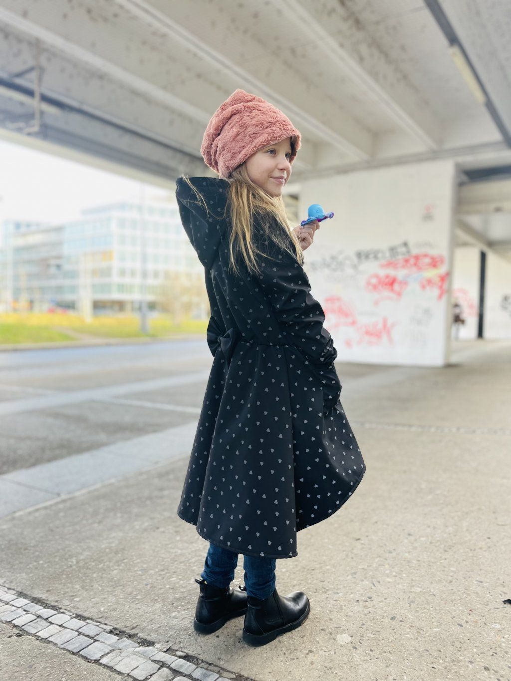 Má okrasnou nabíranou sukni a vzadu barevnou mašli. Vpředu je na zip do sportovnějšího stylu s roztomilými kapsami. Kabátek se dá nosit na jaře (přes tričko), na podzim, s teplejšími vrstvami i v zimě.