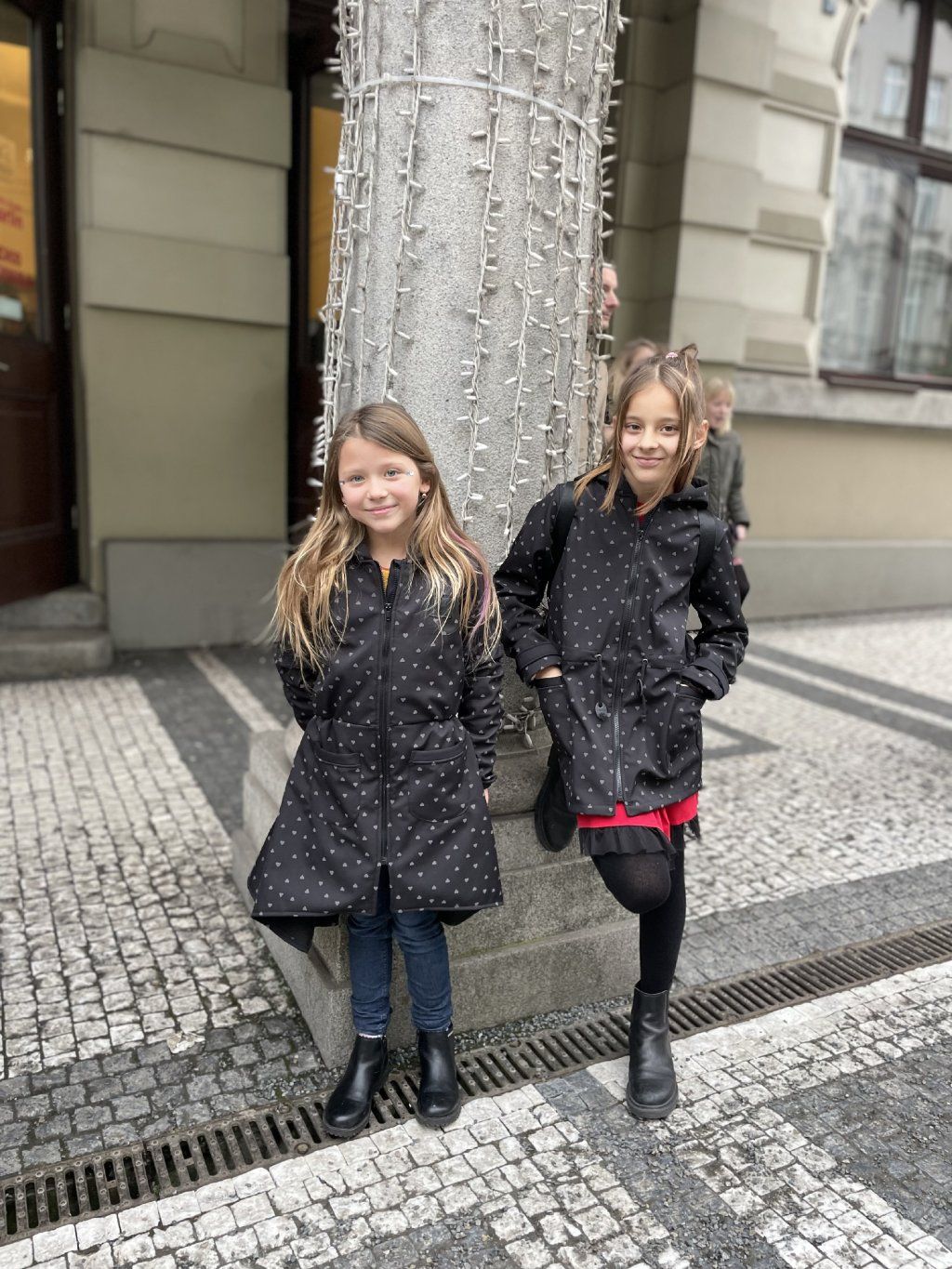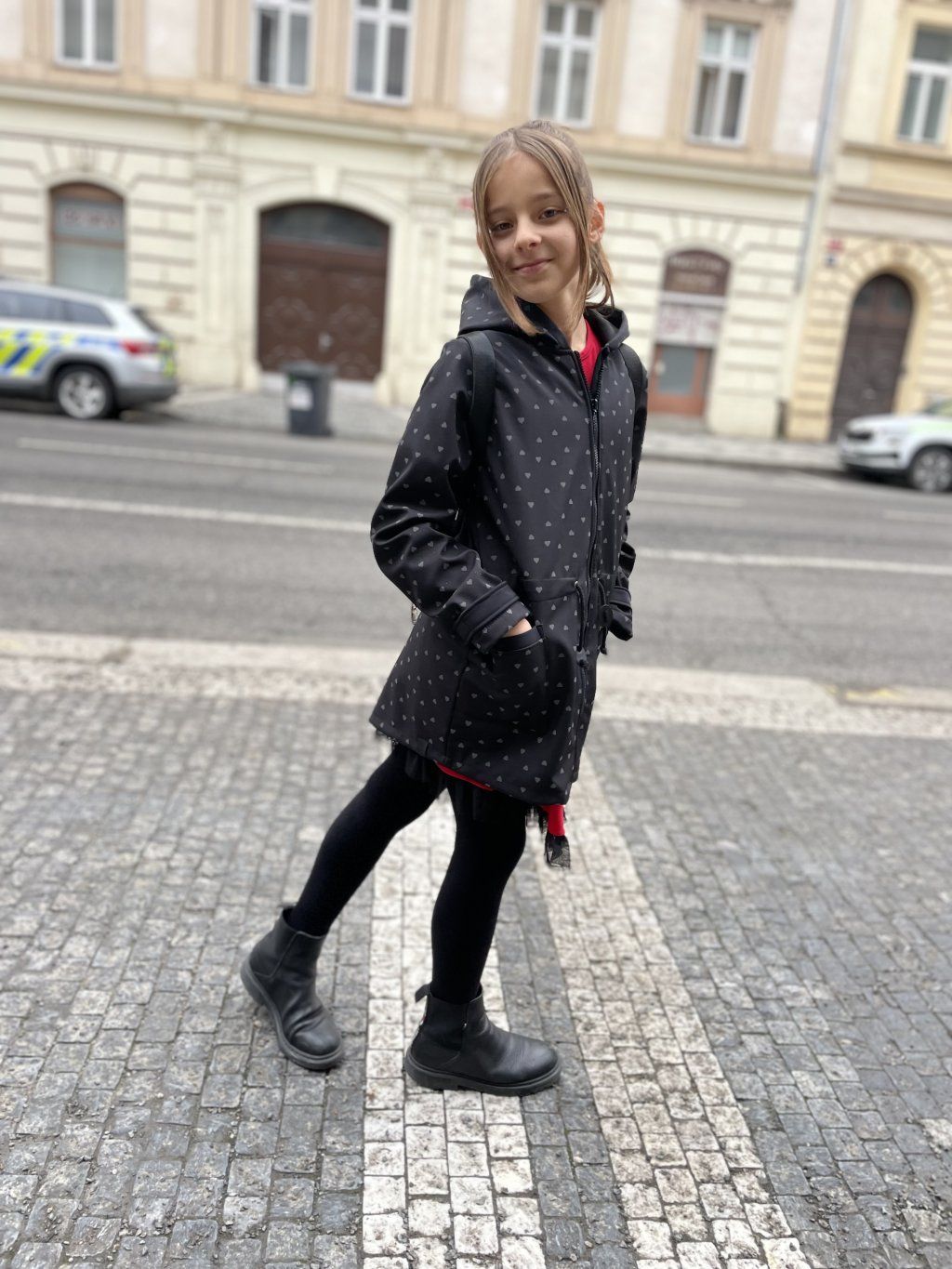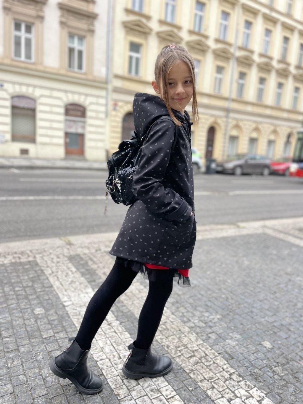 Softshellová bunda je ušitá z černého softshellu se silnějším fleecem, na sobě má potisk srdíček, které se po nasvícení lesknou. V pase má bunda tunýlek na stažení šňůrkou.