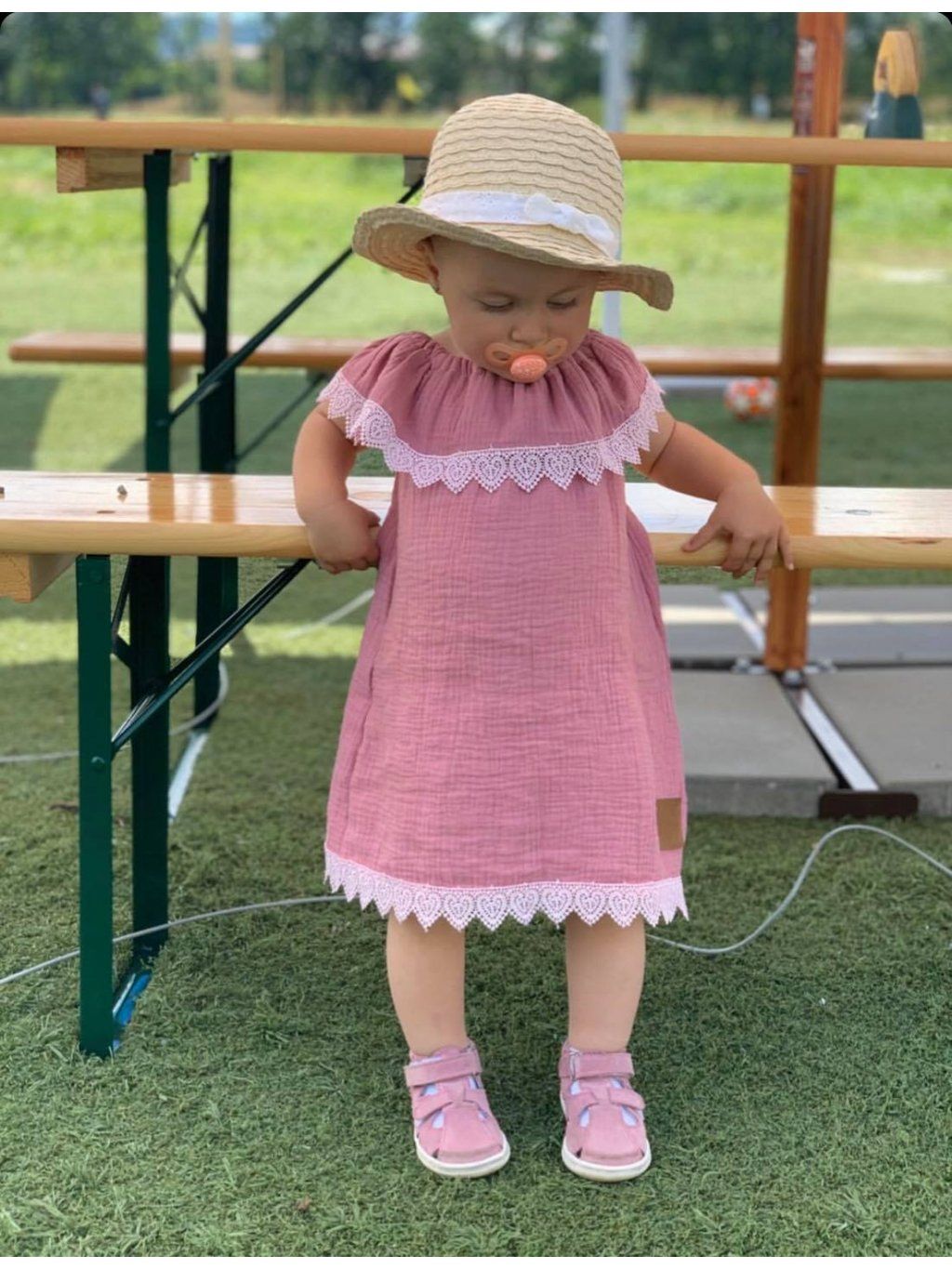 Šaty mají áčkový střih a bohatý kanýr na gumičku okolo krku. Jsou zdobené krajkou.