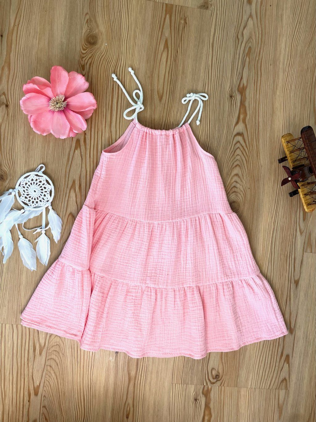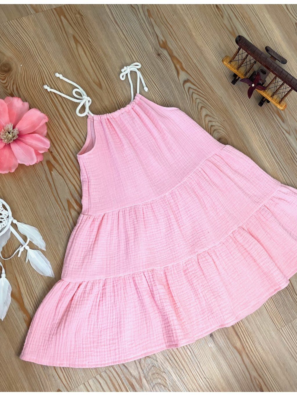 Šaty jsou ušité z prémiového mušelínu. Šaty mají dva bohaté volany.