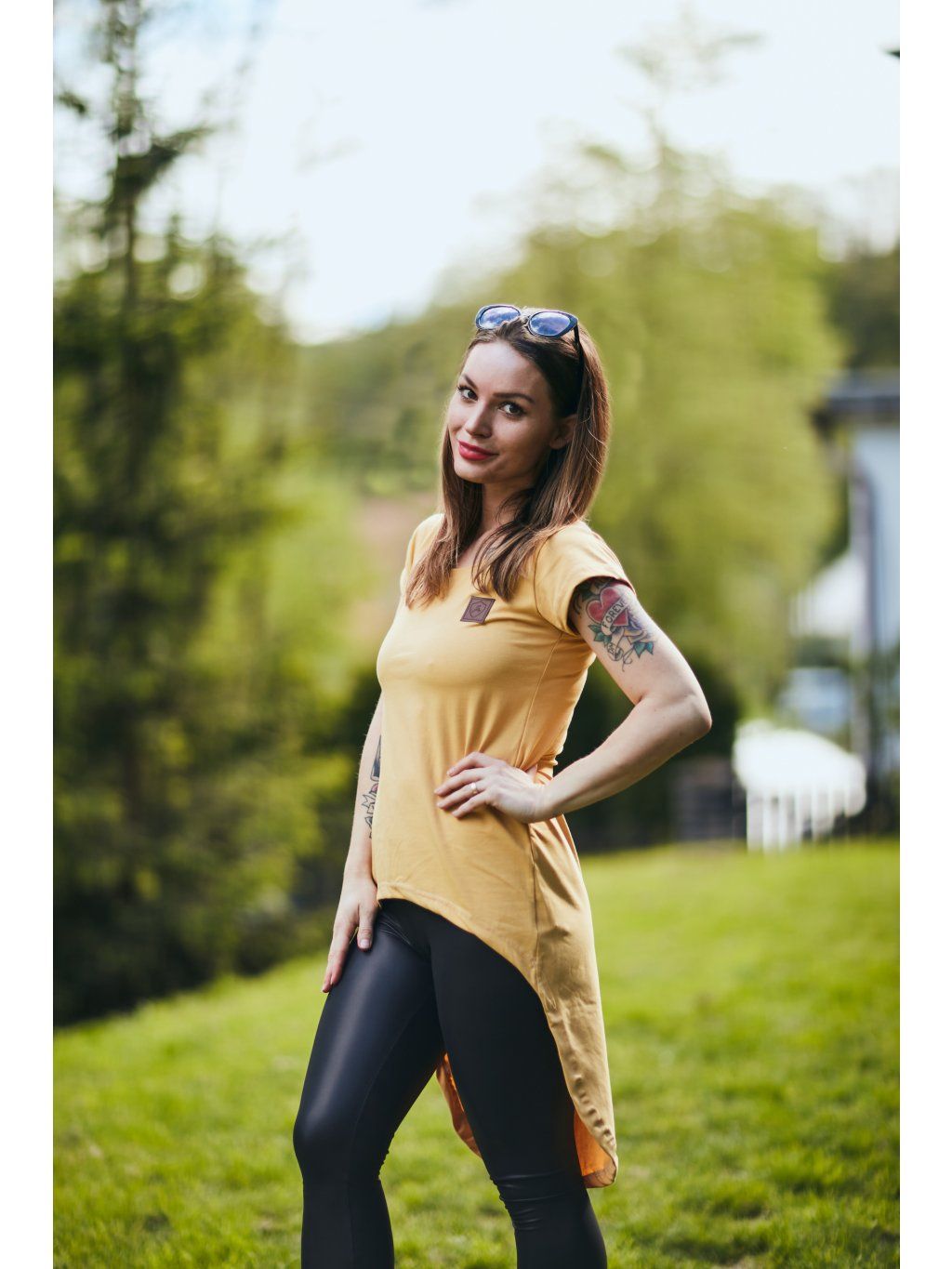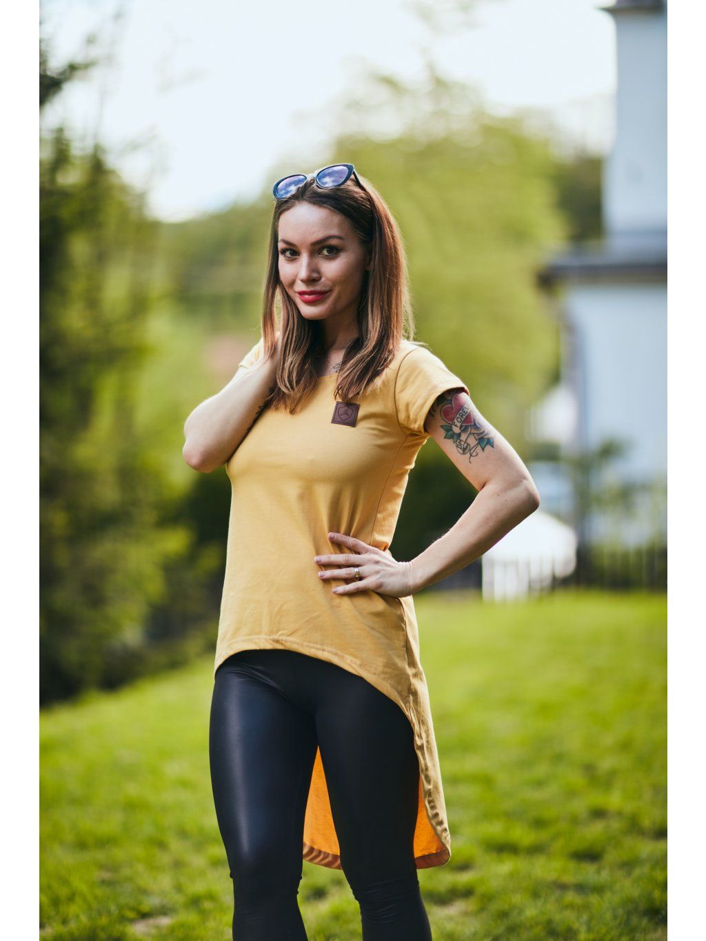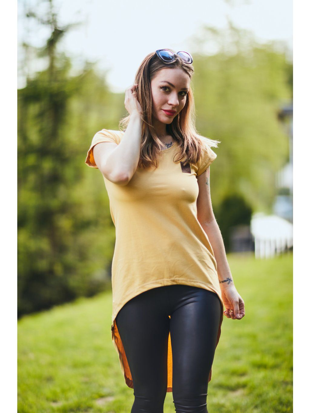 Tričko je vpředu kratší a vzadu delší. Tričko má krátký rukáv.