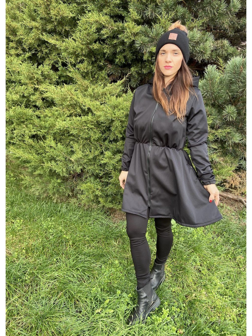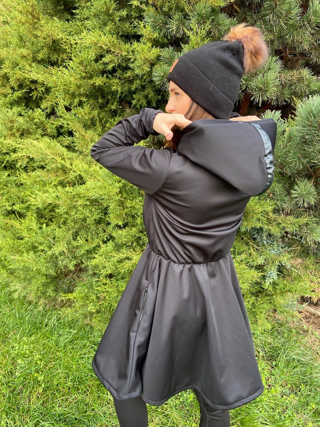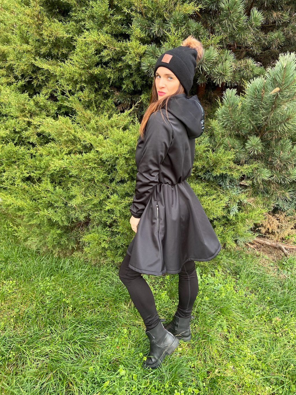 Má okrasnou nabíranou sukni. Vpředu je na zip a postranách ve švech má kapsy na zip. Přes kapuci je pruhy z černé koženky. Podložení pod zip je také z černé koženky.