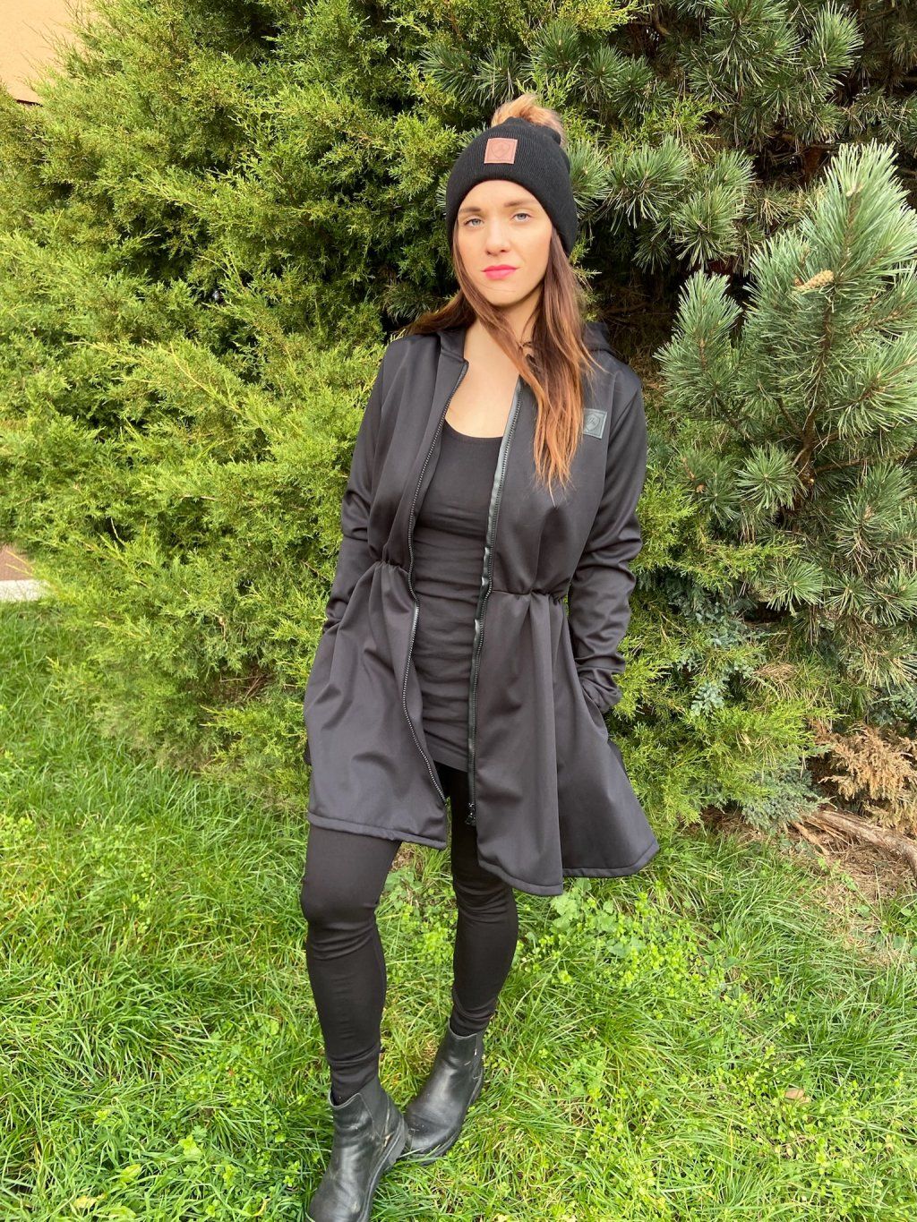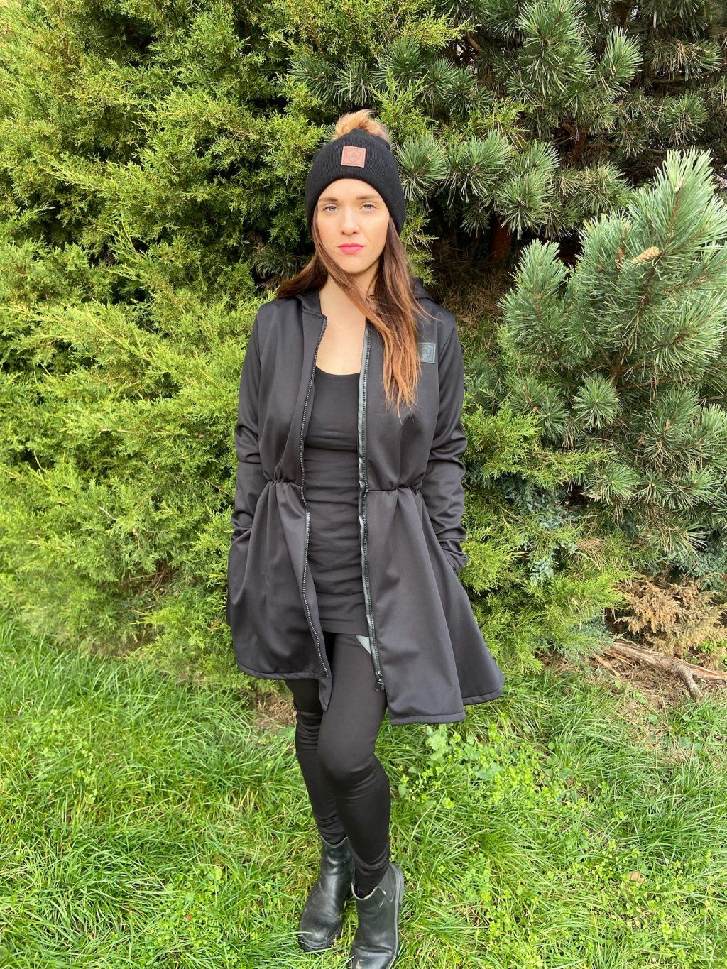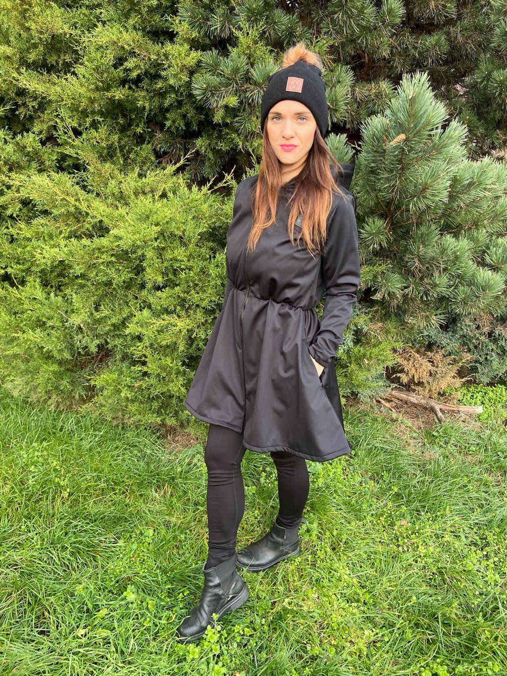 Má okrasnou nabíranou sukni. Vpředu je na zip a postranách ve švech má kapsy na zip. Přes kapuci je pruhy z černé koženky. Podložení pod zip je také z černé koženky.
