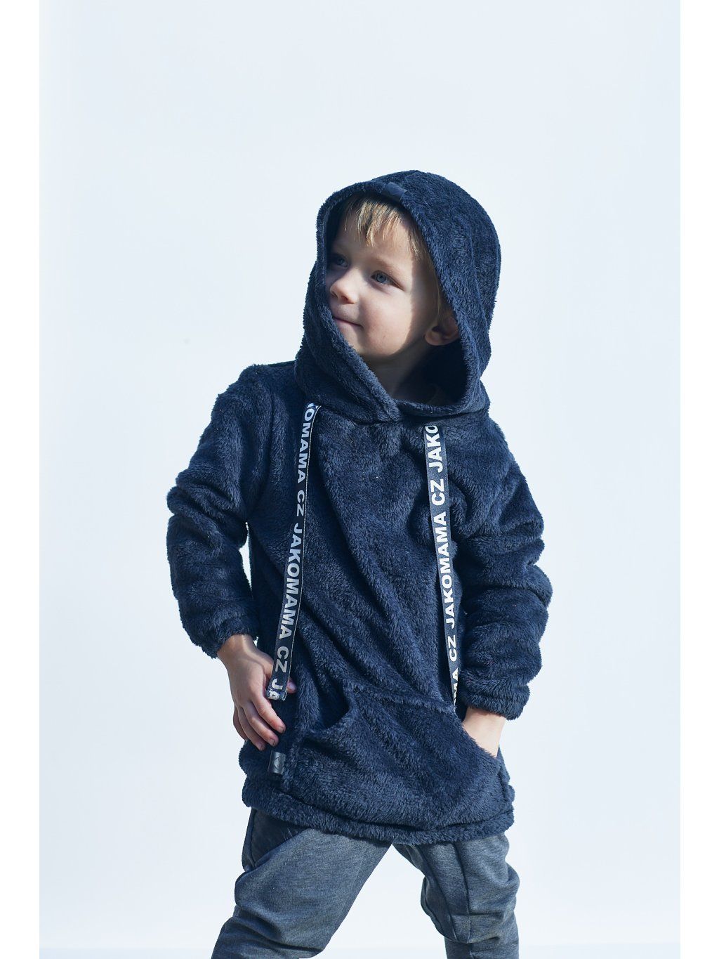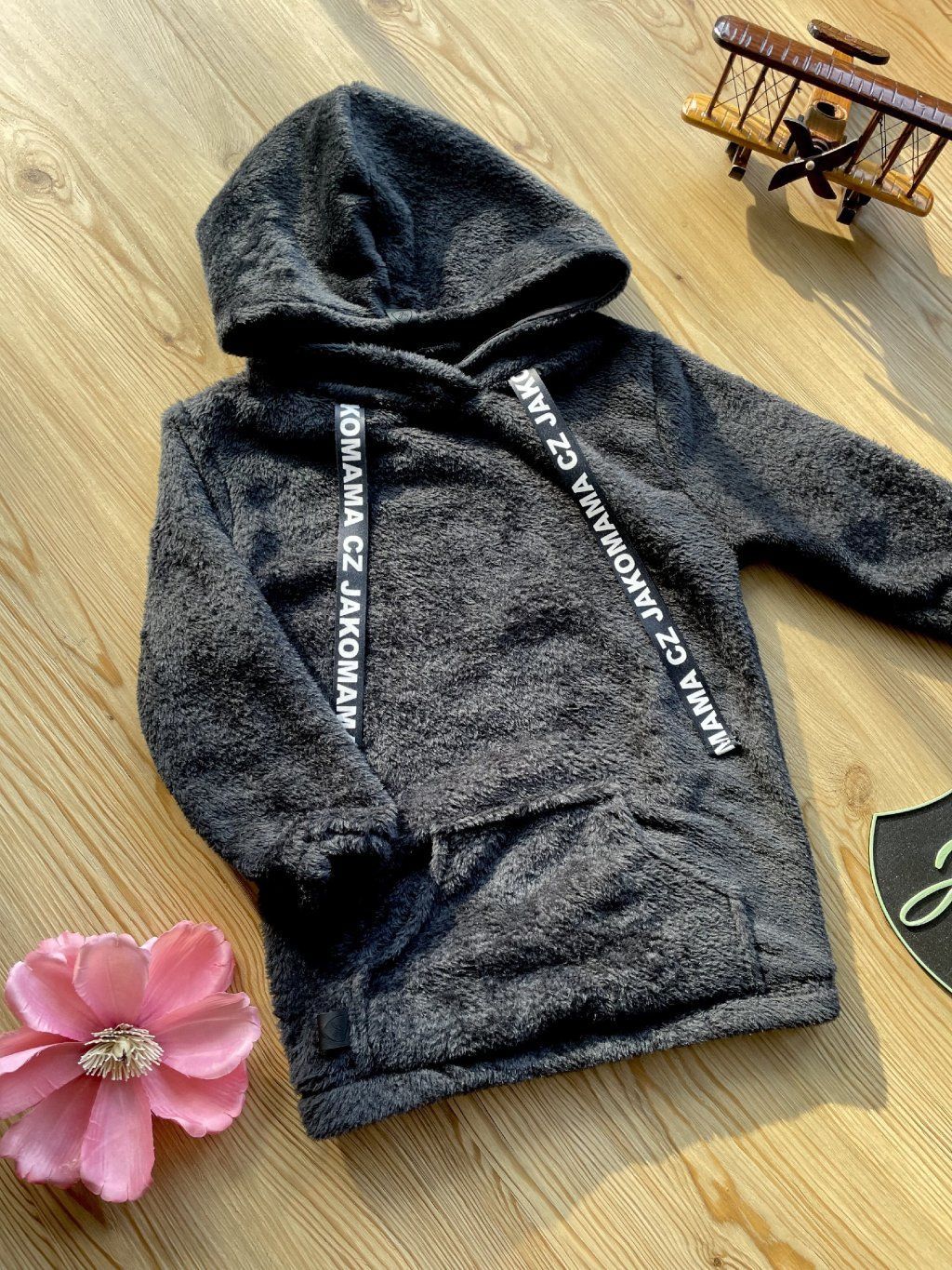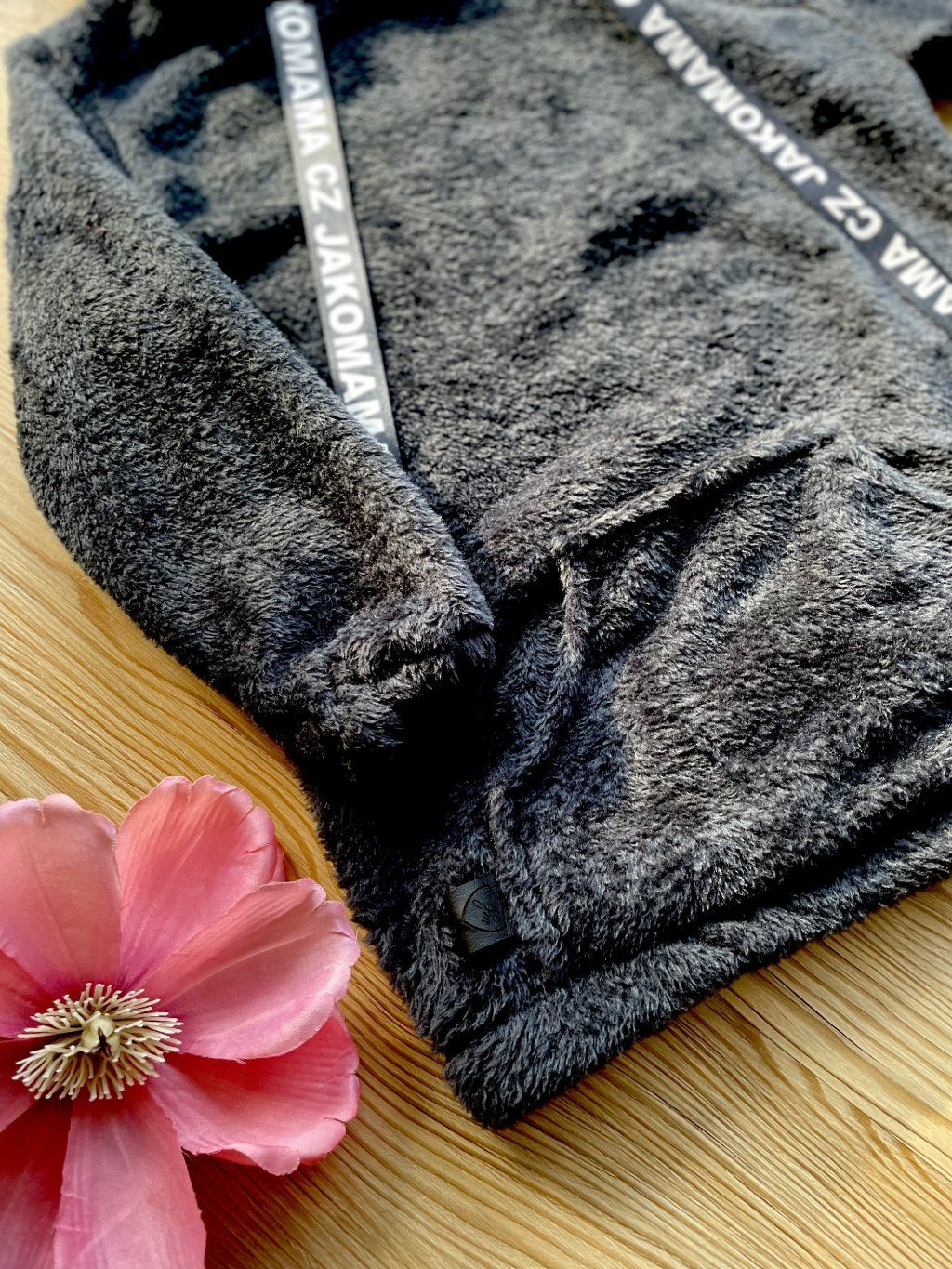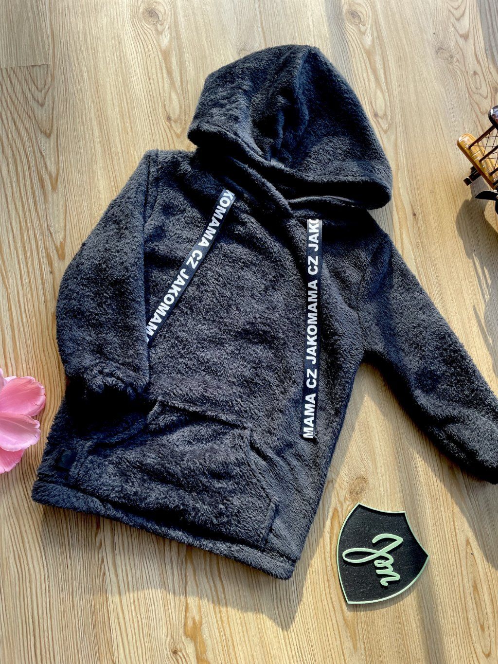 Teploučká zimní mikina má volnější a delší střih. Je ušitá z černého chlupatého fleecu. Spodní lem a rukávy jsou zakončené gumičkou. Mikina má kapuci a vpředu kapsu ze stejného materiálu. Ozdobená je vpředu saténovou stuhou s nápisem JAKOMAMA CZ.