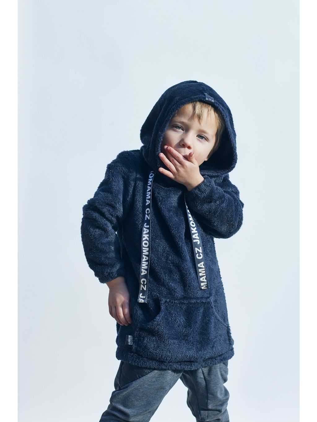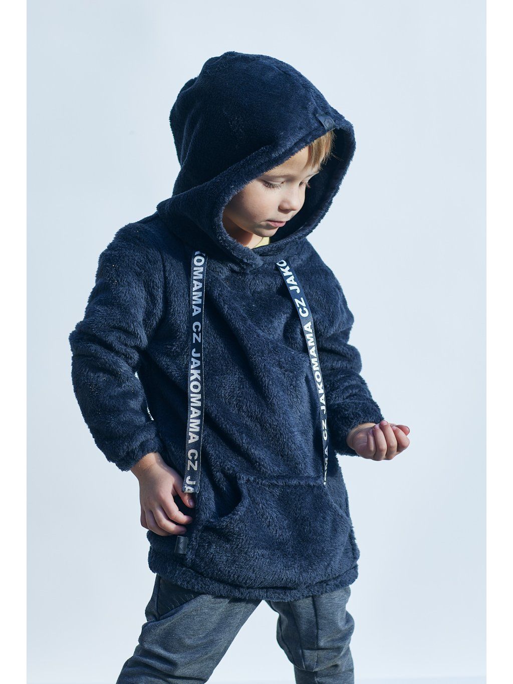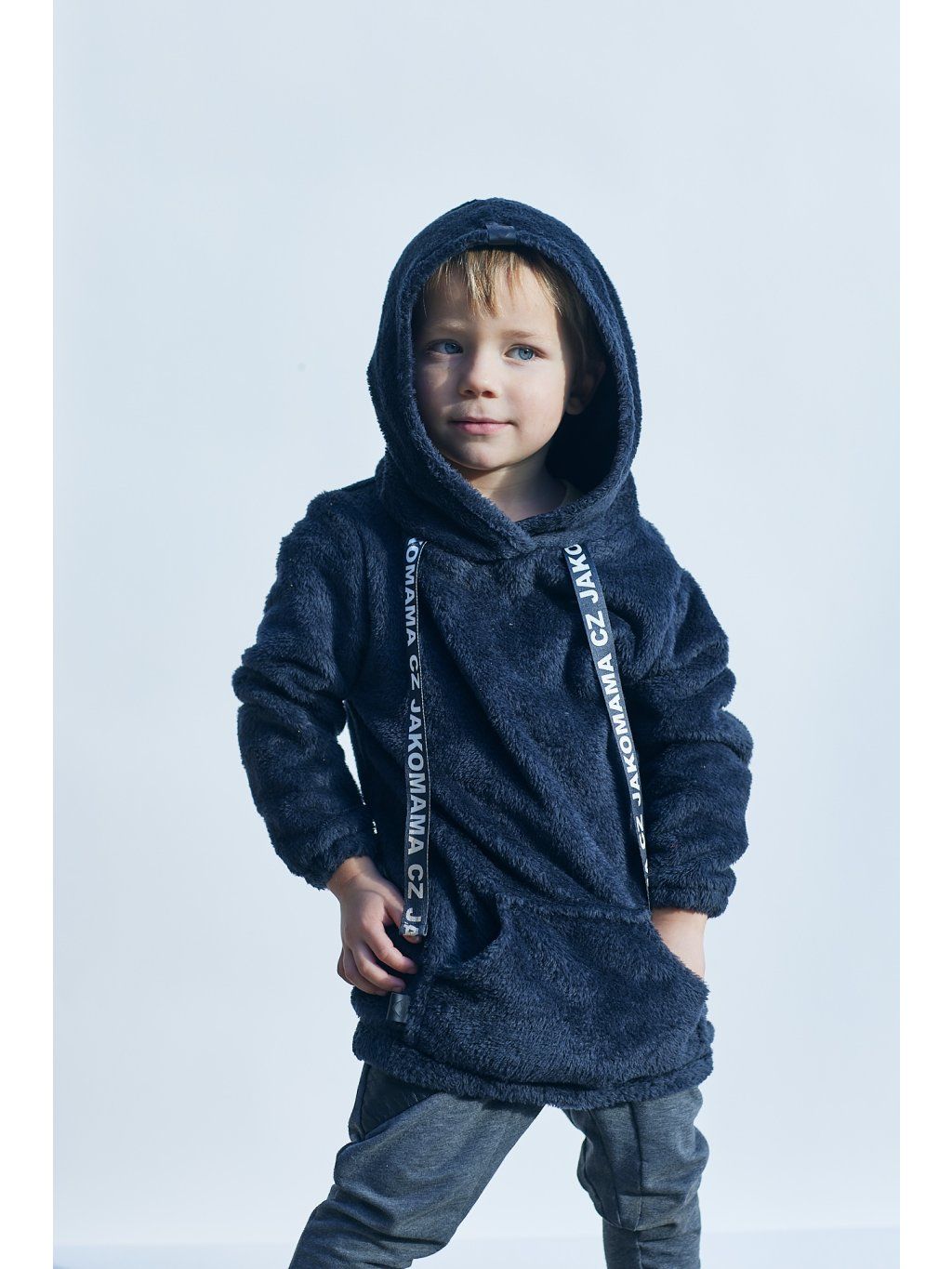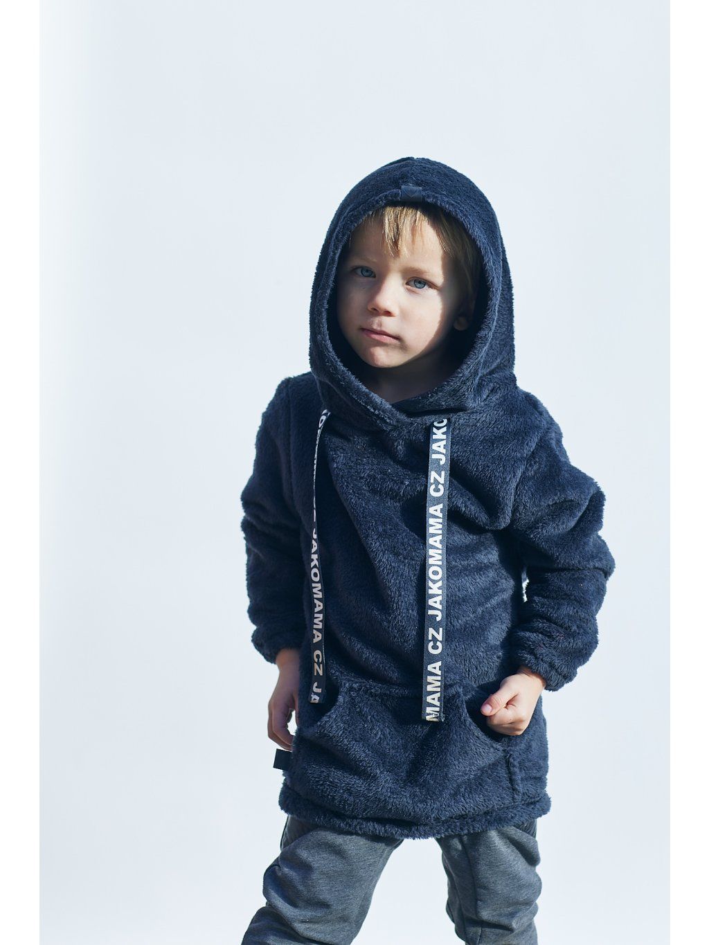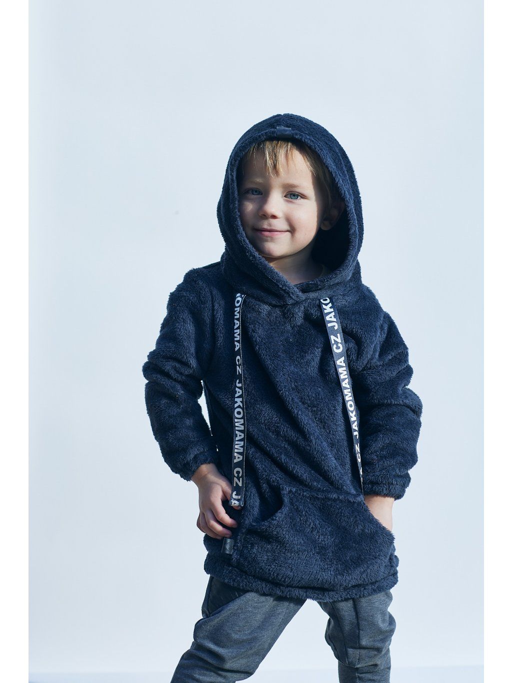 Teploučká zimní mikina má volnější a delší střih. Je ušitá z černého chlupatého fleecu. Spodní lem a rukávy jsou zakončené gumičkou. Mikina má kapuci a vpředu kapsu ze stejného materiálu. Ozdobená je vpředu saténovou stuhou s nápisem JAKOMAMA CZ.