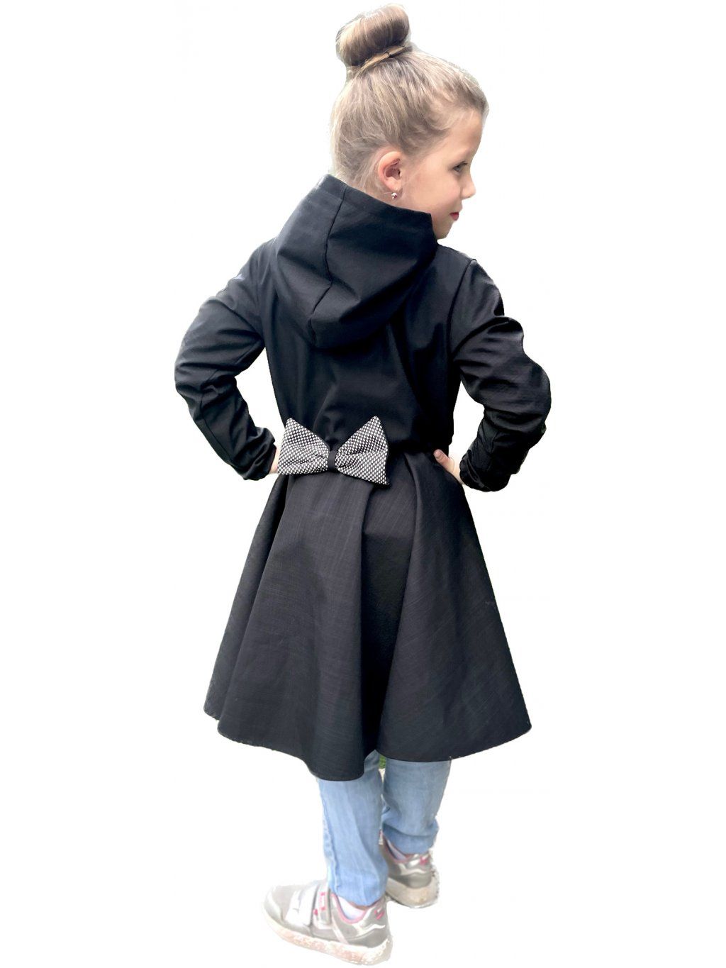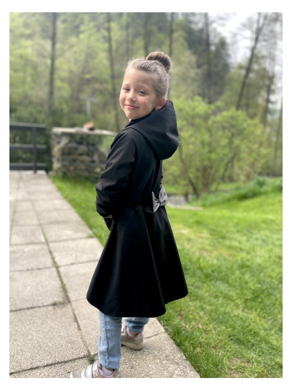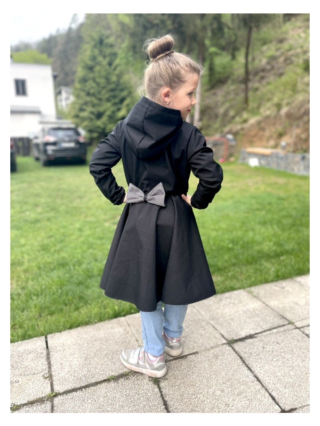 Má okrasnou nabíranou sukni a vzadu mašli. Vpředu je na zip do sportovnějšího stylu s roztomilými kapsami. Barva je černá se vzorkem. Kabátek se dá nosit na jaře, na podzim, s teplejšími vrstvami i v zimě.