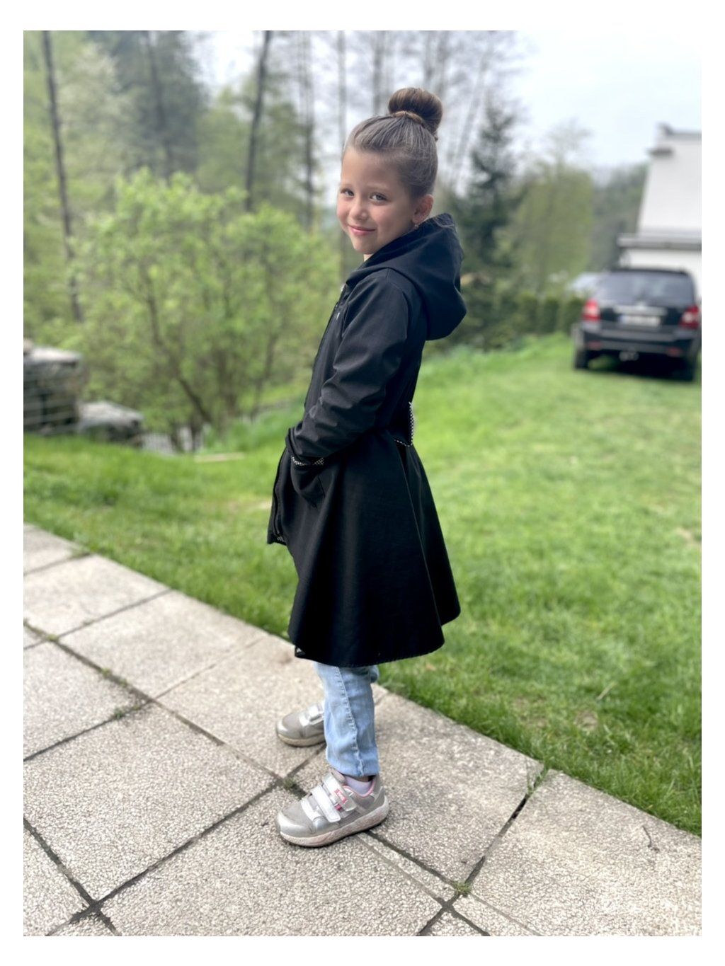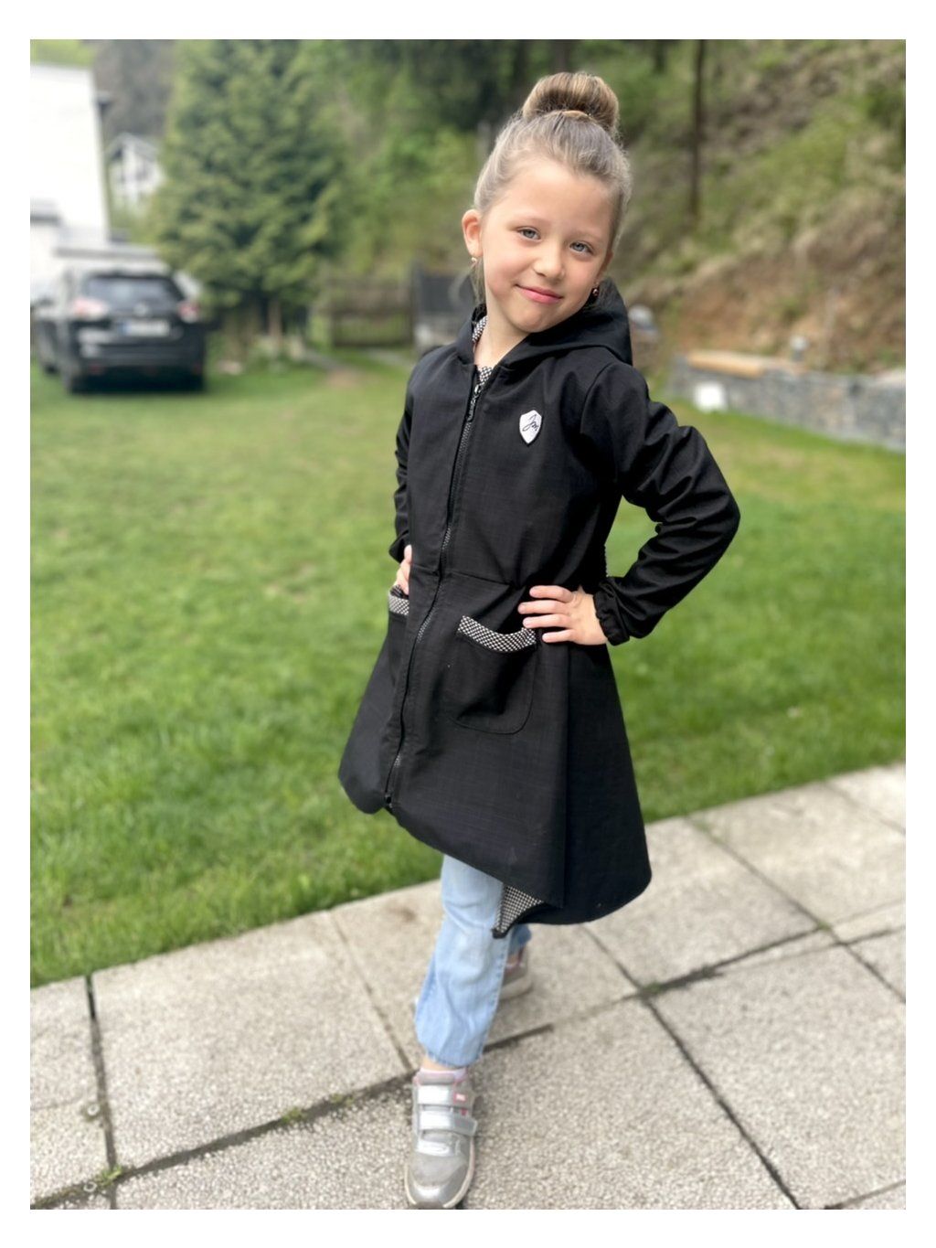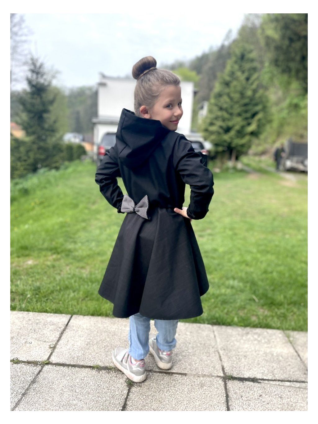 Má okrasnou nabíranou sukni a vzadu mašli. Vpředu je na zip do sportovnějšího stylu s roztomilými kapsami. Barva je černá se vzorkem. Kabátek se dá nosit na jaře, na podzim, s teplejšími vrstvami i v zimě.