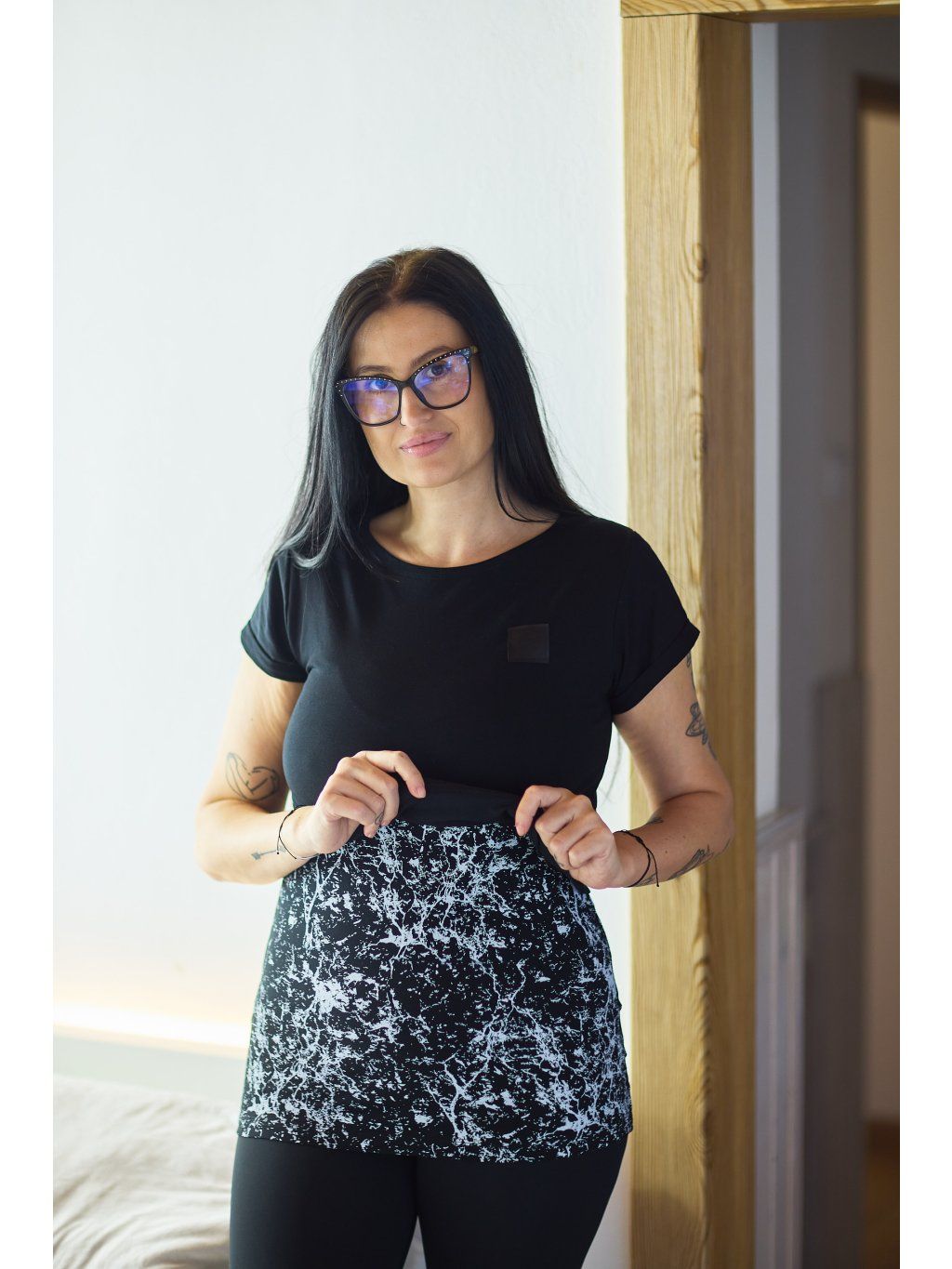 Kojící trička mají delší a pohodlný střih. Materiál je slabší úplet bavlna/elastan. Stačí odhrnout vrchní díl, pod kterým je hlubší výstřih, a vy tak můžete pohodlně a diskrétně nakojit. Horní díl je originálně střižený našikmo.