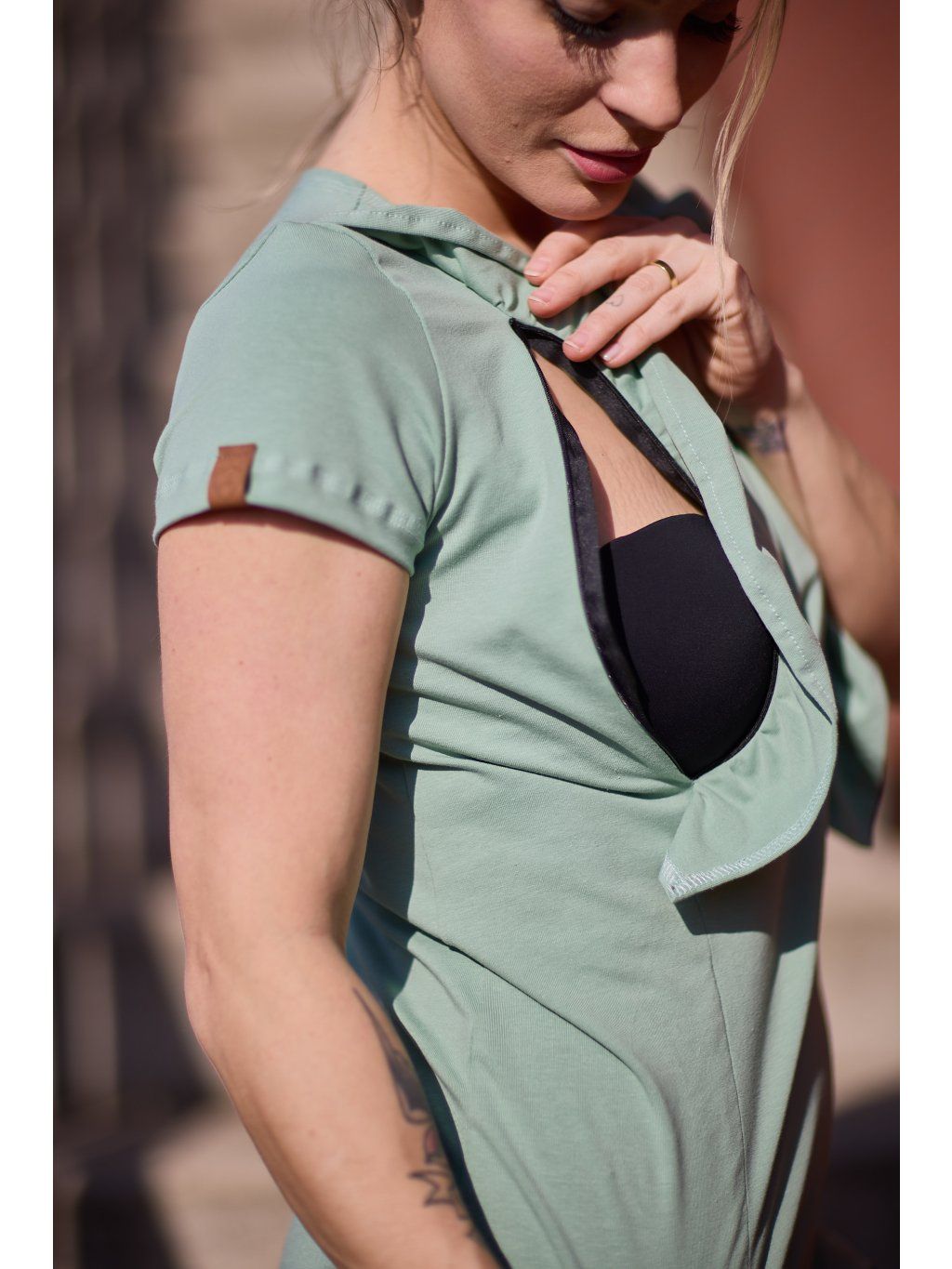 Tričko je ušité ze silnějšího mentolového bavlněného úpletu s elastanem. Přes prsa má skryté zipy, které jsou umístěné pod volánky. Skrz zipy můžete diskrétně nakojit. Tričko se dá krásně nosit, i když nekojíte :)