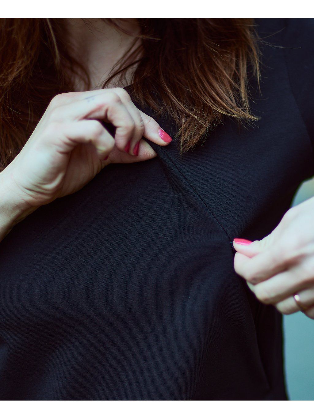 Tričko je ušité ze silnějšího černého bavlněného úpletu s elastanem. Přes prsa má skryté zipy, skrz které můžete diskrétně nakojit. Po stranách dole jsou dva rozparky. Tričko se dá krásně nosit, i když nekojíte :)
