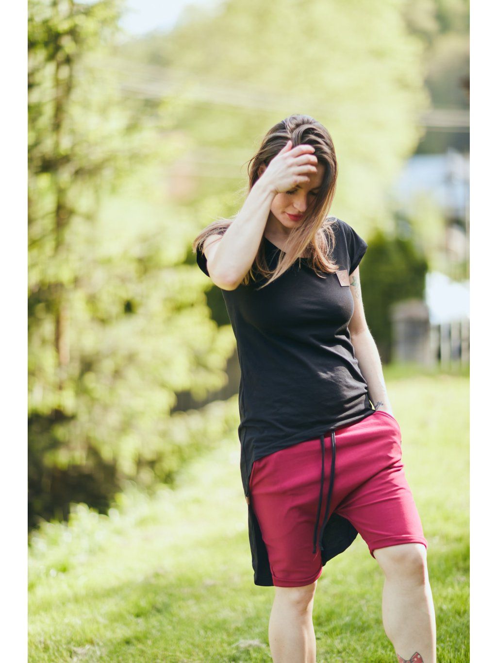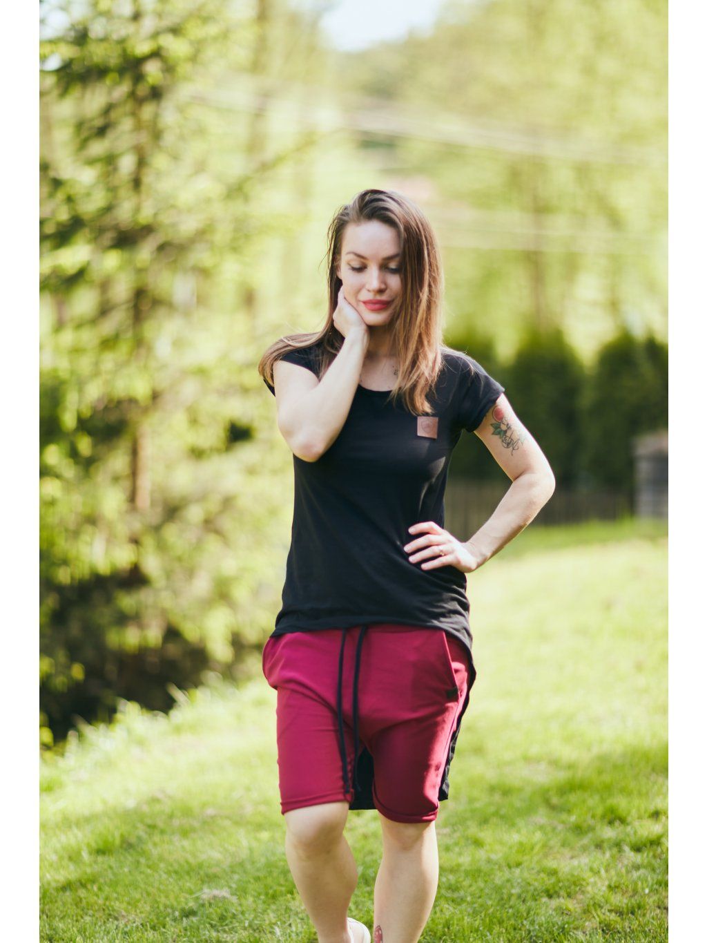 Kraťasy jsou z příjemné růžové teplákoviny. V pase jsou na gumu, mají černou úpletovou tkanici a vzadu dvě kapsy.