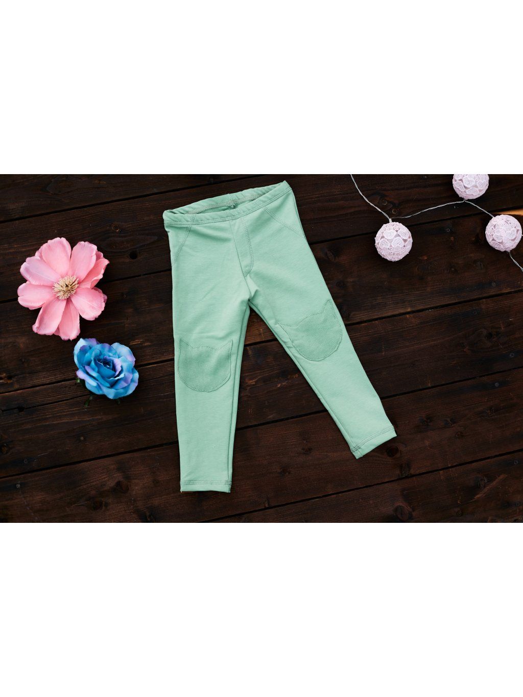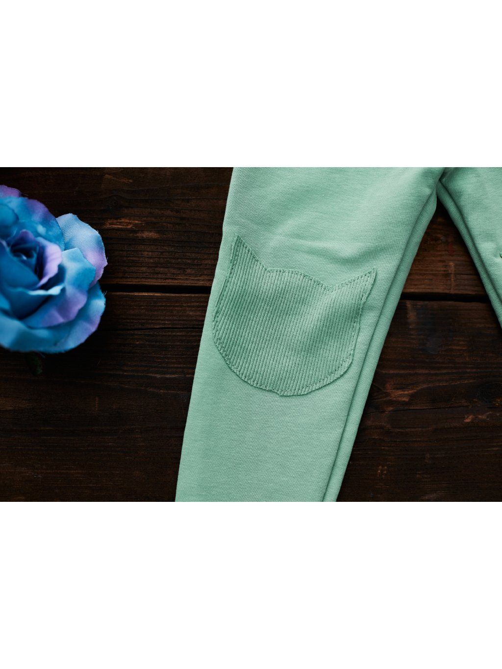 Legíny z příjemné teplákoviny s elastanem v mentolové barvě se záplatama v podobě kočičích hlav na kolenou.