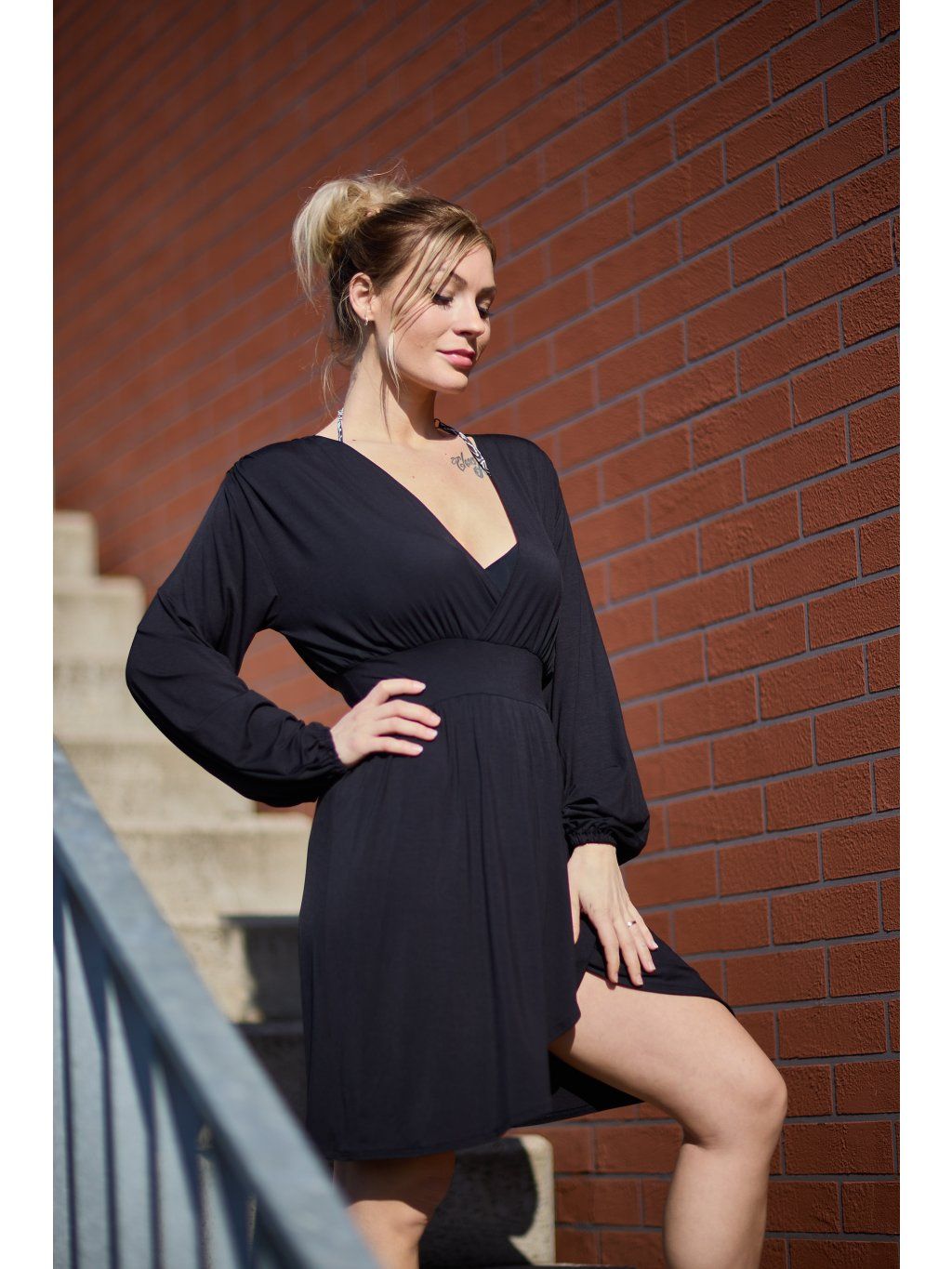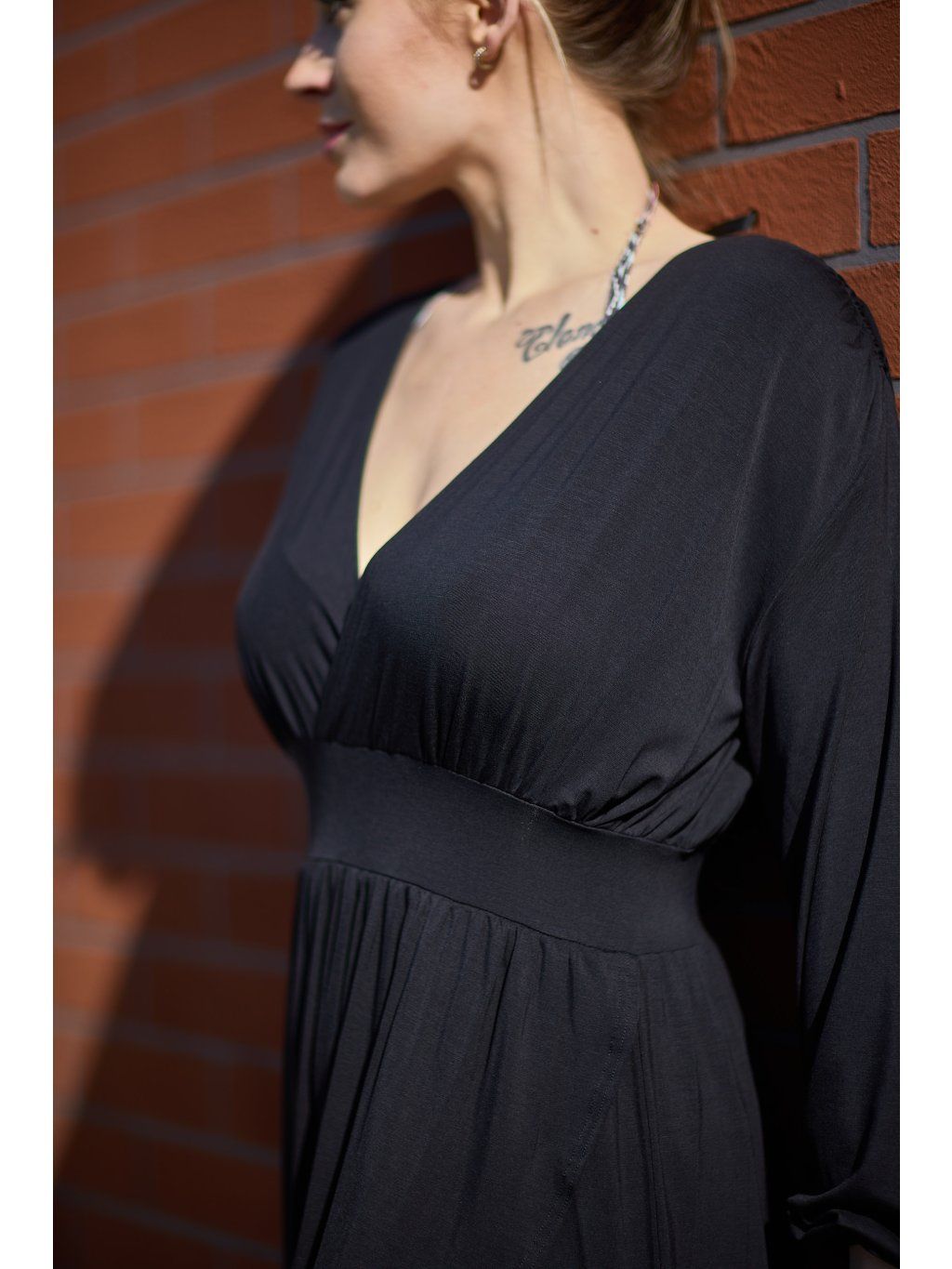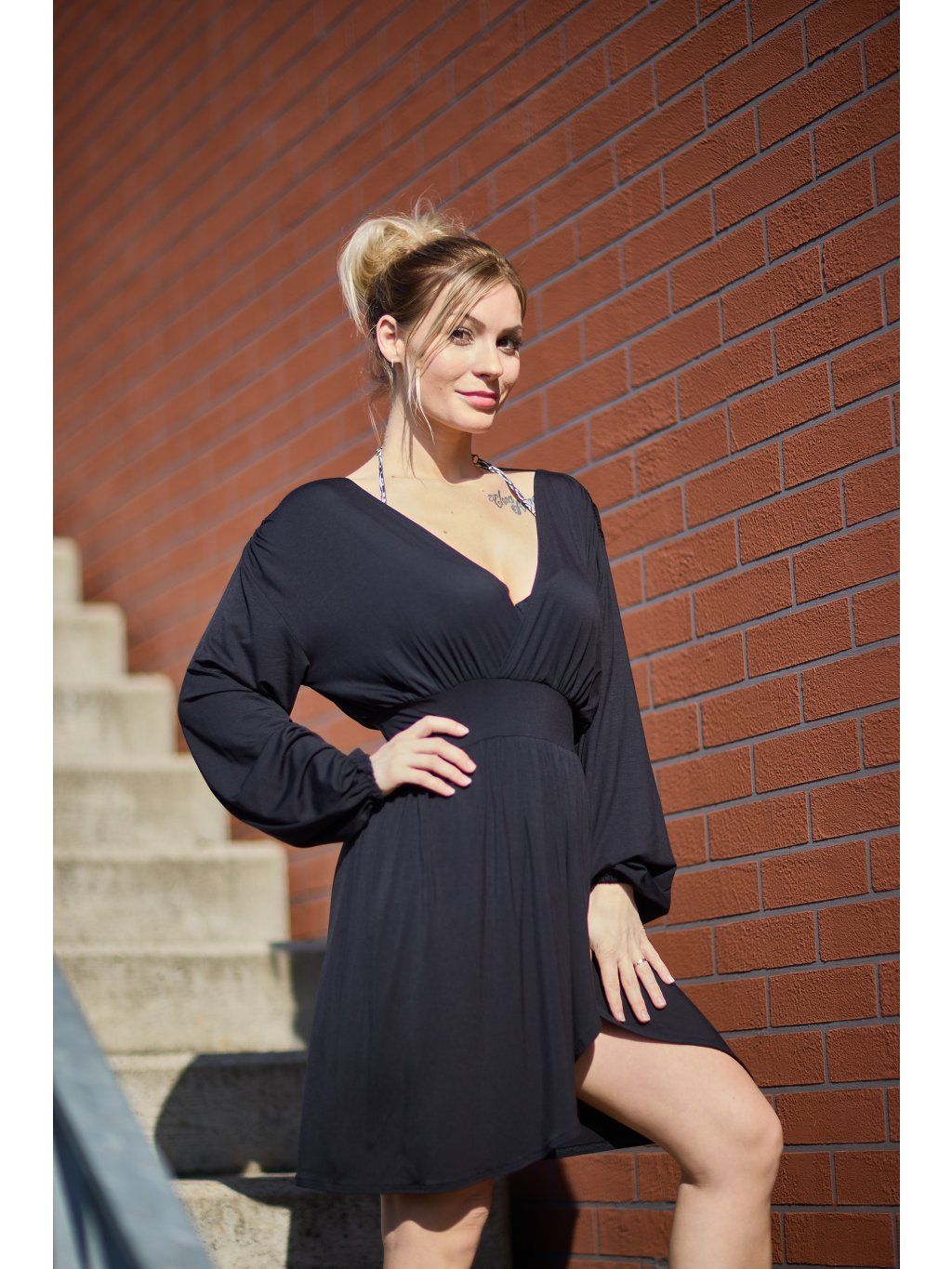 Přední díl je překřížený, vzadu mají hluboký výstřih do V. Rukávy jsou volné, stažené do gumičky. Na ramenou je řasení, kterým prochází černá saténová stužka k zavázání za krkem.Sukně je vpředu překřížená astřižena dokulata. V pase jsou stažené páskem ze stejného materiálu. Šaty jsou z našeho oblíbeného letního materiálu, jsou maximálně pohodlné a sexy. Hodí se na různé společenské příležitosti, ale i na běžné nošení. Určitě si je zamilujete.