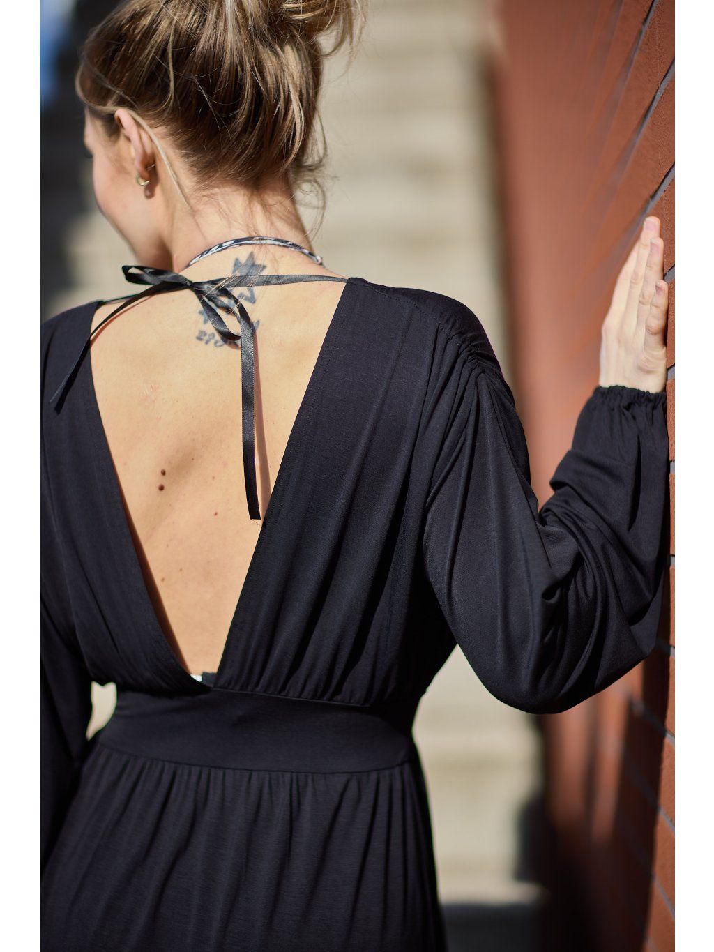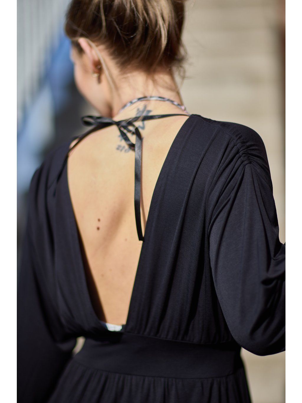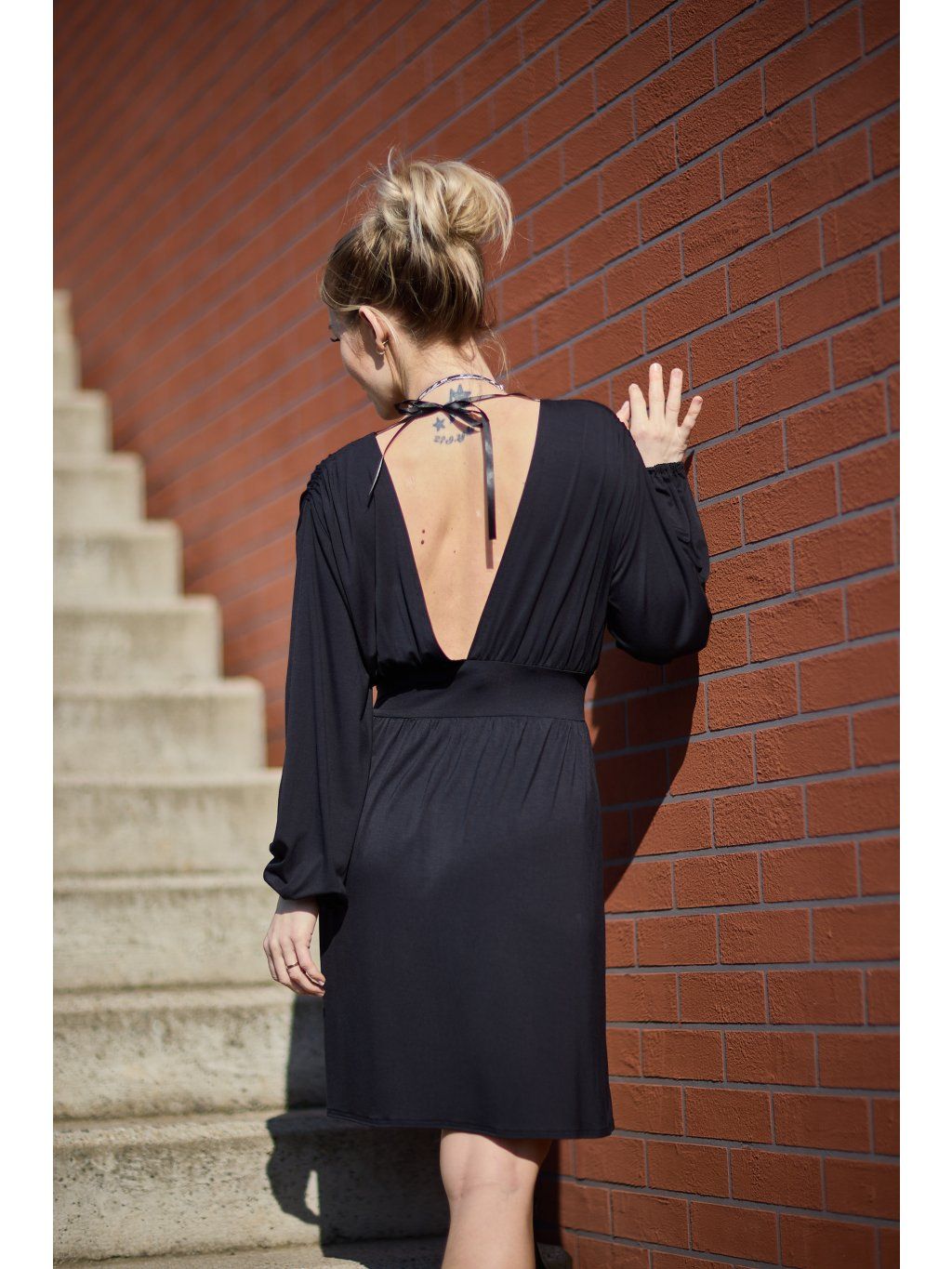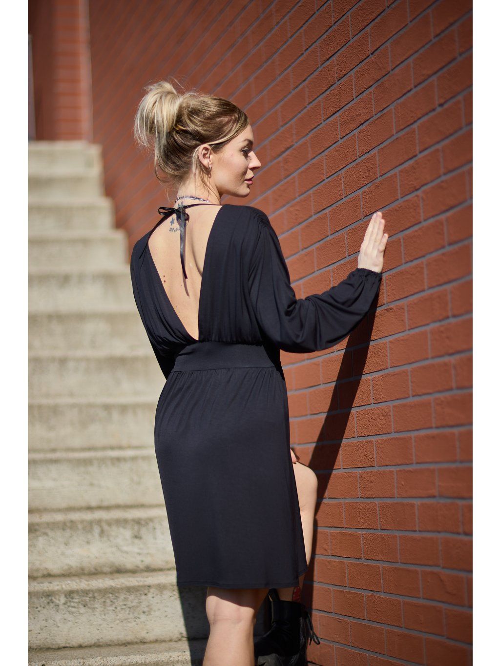 Přední díl je překřížený, vzadu mají hluboký výstřih do V. Rukávy jsou volné, stažené do gumičky. Na ramenou je řasení, kterým prochází černá saténová stužka k zavázání za krkem.Sukně je vpředu překřížená astřižena dokulata. V pase jsou stažené páskem ze stejného materiálu. Šaty jsou z našeho oblíbeného letního materiálu, jsou maximálně pohodlné a sexy. Hodí se na různé společenské příležitosti, ale i na běžné nošení. Určitě si je zamilujete.