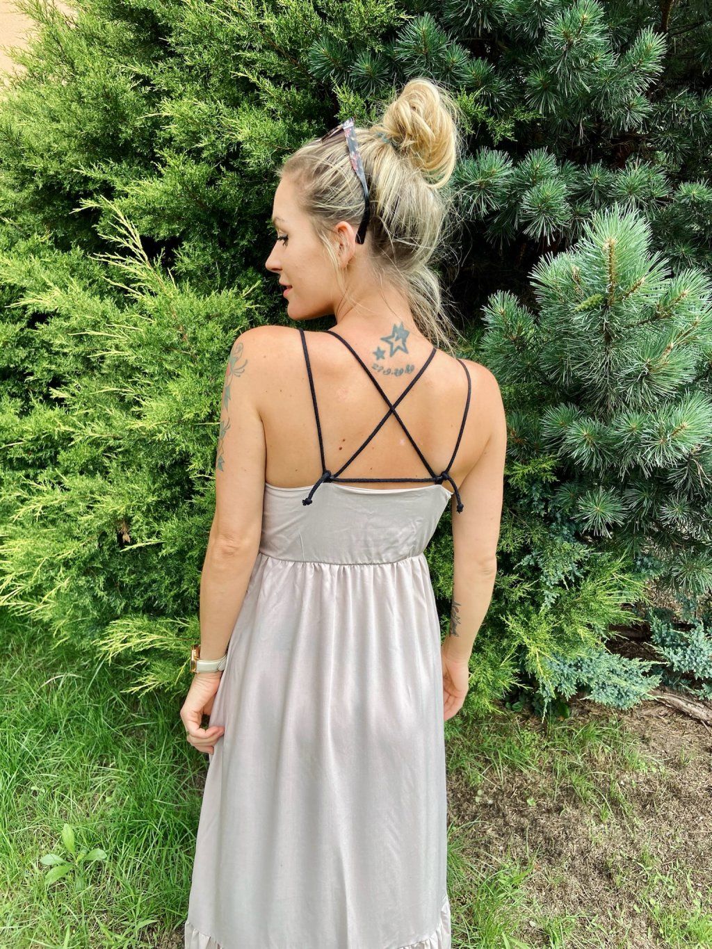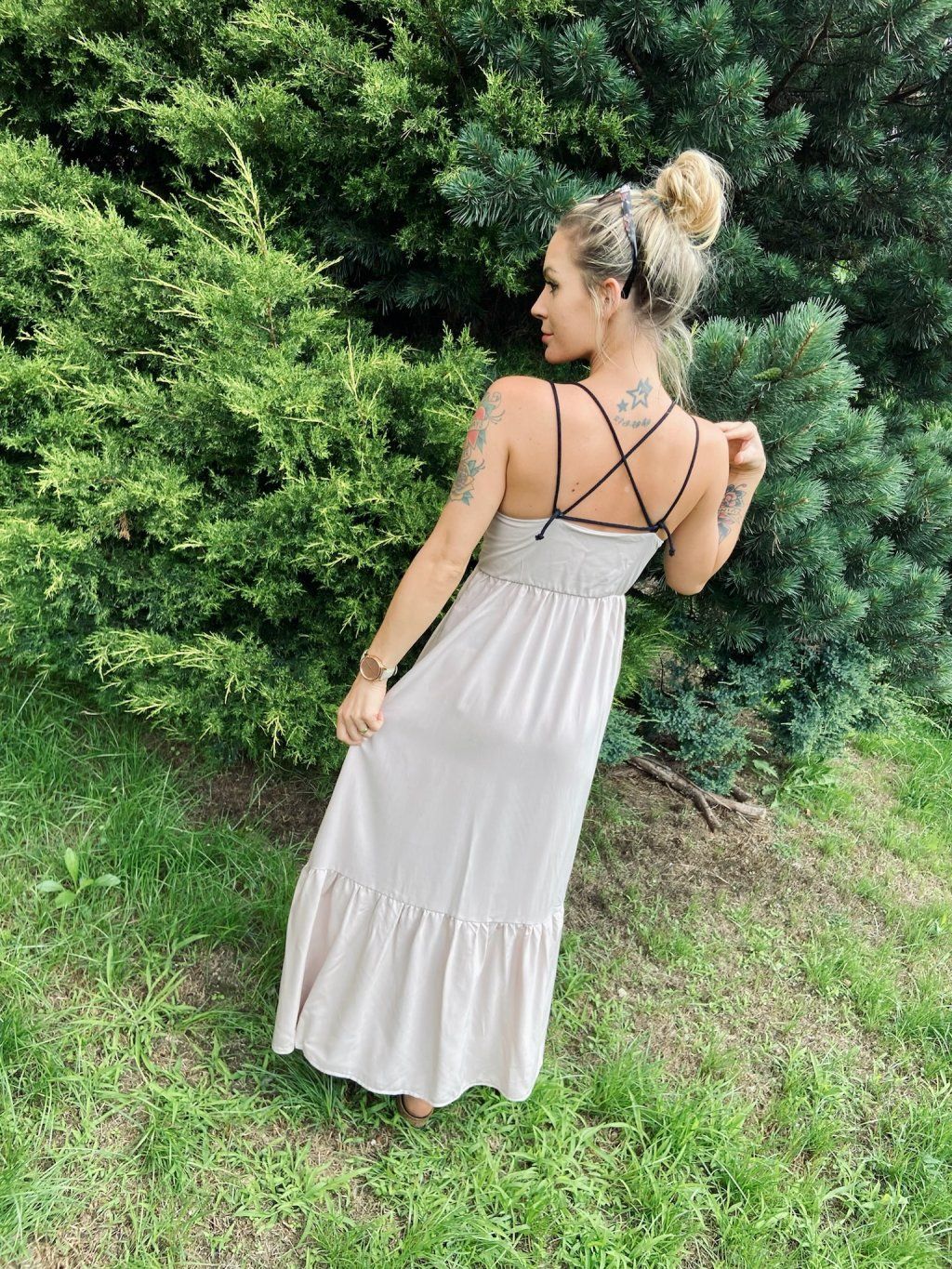 Šaty jsou volné ve střihu MAXI s nastavitelnými ramínky na zavazování, tedy budou sedět na každé postavě. Délka zakončena bohatým volanem.